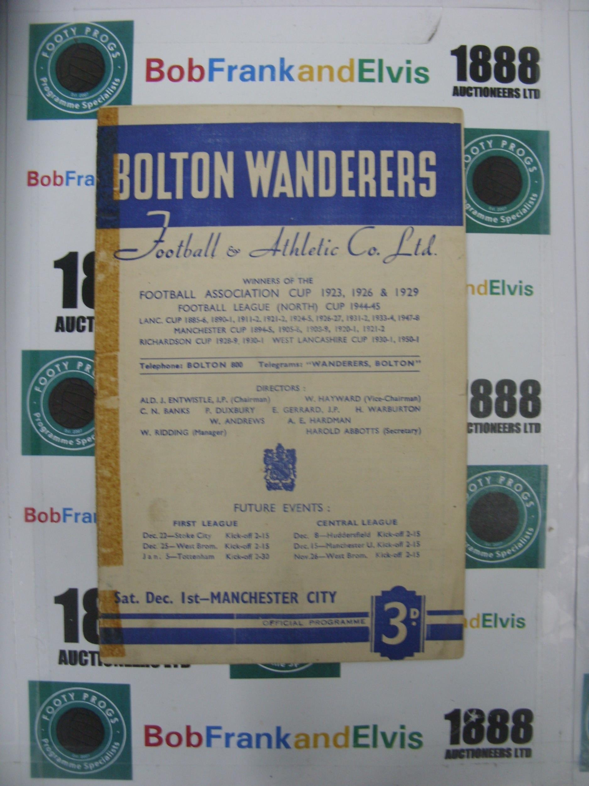 BOLTON WANDERERS, 1951/1952, a football programme from the game versus Manchester City, played on 01/12/1951 (Sellotape mark on split spine, folded).