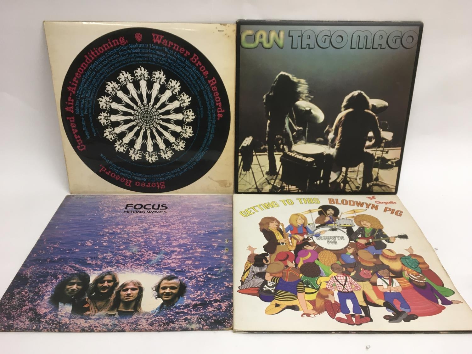 Four prog rock LPs comprising 'Tago Mago' by Can in textured cruciform sleeve, 'Air Conditioning' by Curved Air, 'Moving Waves' by Focus and 'Getting To This' by Blodwyn Pig.