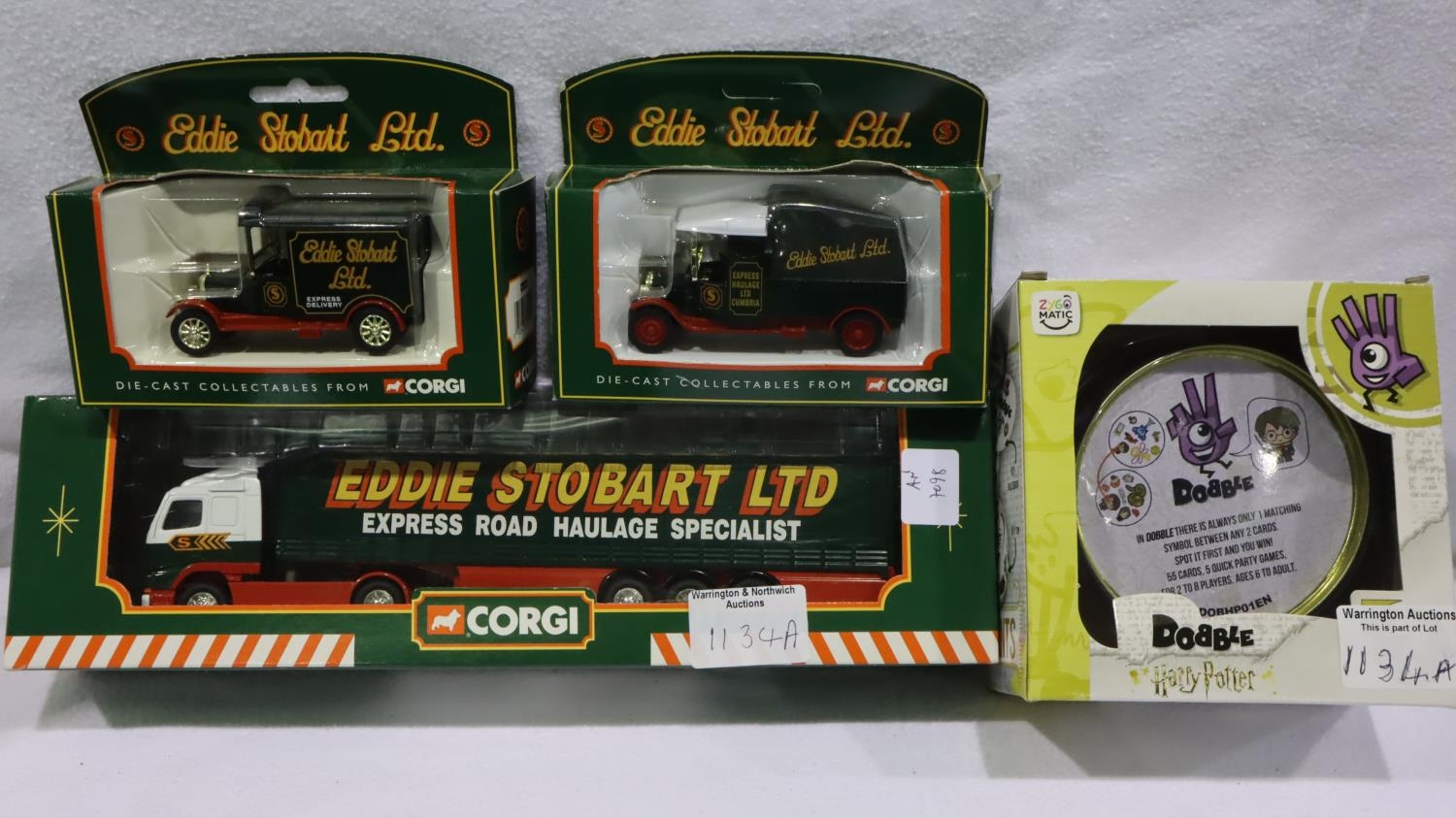 Three Eddie Stobart boxed vehicles and a Harry Potter Dobble toy. Not available for in-house P&P, contact Paul O'Hea at Mailboxes on 01925 659133