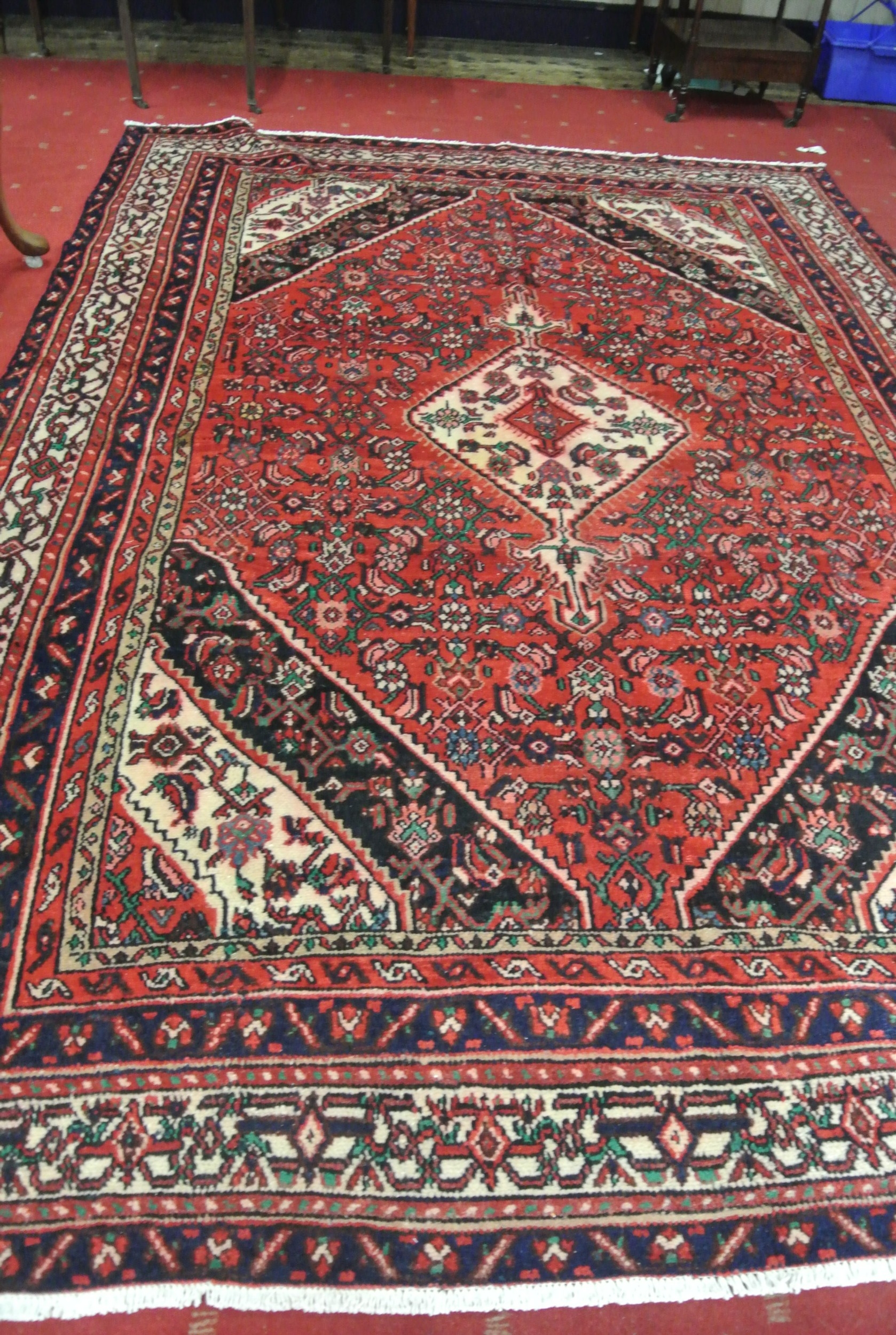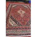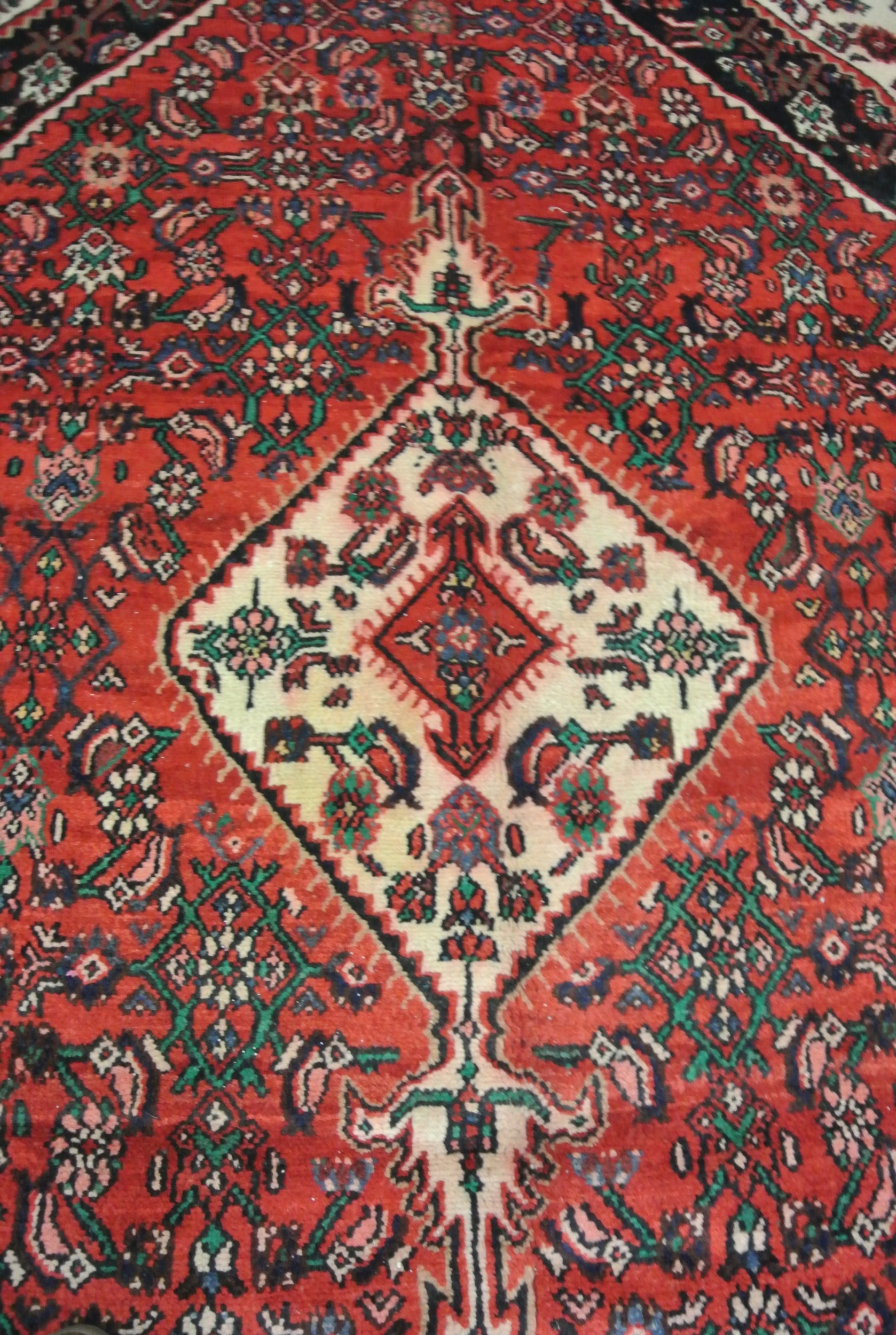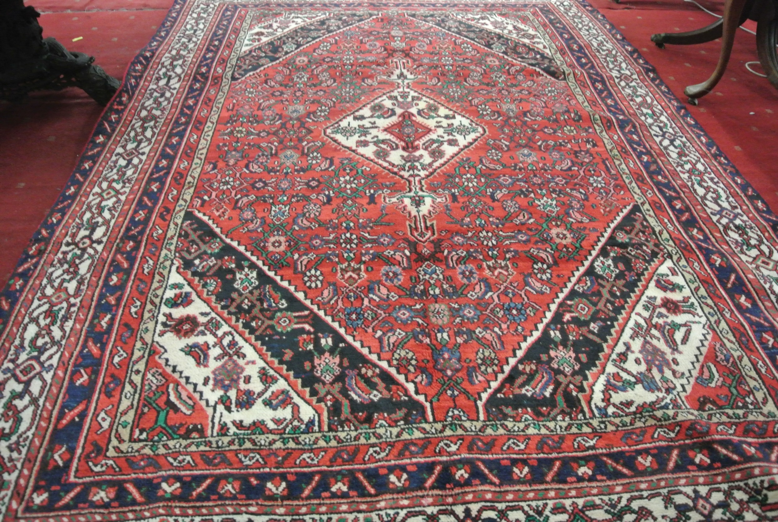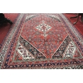 Full pile hand woven Persian Sarouk carpet with geometrical medallion design, 340x240cm