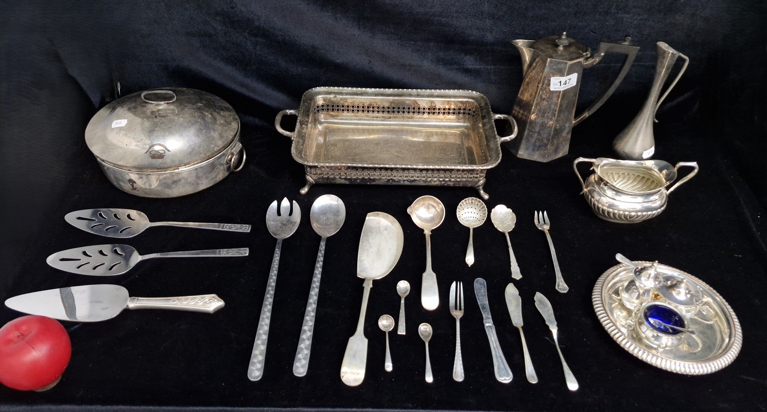 A group of assorted vintage and antique silverplated items including an Art Deco coffee pot with Bakelite handle, sugar bowl, a footed tray with pierced gallery, a cruet set and a serving tureen.