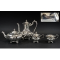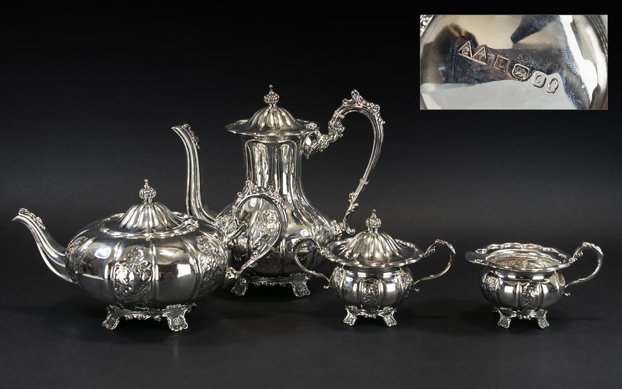 Elizabeth ll Sterling Silver Large and Impressive Four Piece Coffee and Tea Service of excellent design and proportions; hand crafted by Master Silversmiths in the 25th Year of the Reign of Queen Elizabeth ll; all pieces in superb mint condition, hallmarked Birmingham 1977, the set comprises 1/ Large Coffee Pot, 10 inches (25cms) high, 2/ Large Tea Pot, 7 inches (17.5cms) high x 12 inches (30cms) long, 3/ Twin Handled Sugar Bowl and Cover, 7.5 inches (18.75cms) long, 4/ Cream/ Milk Jug, 4 inches (10cms) high; All pieces are first quality, mint condition and never used, confirm with photo; Expensive retail set at a low estimate