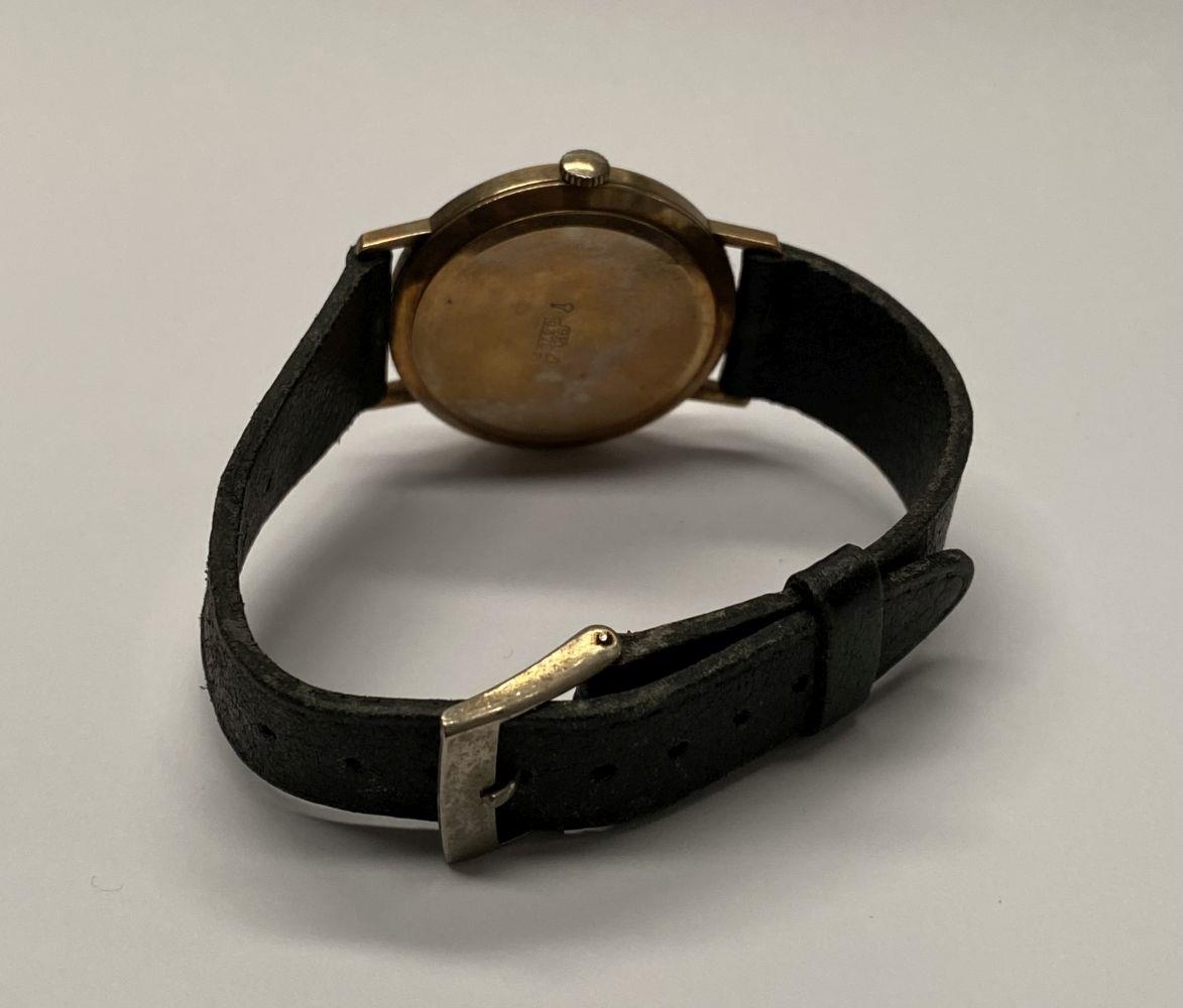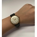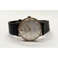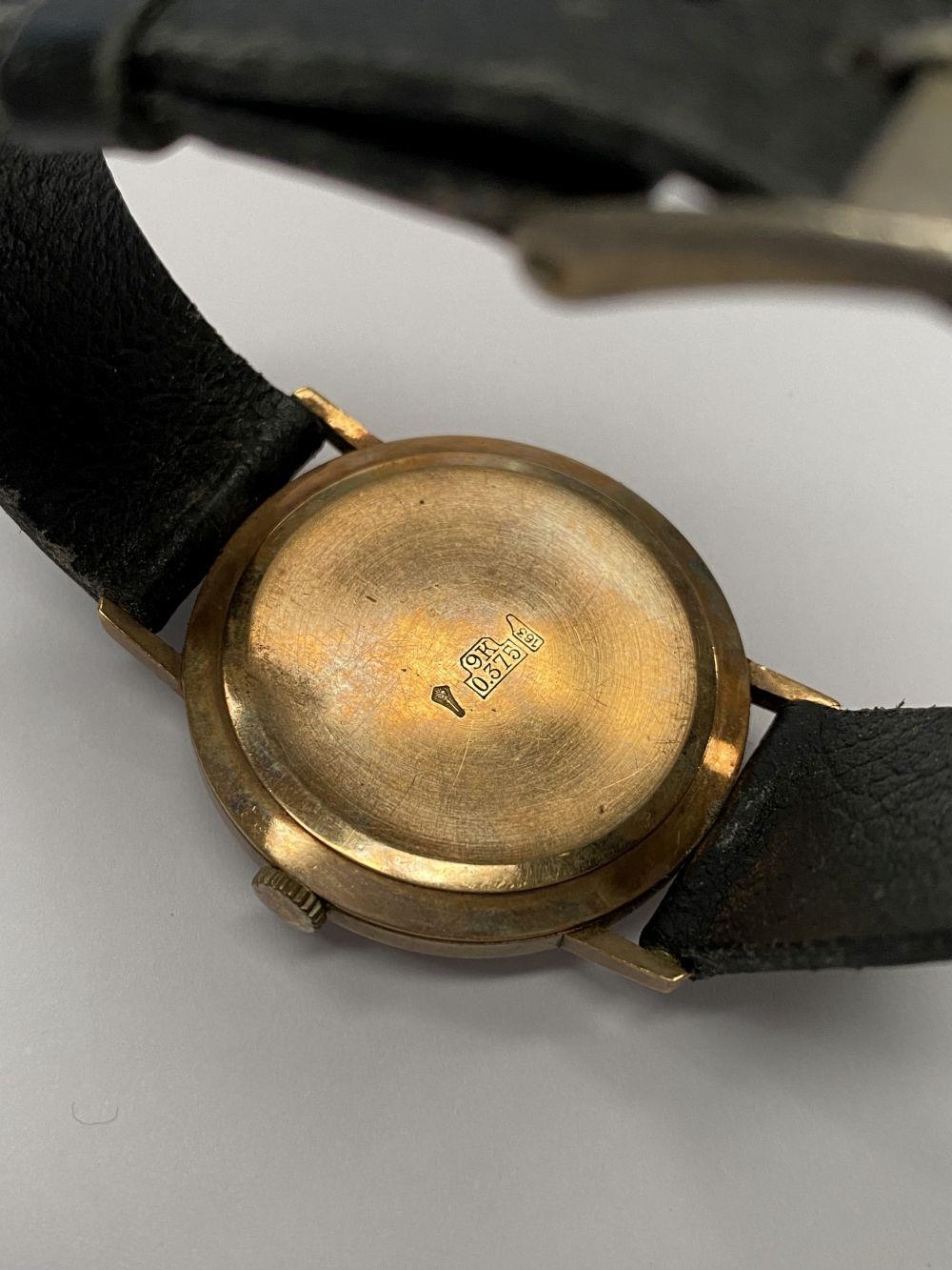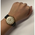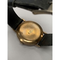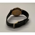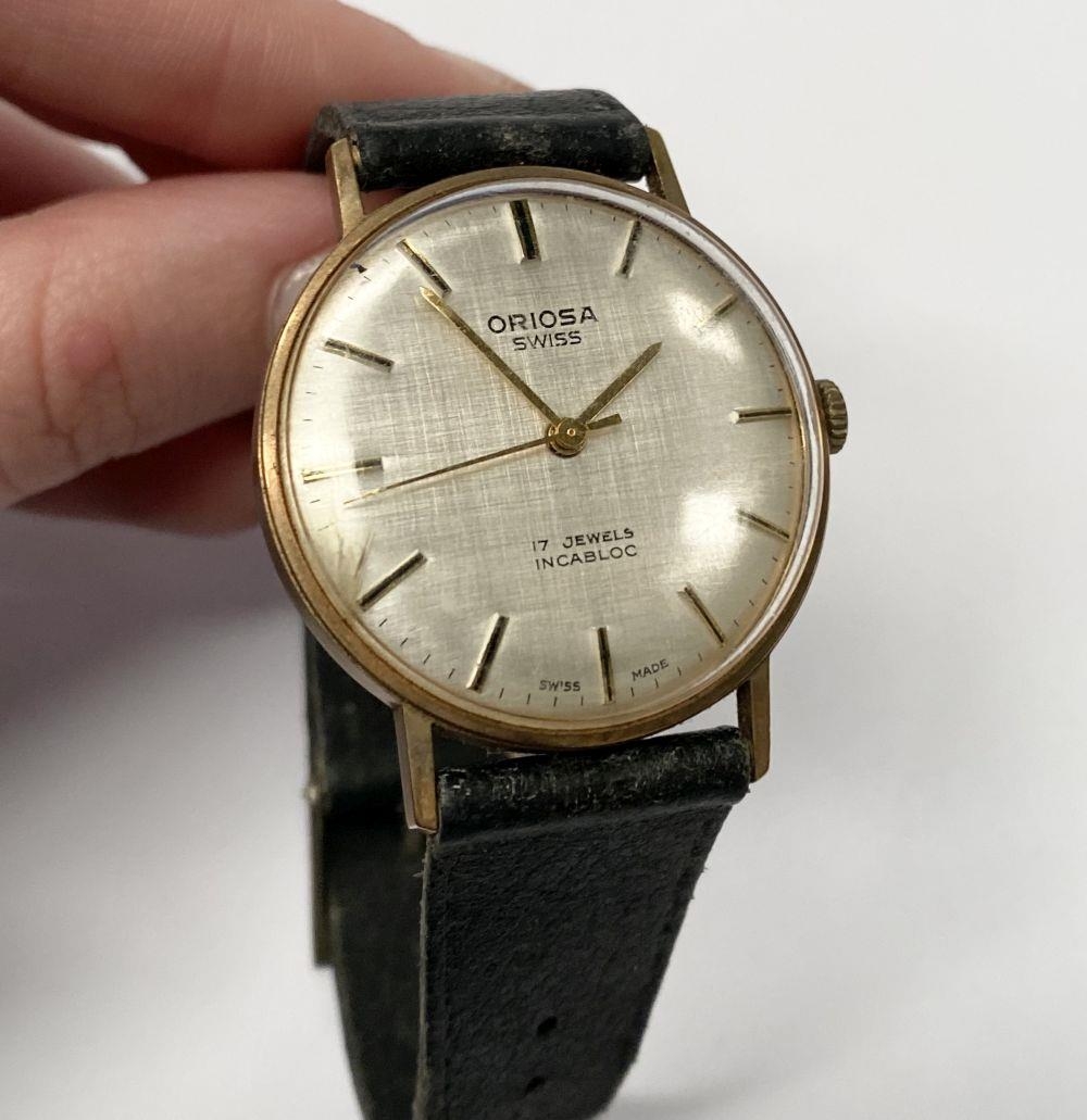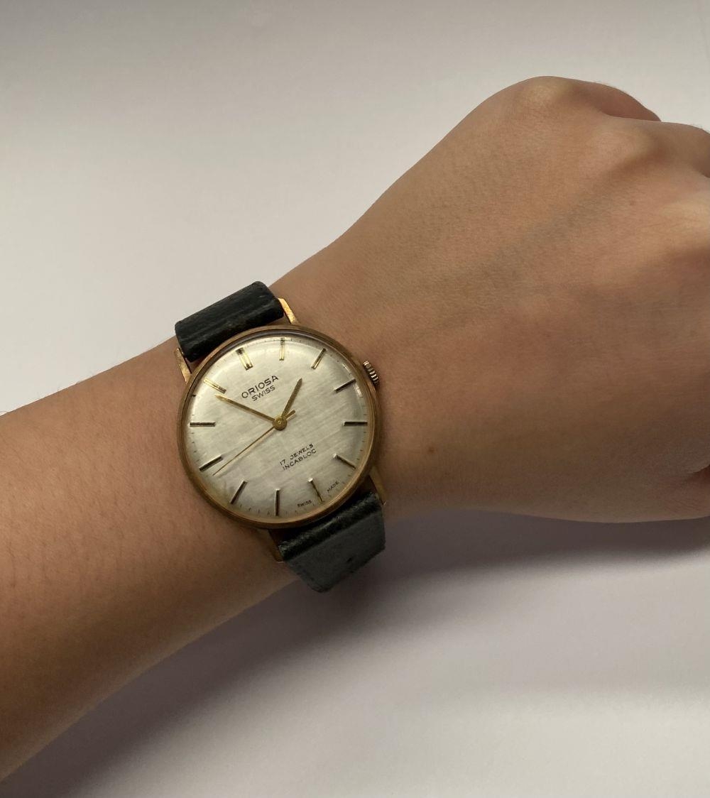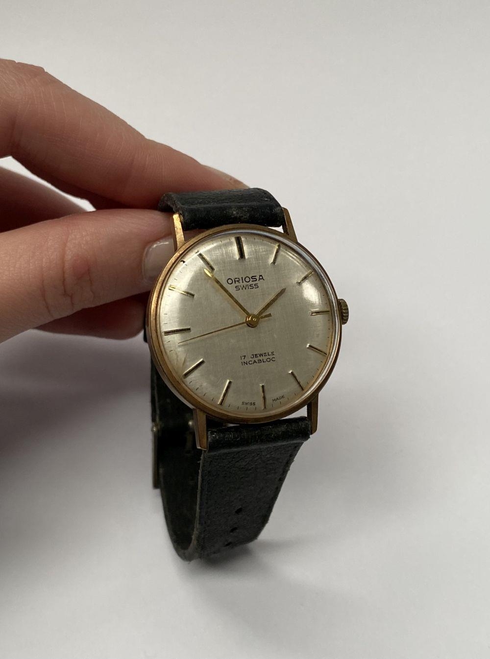 A VINTAGE ORIOSA SWISS 17 JEWELS INCABLOC LADIES WRISTWATCH, with circular dial in 9ct yellow gold case, the back marked 9k, with black leather strap.