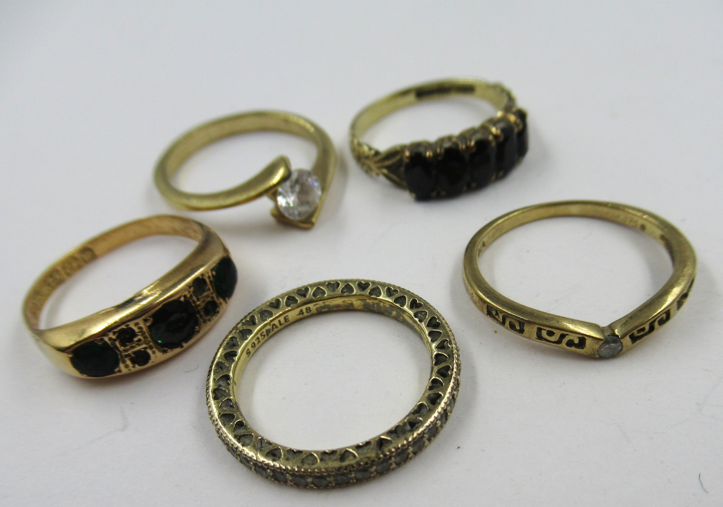 15ct Gold ring, together with a small diamond 9ct gold ring, 9ct gold and dark blue stone ring, silver eternity ring and another brass ring