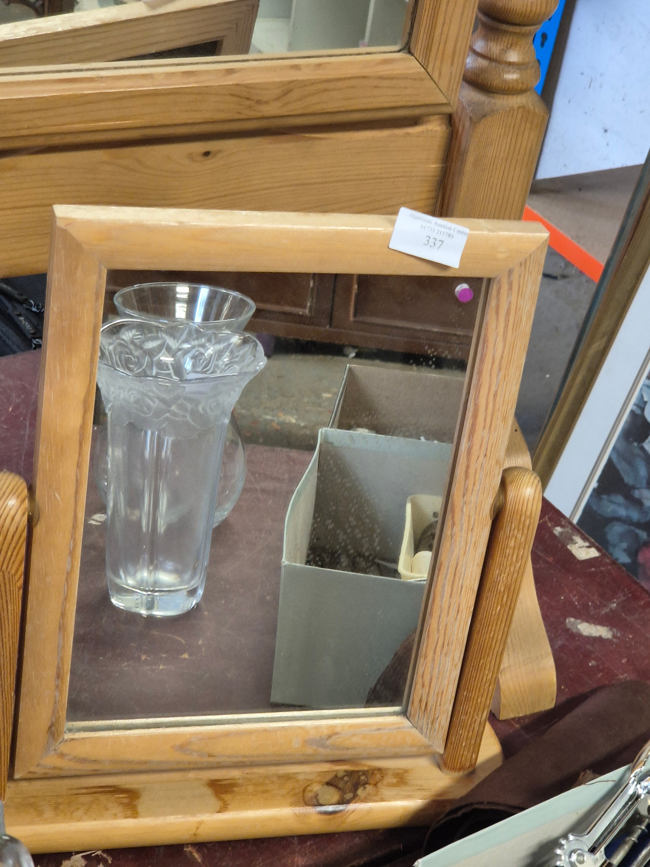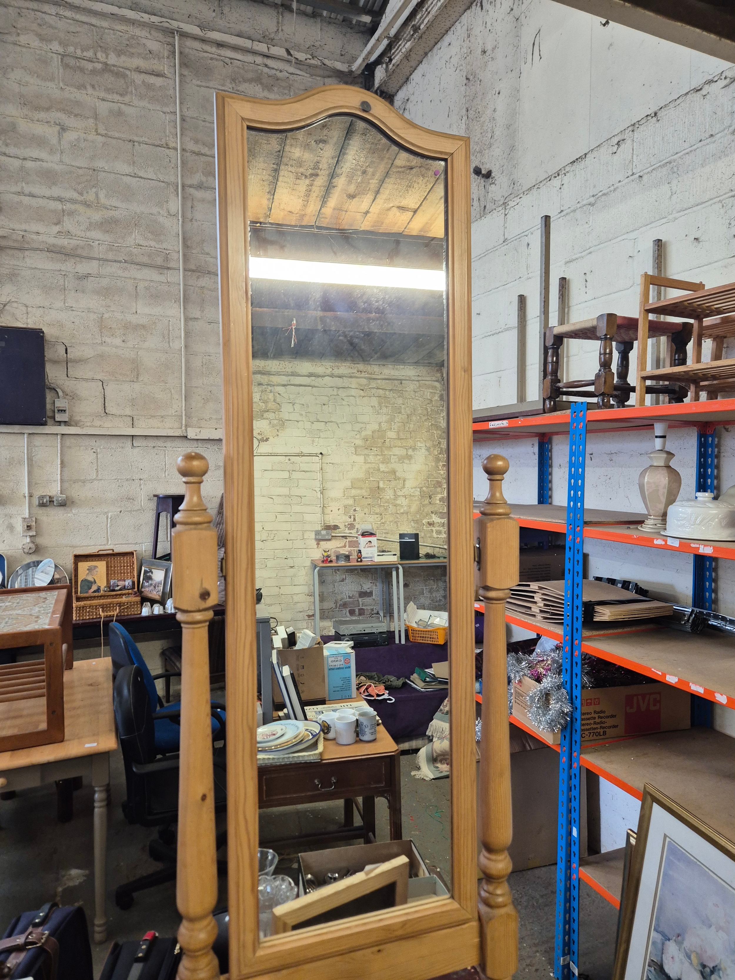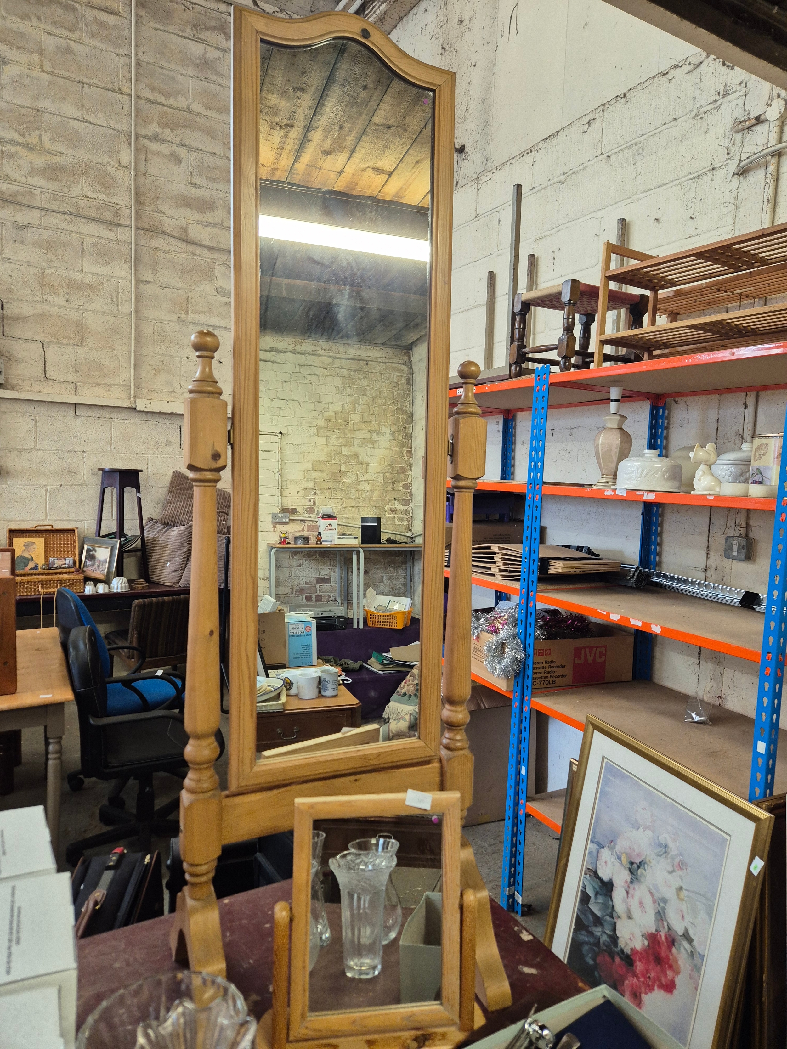 A tall pine cheval mirror plus a smaller matching dressing table mirror