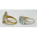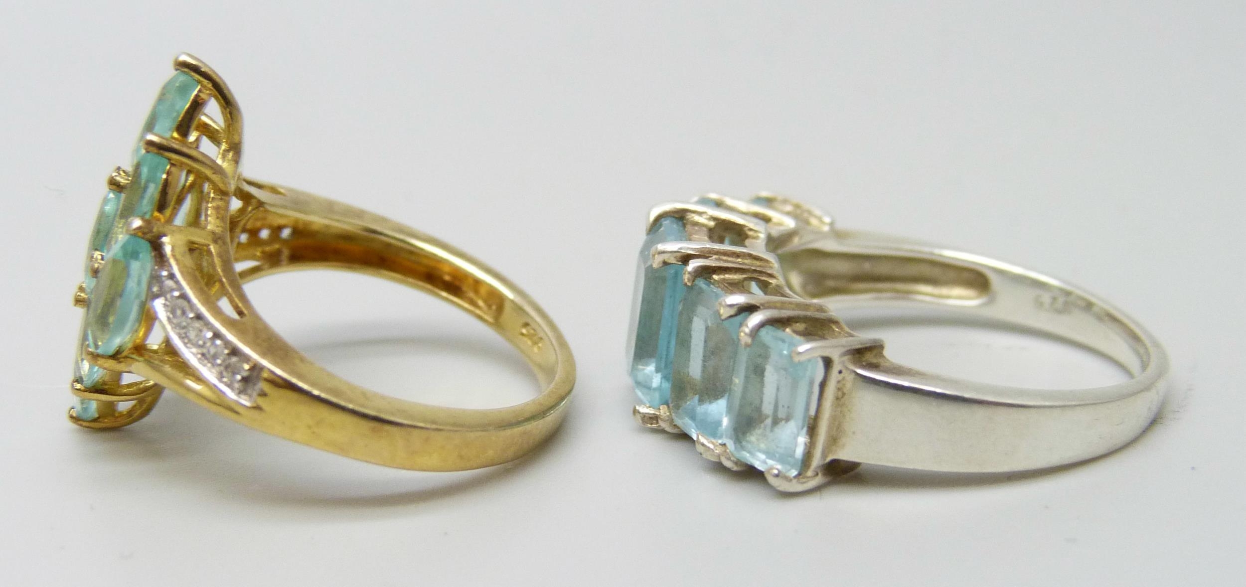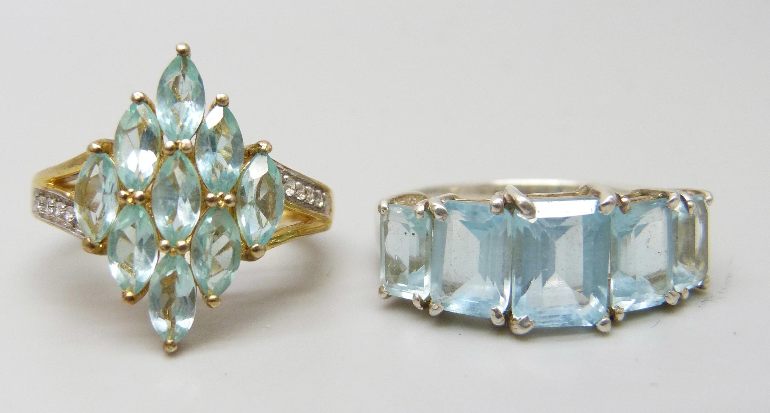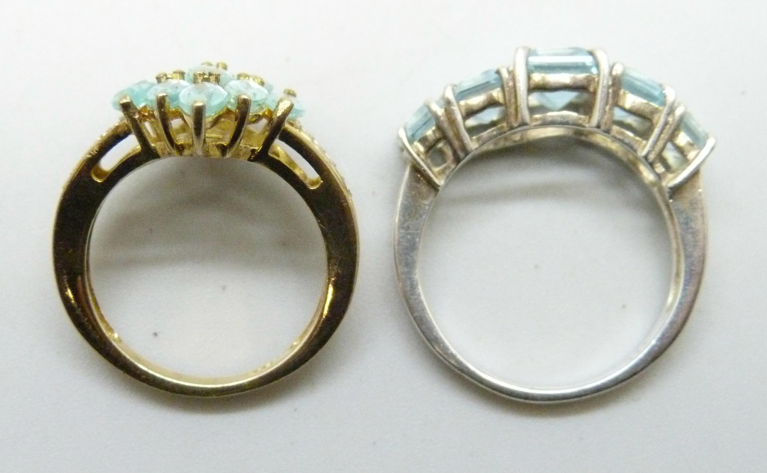 Two silver gilt rings set with blue stones, the cluster ring size L, the other size O/P