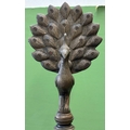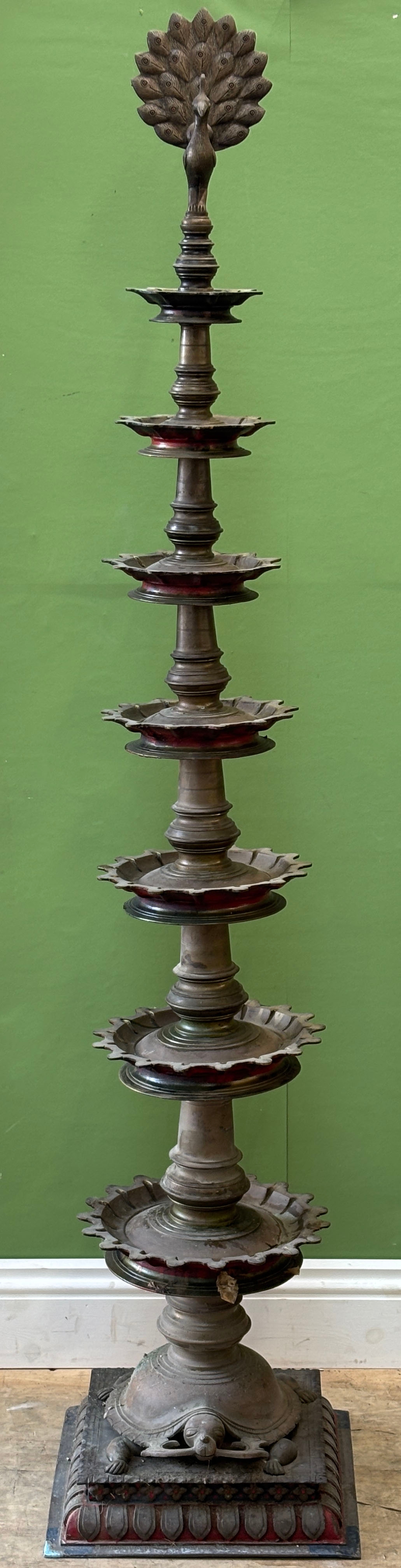 A seven tier Indian brass Deepam with tortoise base, surmounted by a peacock 170cmH