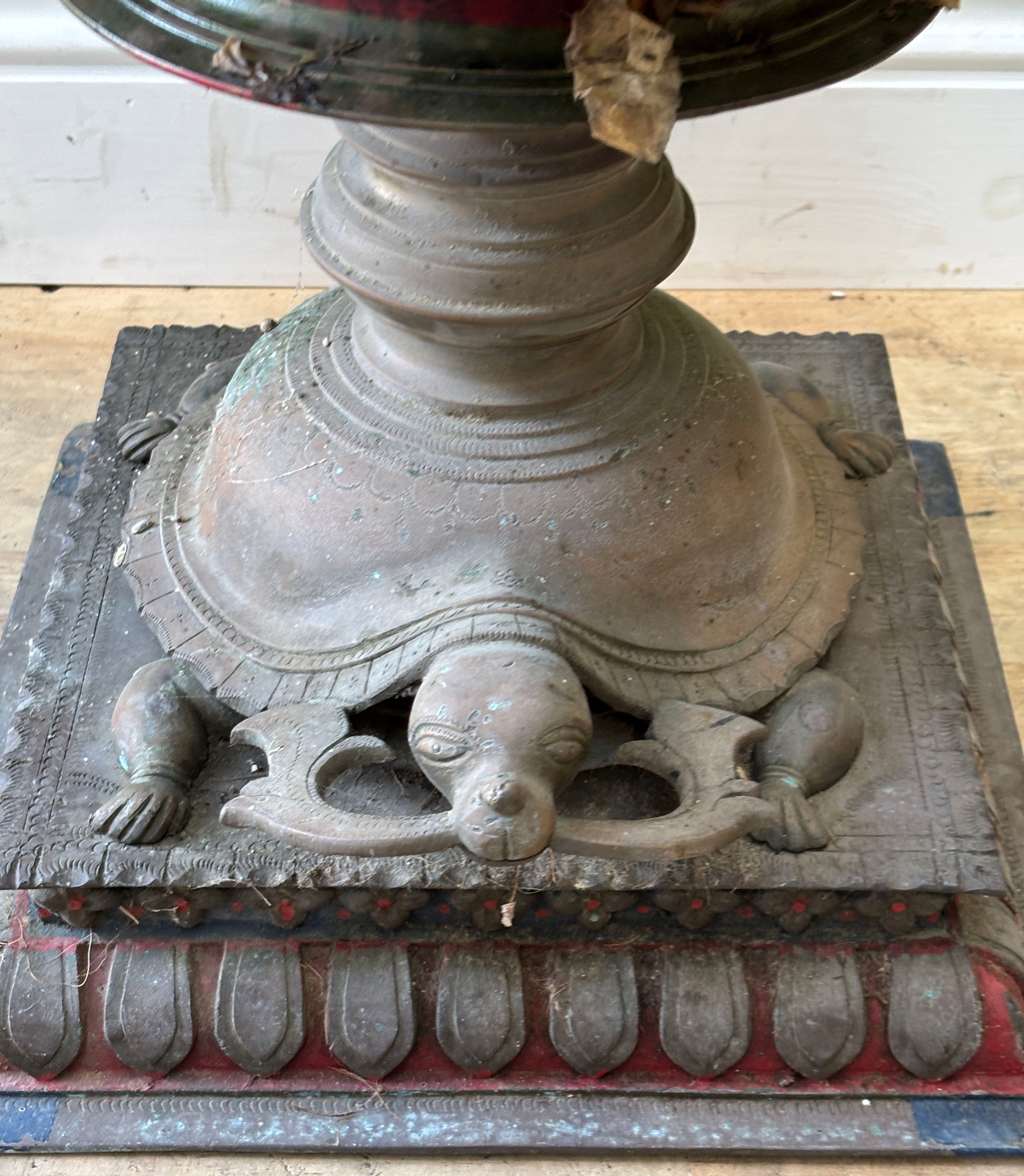 A seven tier Indian brass Deepam with tortoise base, surmoun...