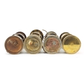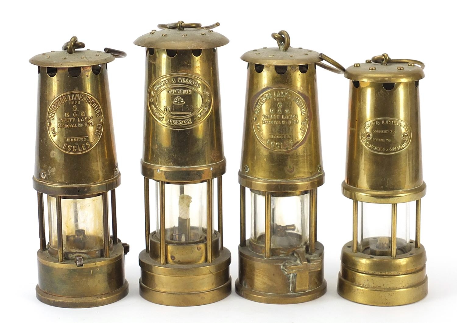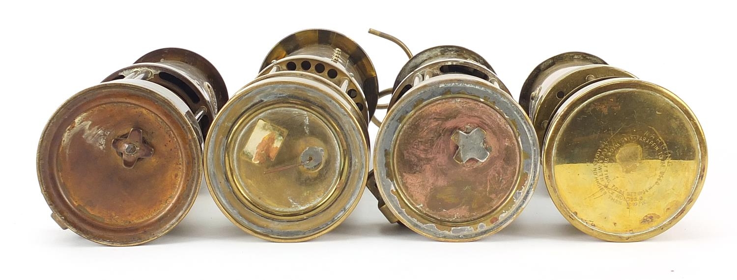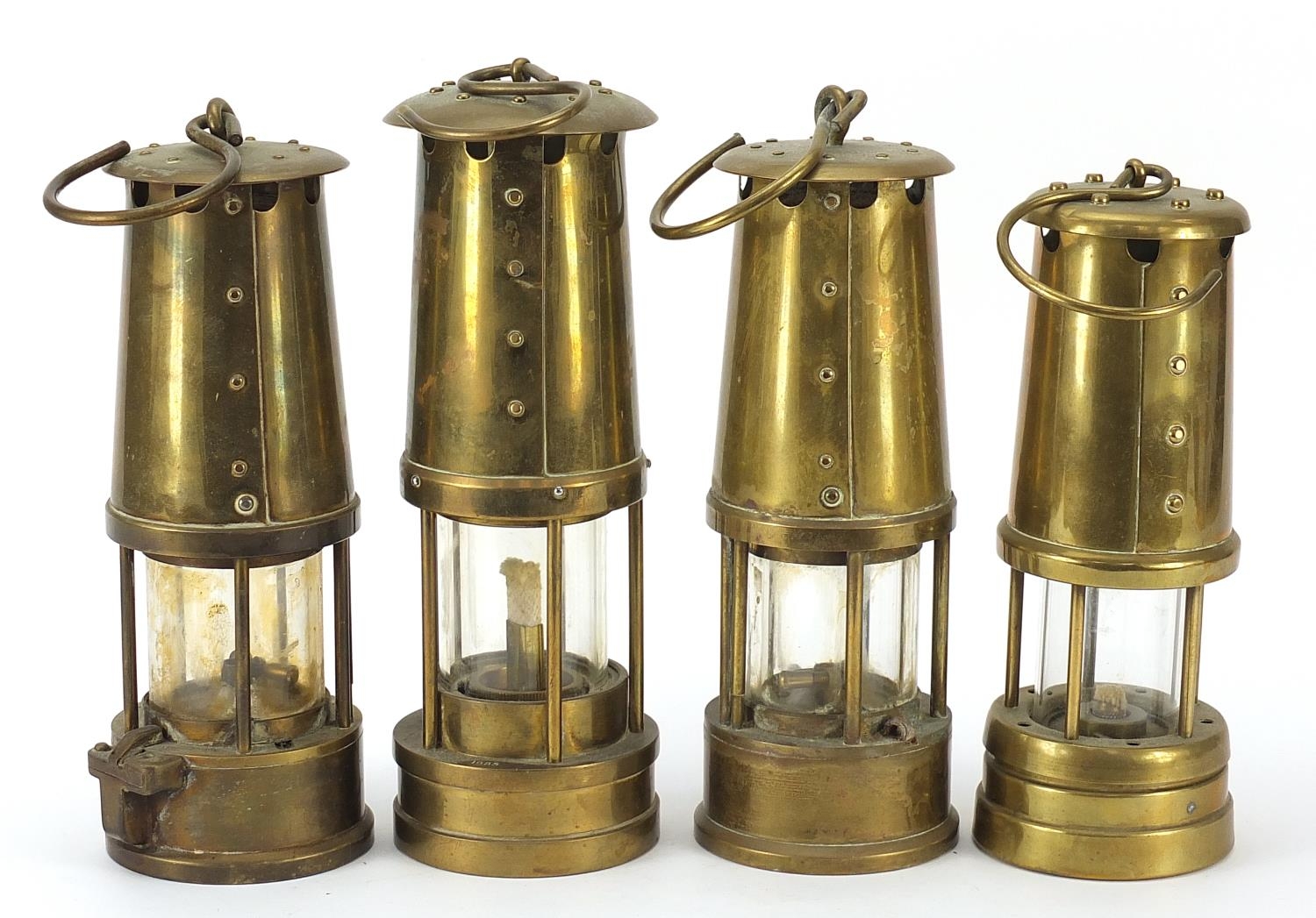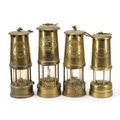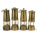 Four vintage brass miner's lamps including Hockley, Eccles and E Thomas & Williams, the largest 25cm high