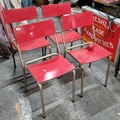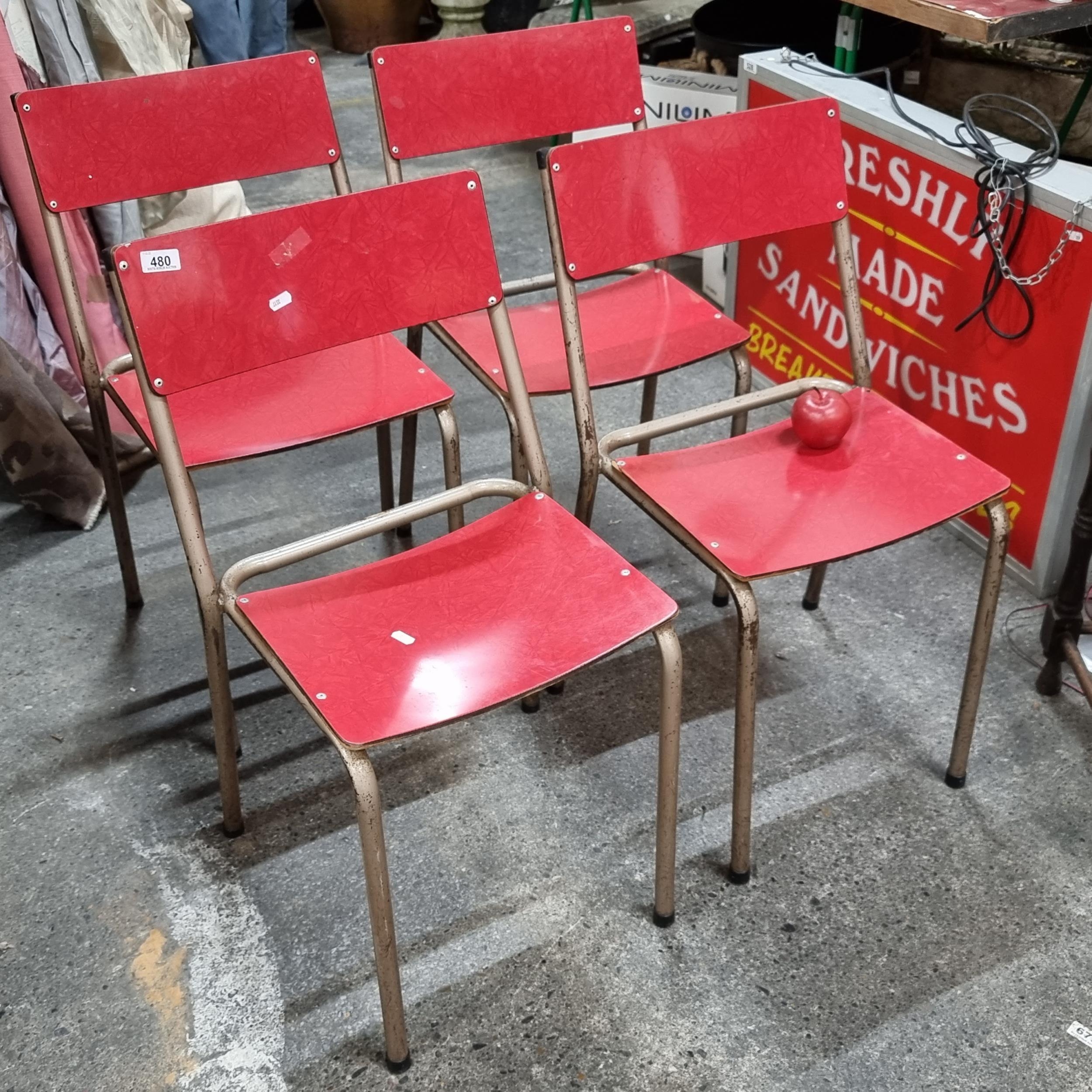 A set of 4 vintage bistro chair with melamine seat and backrest and a tubular metal frame. Stackable for easy storage.