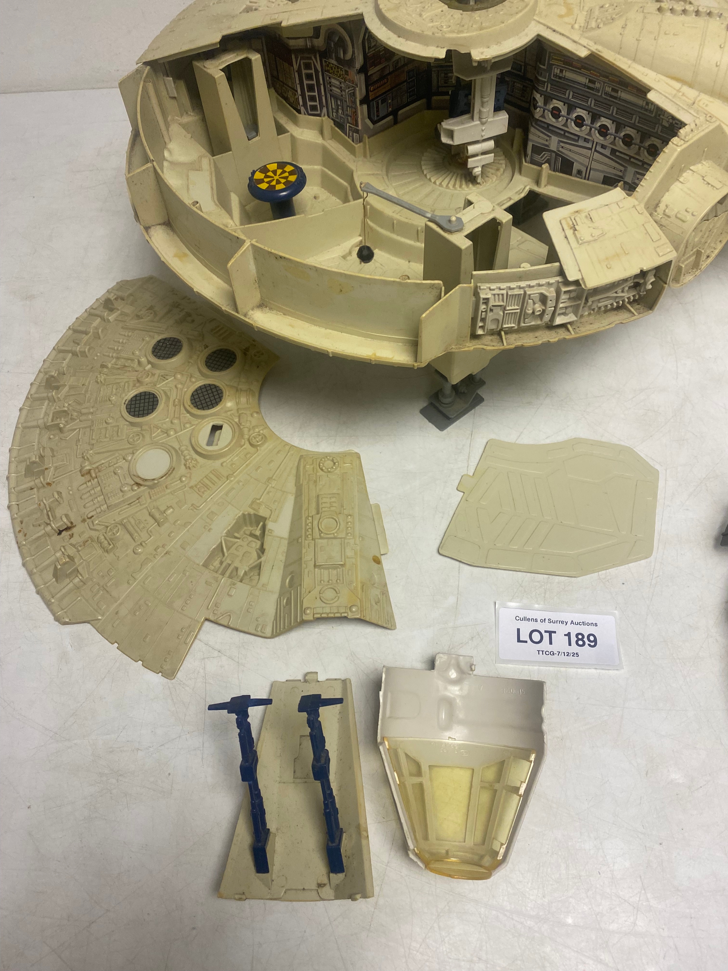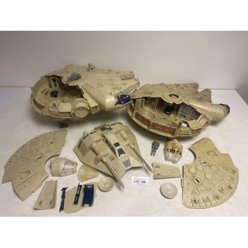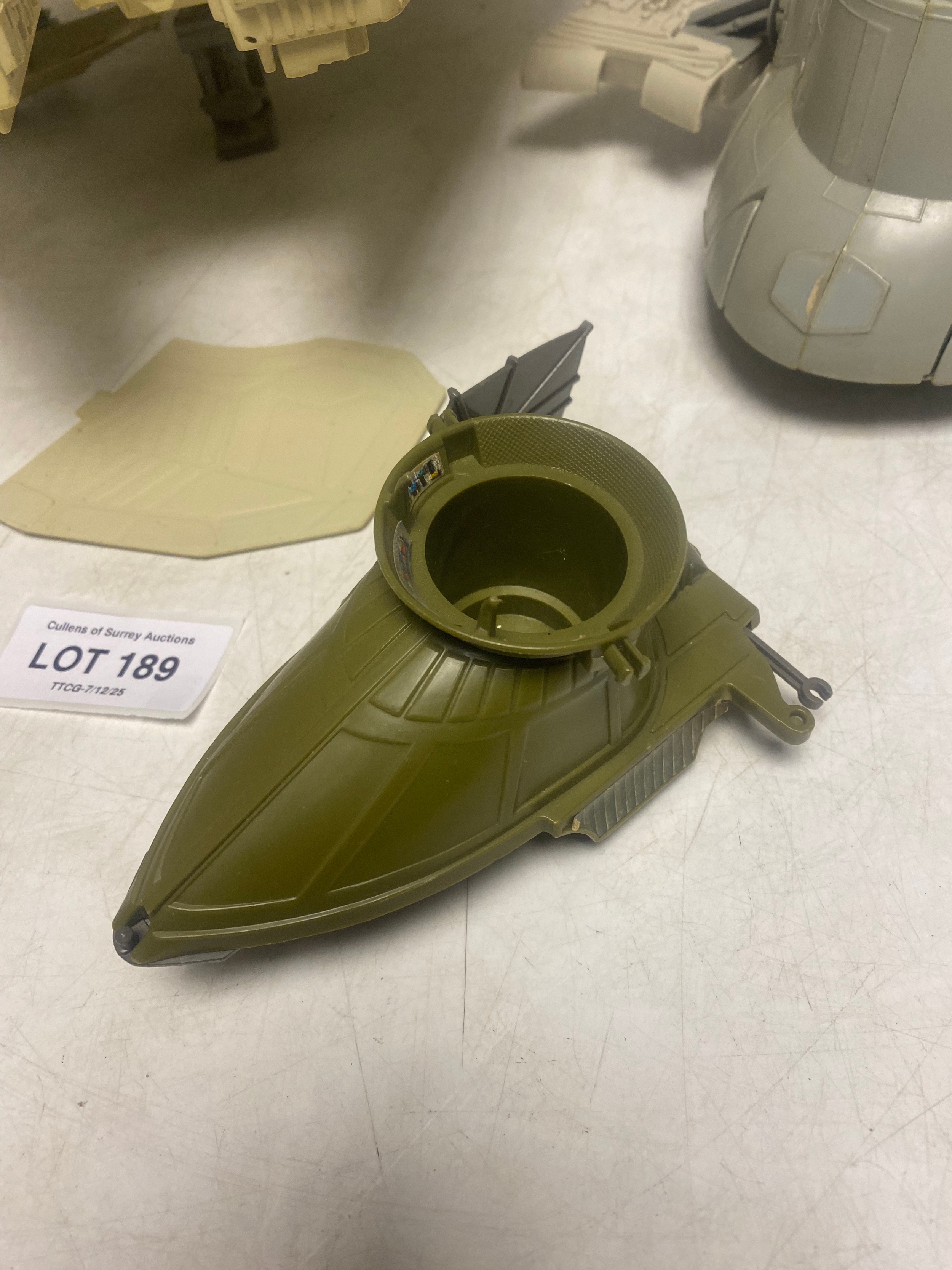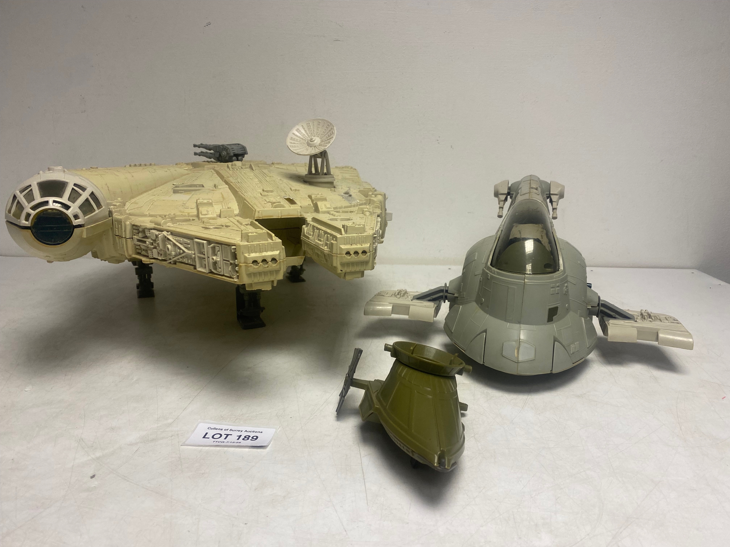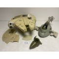 Vintage Kenner Star Wars Vehicles including Millennium Falcon with Training Ball, Slave 1 and One Man Skiff Mini-rig.