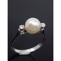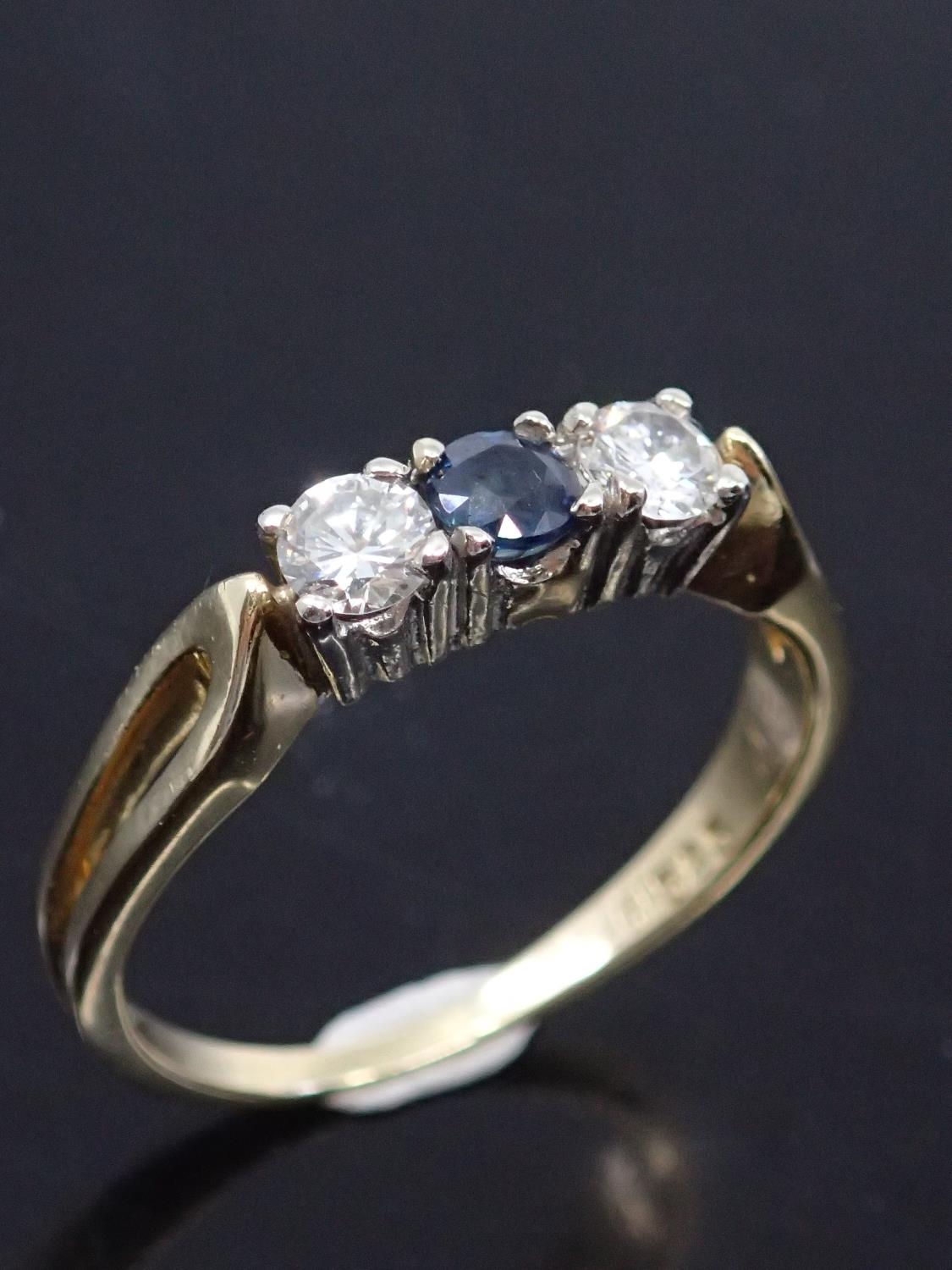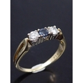 A 14ct gold sapphire and diamond three stone ring, total estimated weight of diamonds 0.35cts and sapphire 0.15cts finger size P