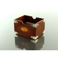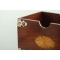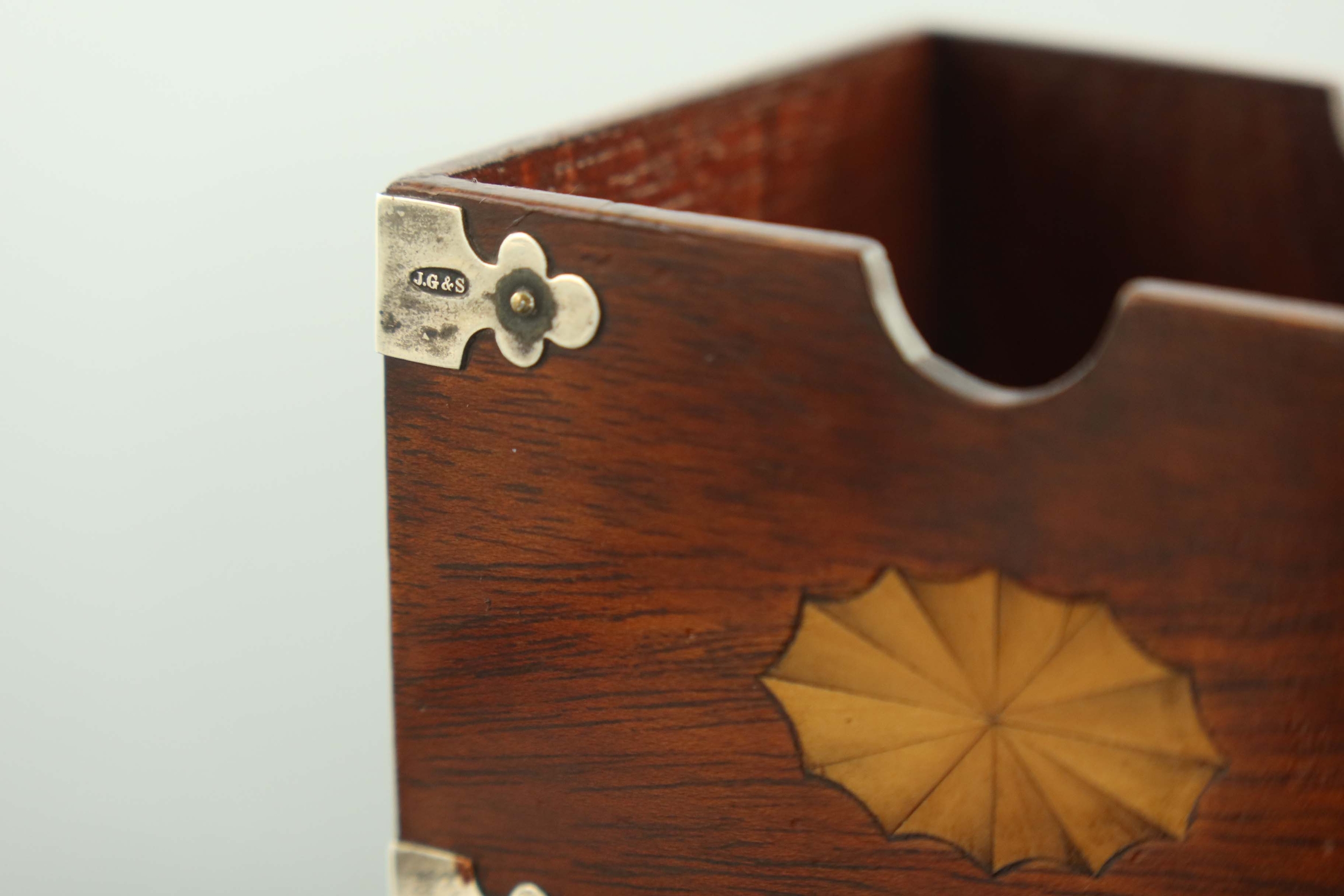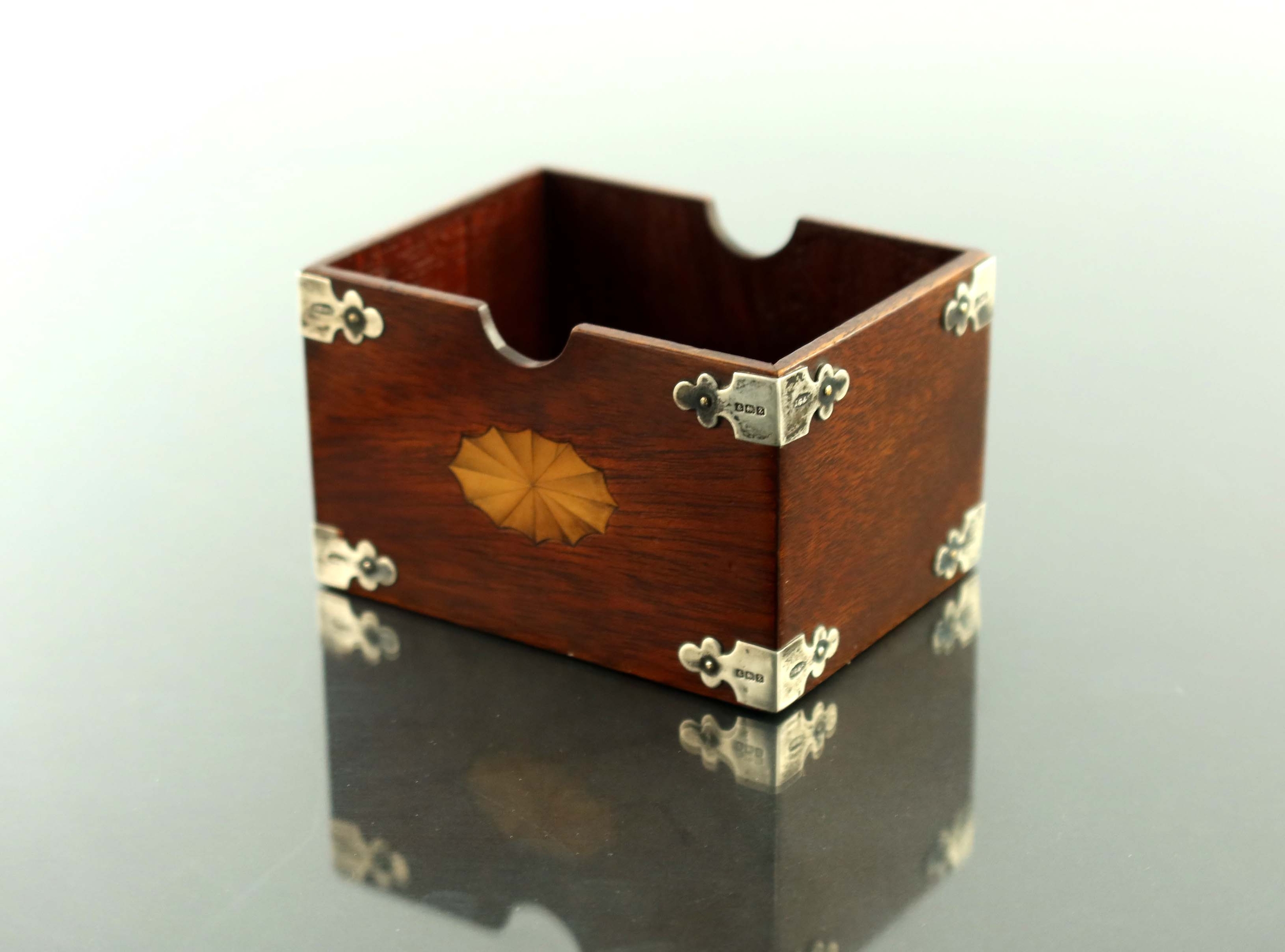 A Victorian silver mounted card box, John Grinsell and Sons, Birmingham 1899, cuboid form, with satinwood Sheraton style roundels, Gothic revival trefoil corner straps to each edge, 10cm long, 7.5cm deep, 6.5cm high
