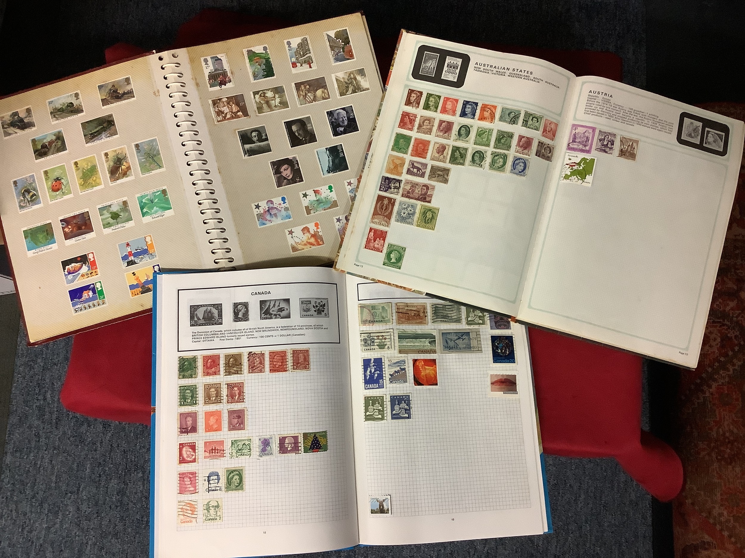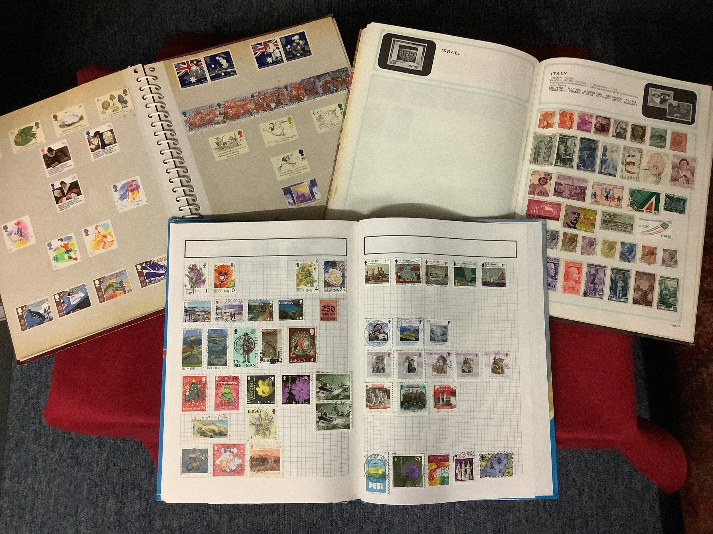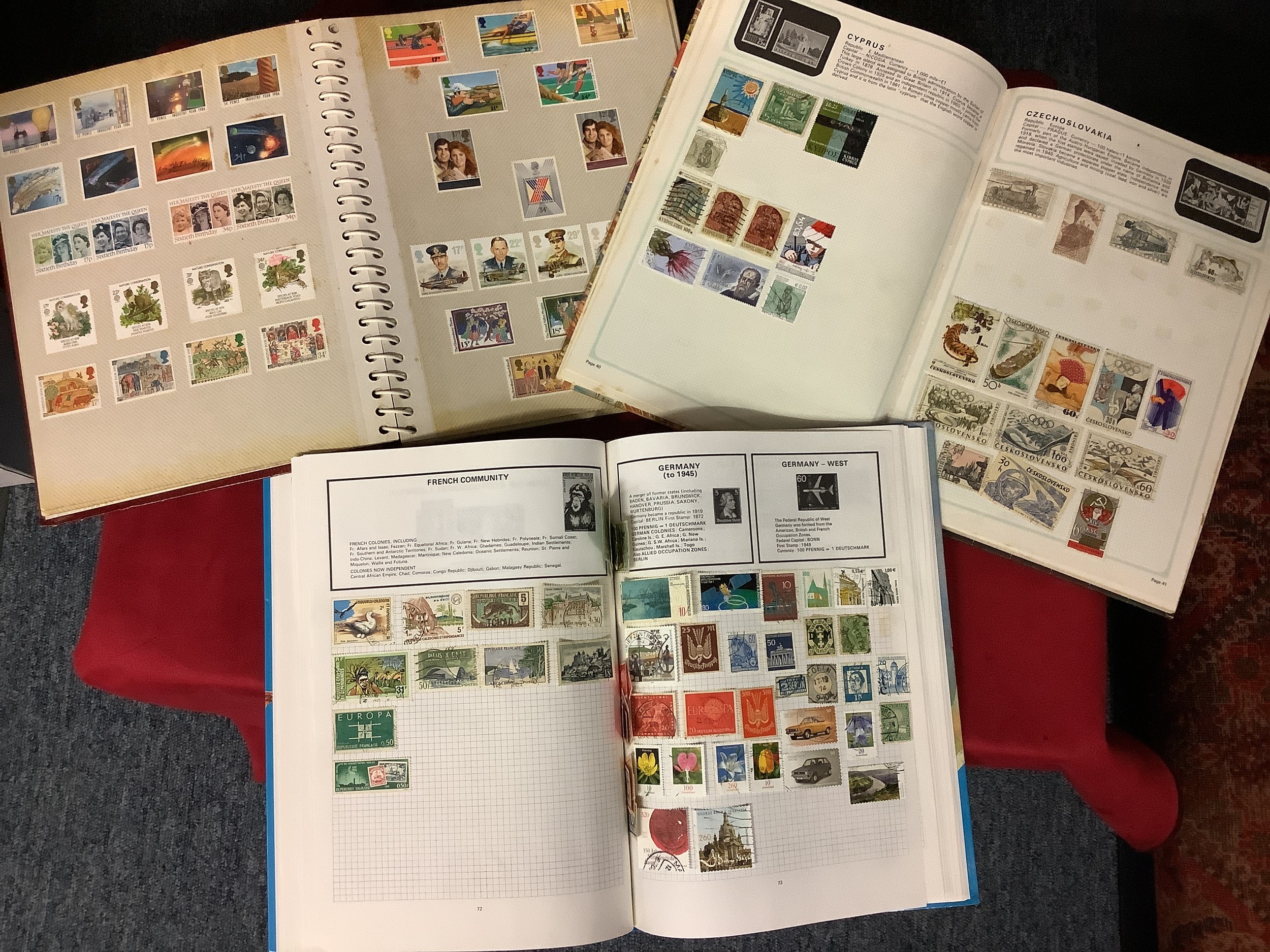 Three albums housing a mixed selection of stamps if the World to include Great Britain, Hungary, India, Jamaica, etc