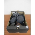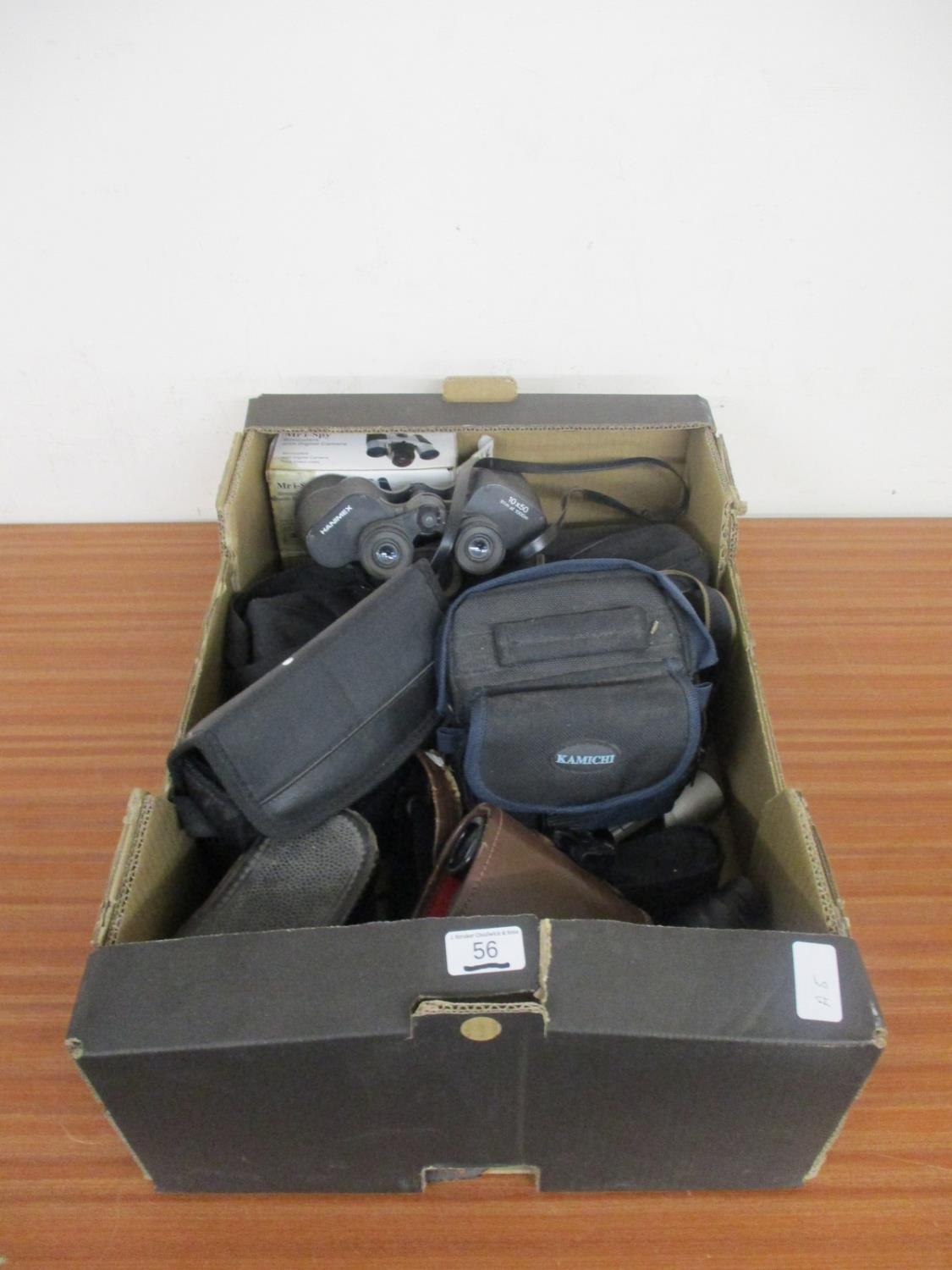 A BOX OF CAMERAS, BINOCULARS, ETC