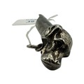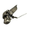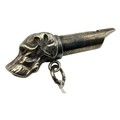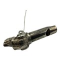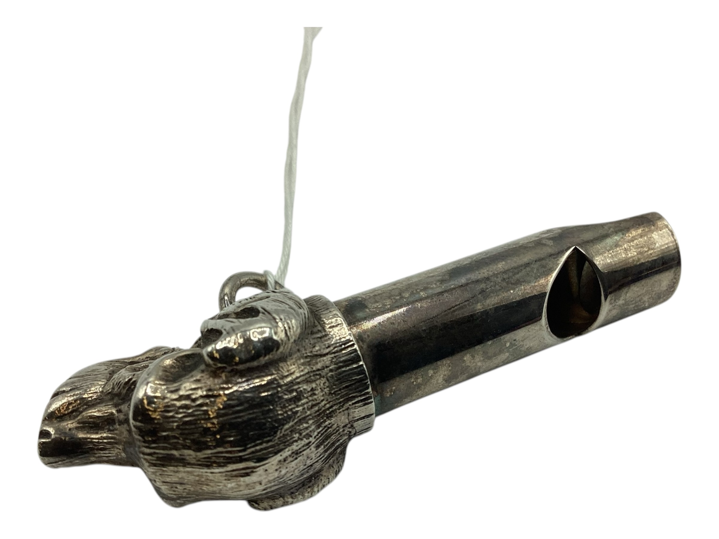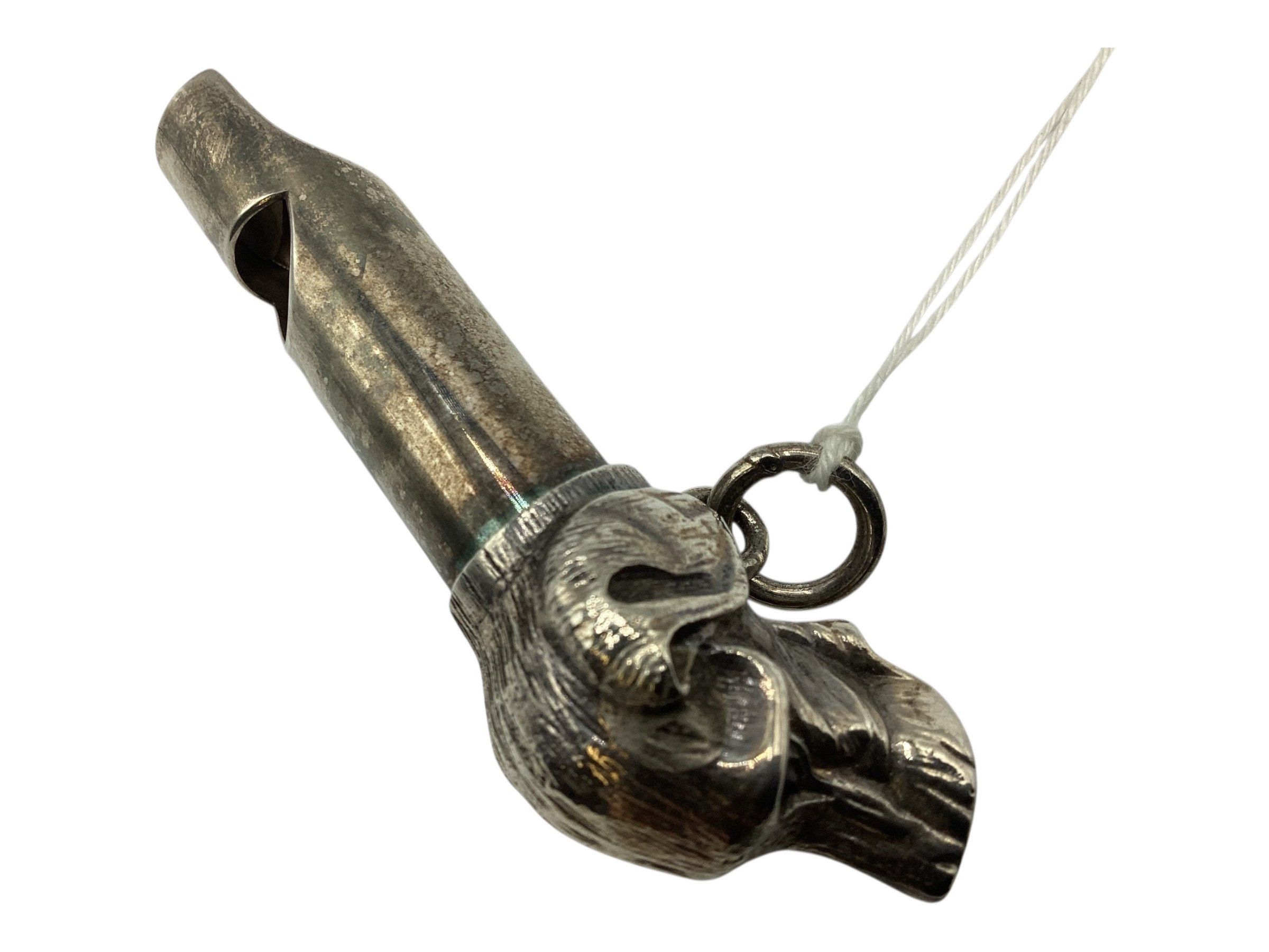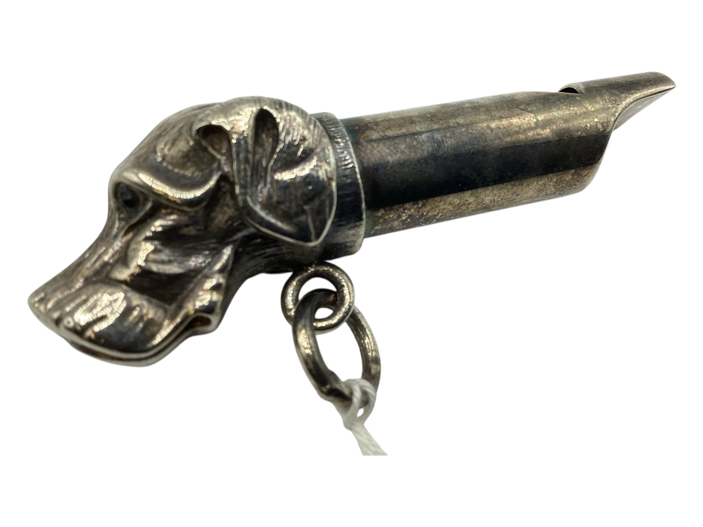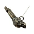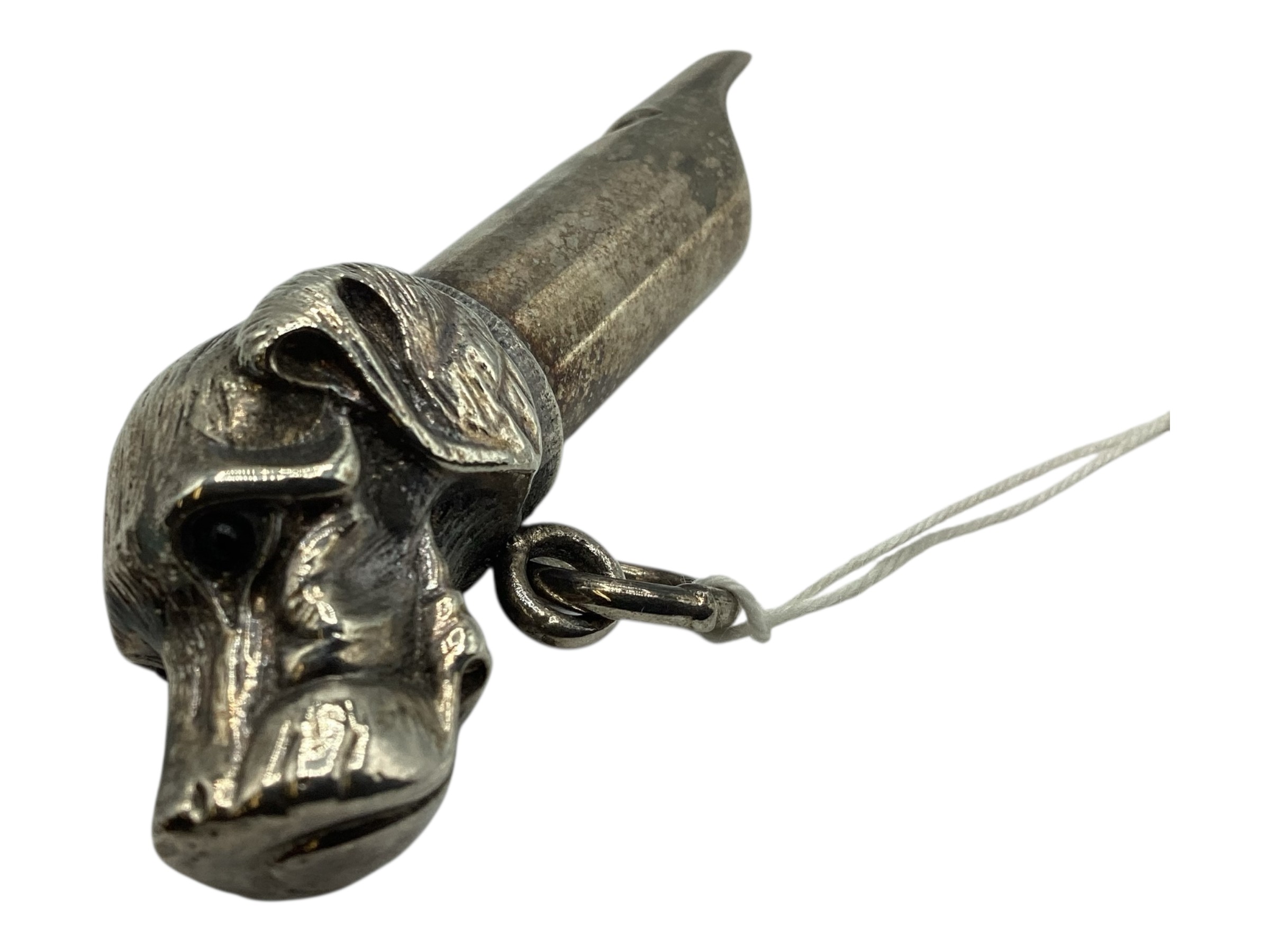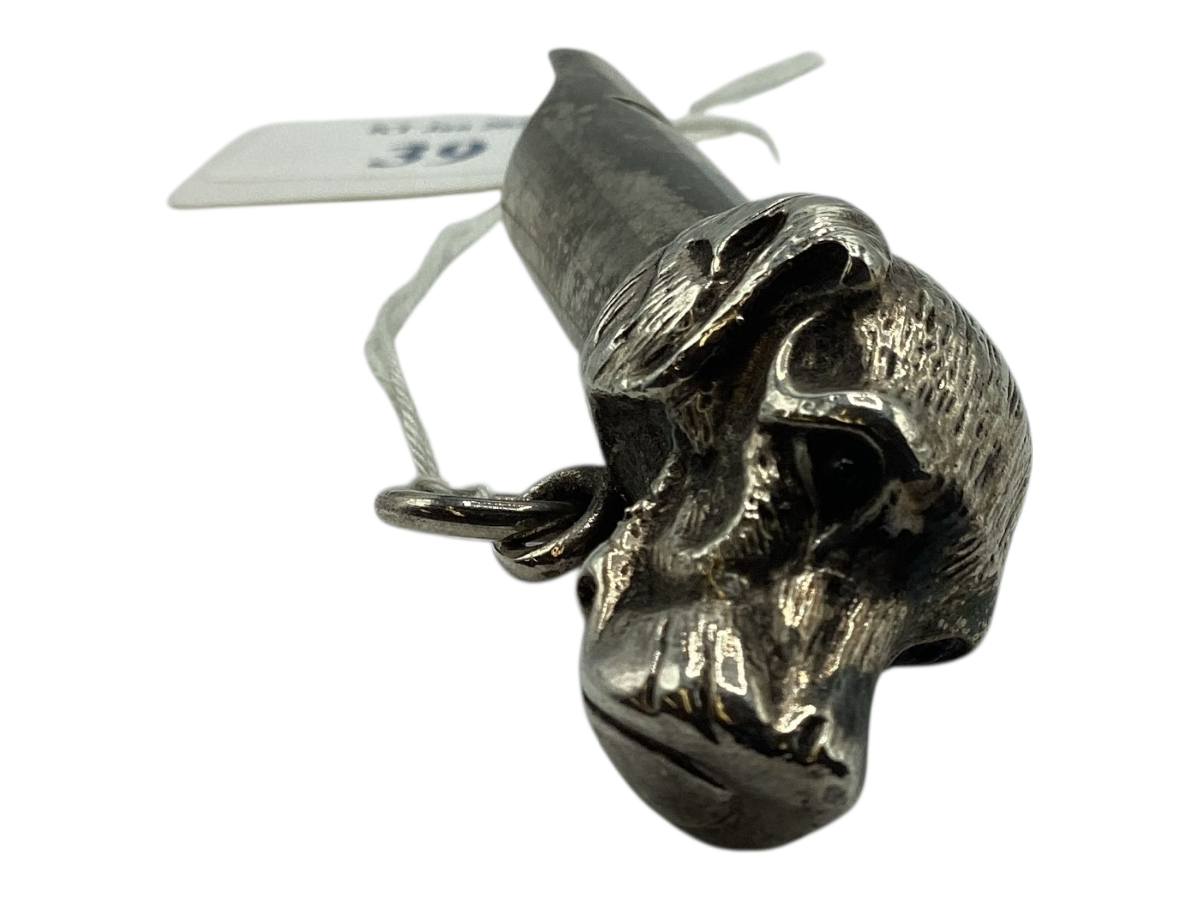 An unmarked white metal dog whistle, cast dogs head hound finial with glass eyes. 7cm.