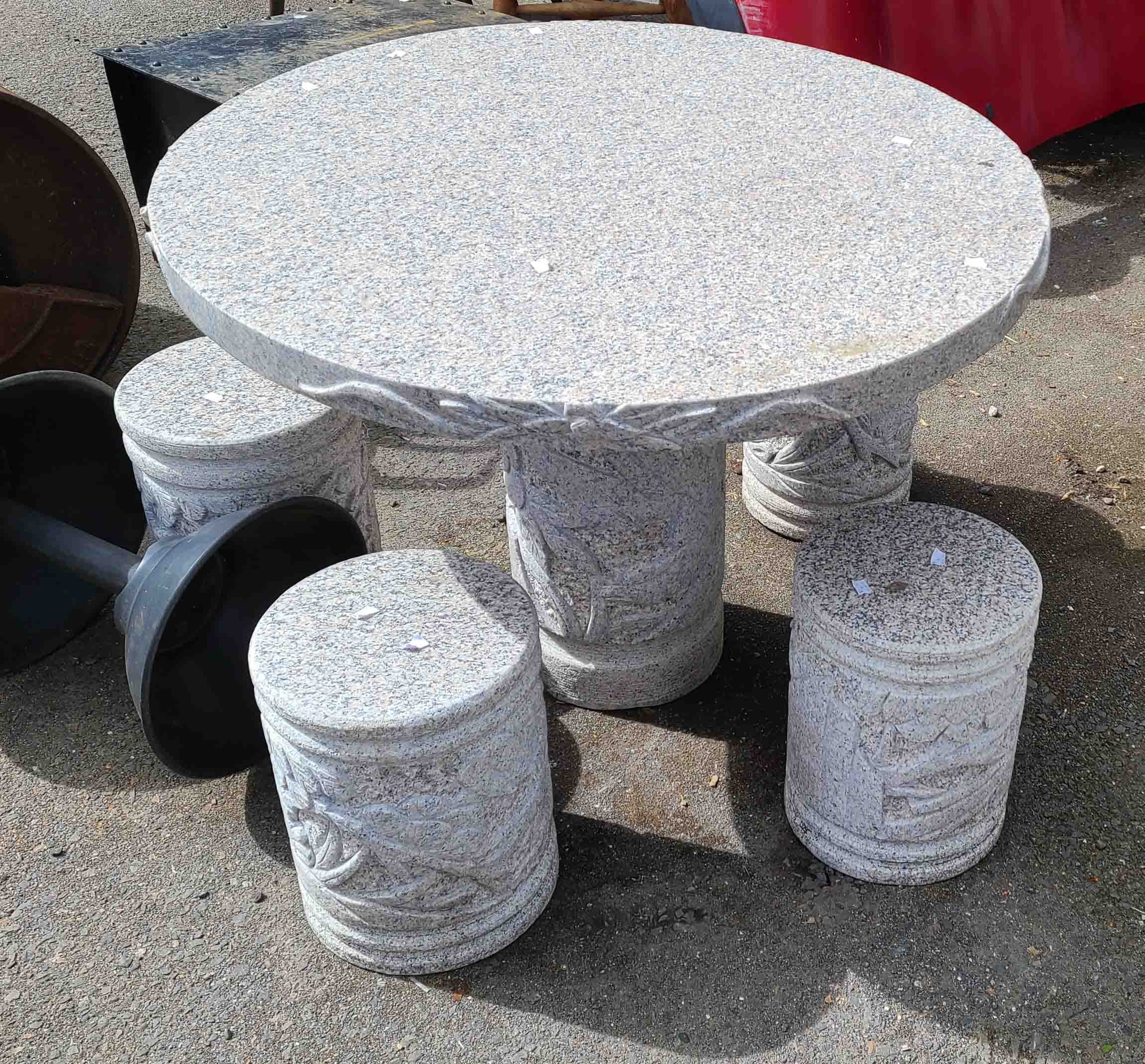 A polished granite garden patio set comprising a circular table set on a carved pedestal base and four matching stools