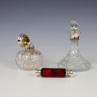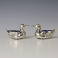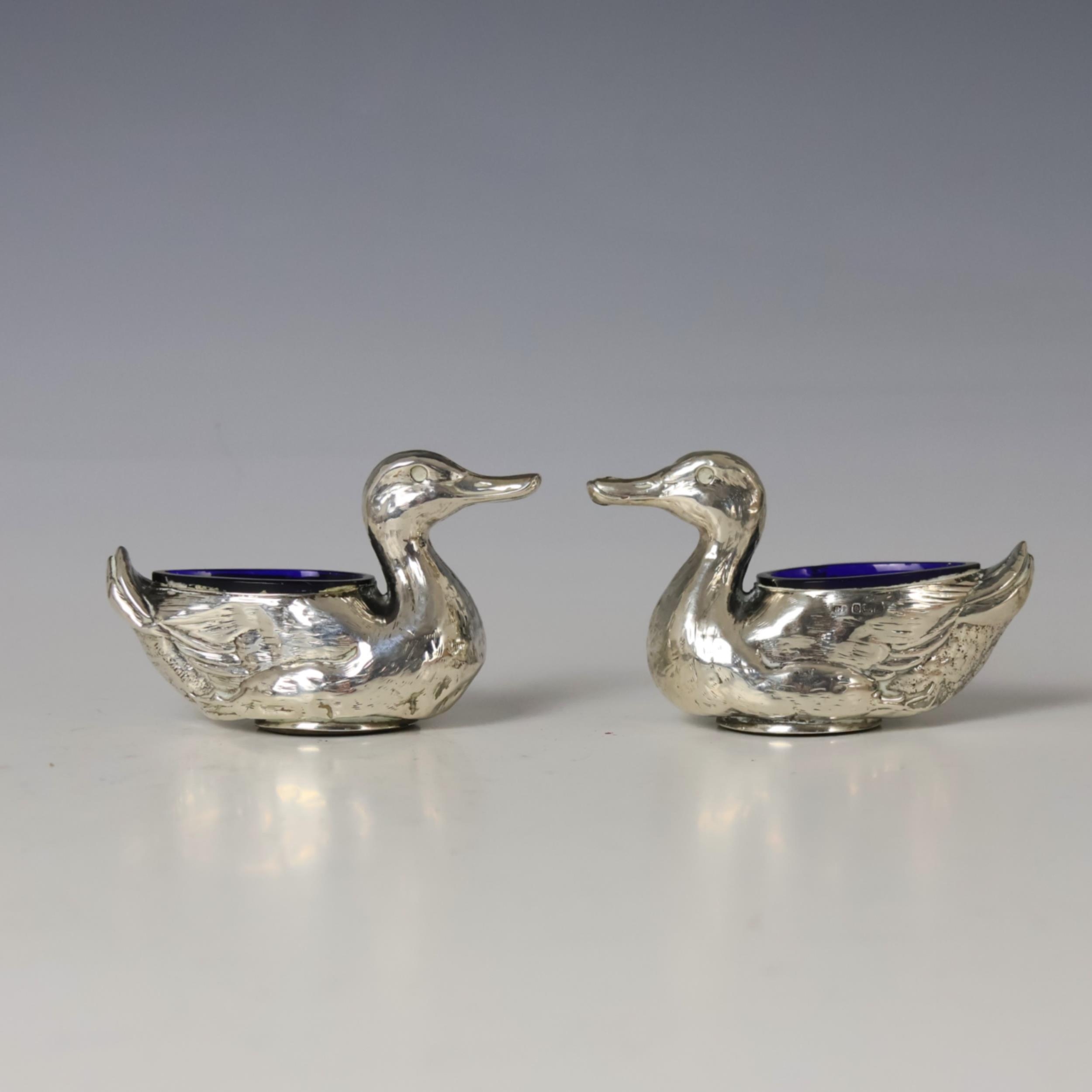 A pair of Edwardian silver mounted novelty open salts, possibly Robert Pringle & Sons, Birmingham 1905, modelled as ducks with blue glass liners, 10cm long (2) (weighted) (at fault)