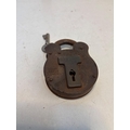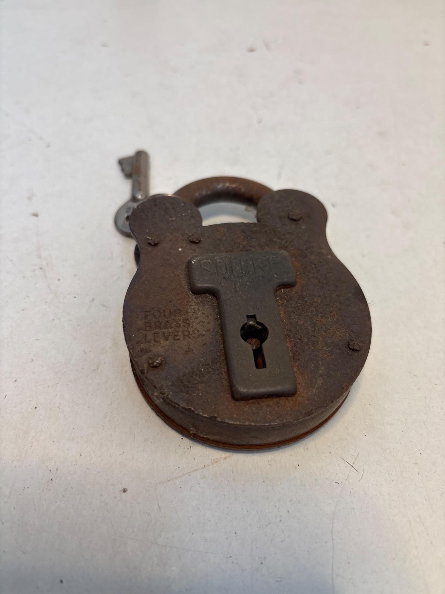 Iron padlock marked 'Lever Tri-Key,' featuring a key.