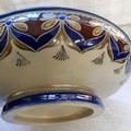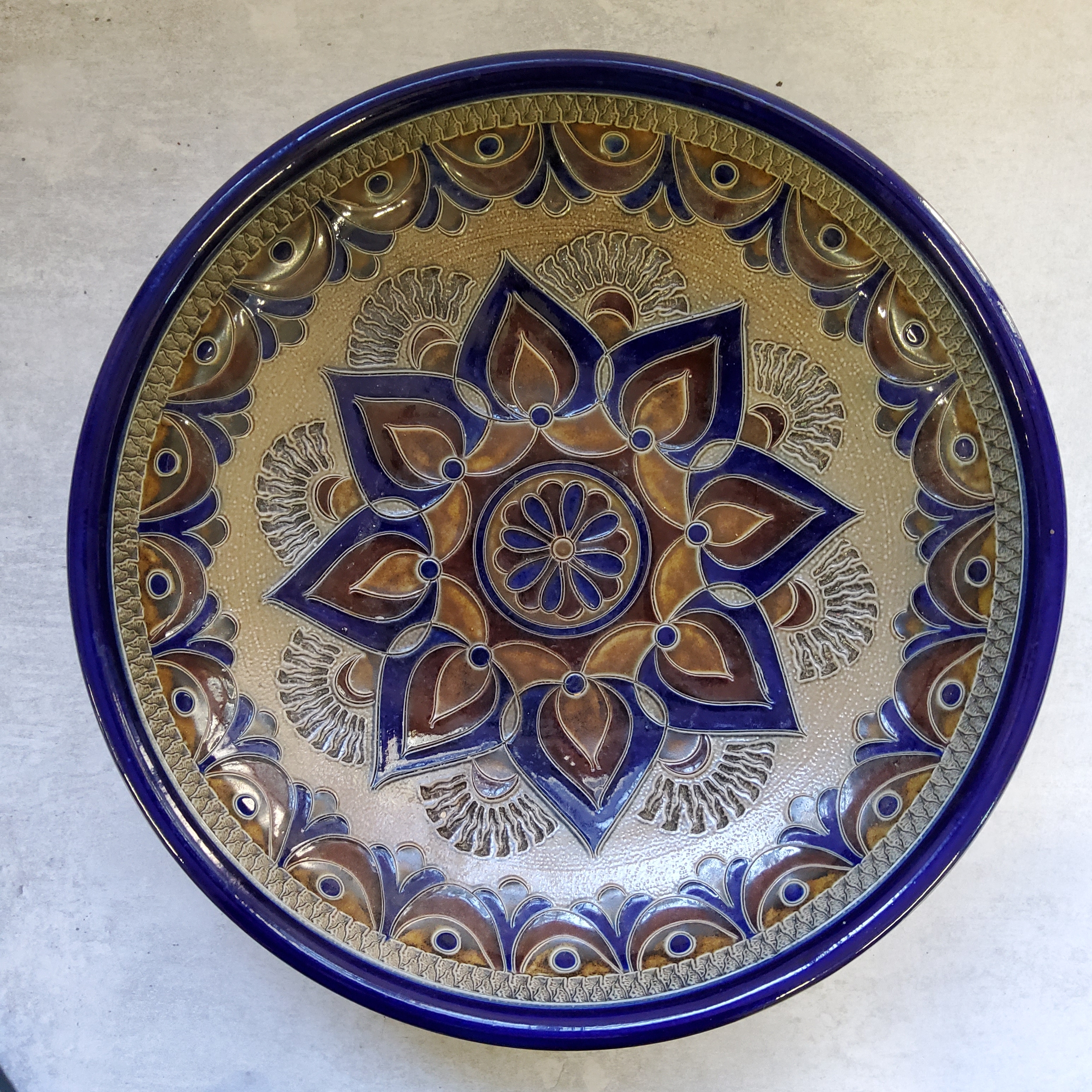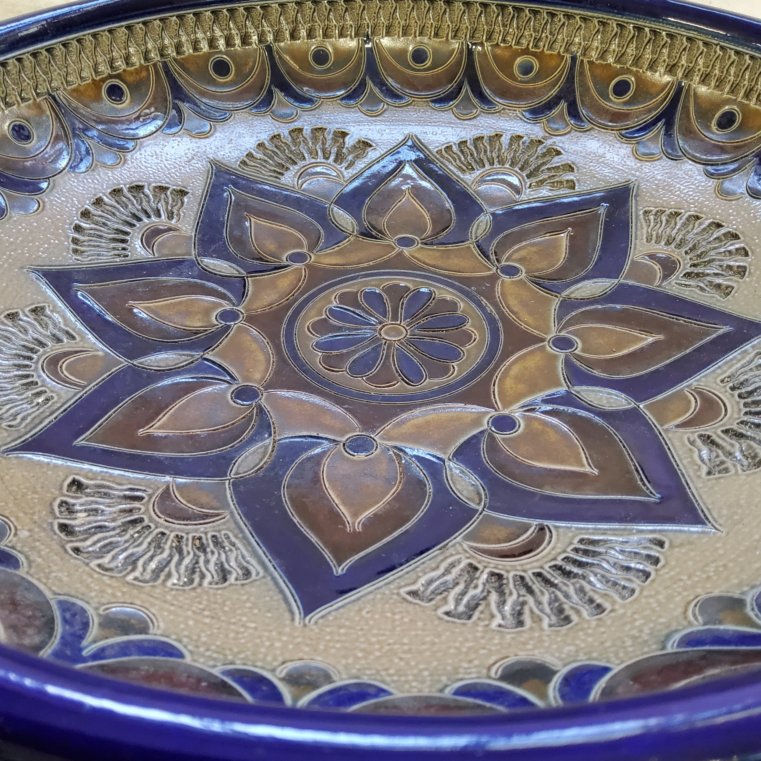 Decorative Ceramics - substantial German Westerwald type fruit bowl, boldly decorative cobalt blue and salt glazed panels, indistictly signed to base, possibly *Maud cobert*. 32cm diameter. Excellent condition.