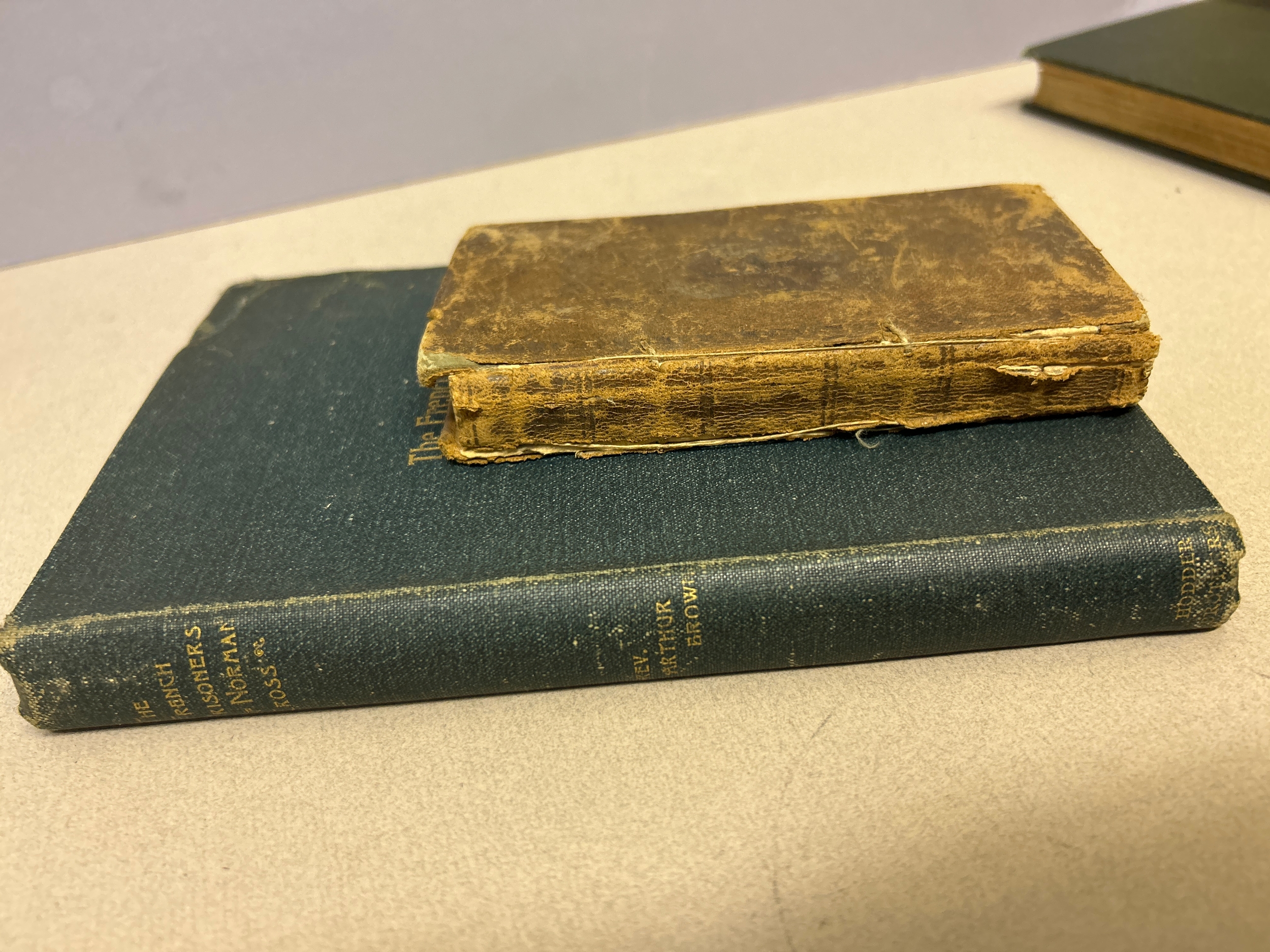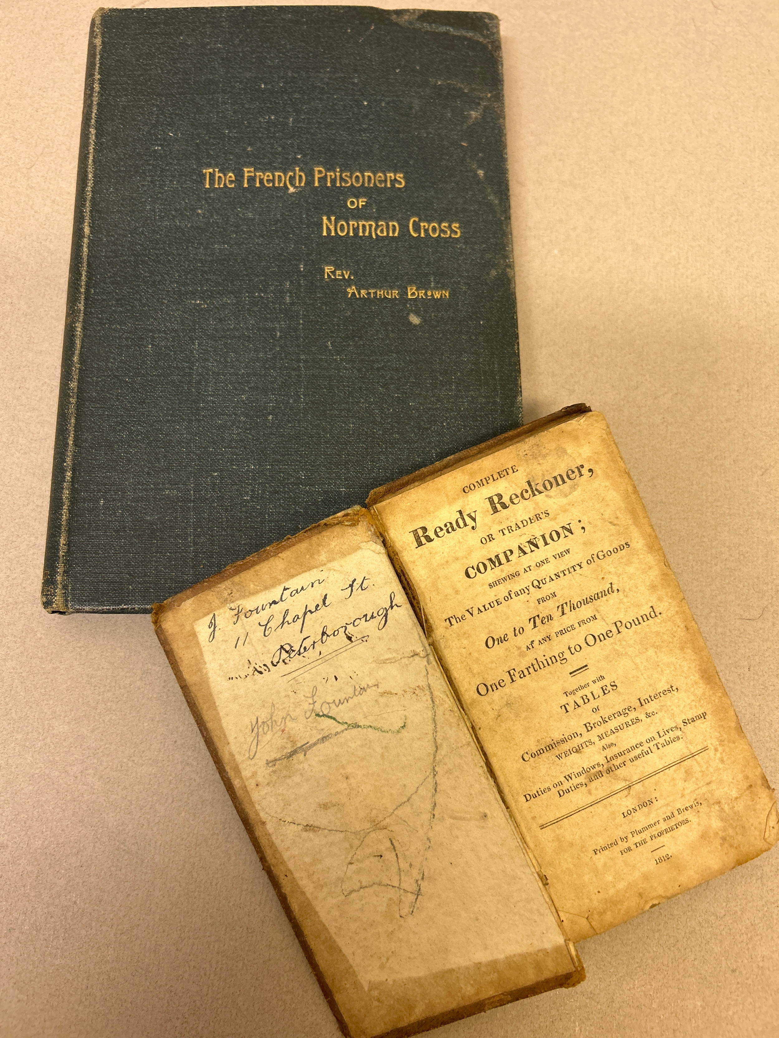 Scarce book “The French Prisoners of Norman Cross” by Rev Arthur Brown, published by Hodder Brothers. Hardback, undated circa 1900, also an 1812 leather bound Ready Reckoner or Traders Companion printed by Plummer & Brewis.
