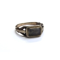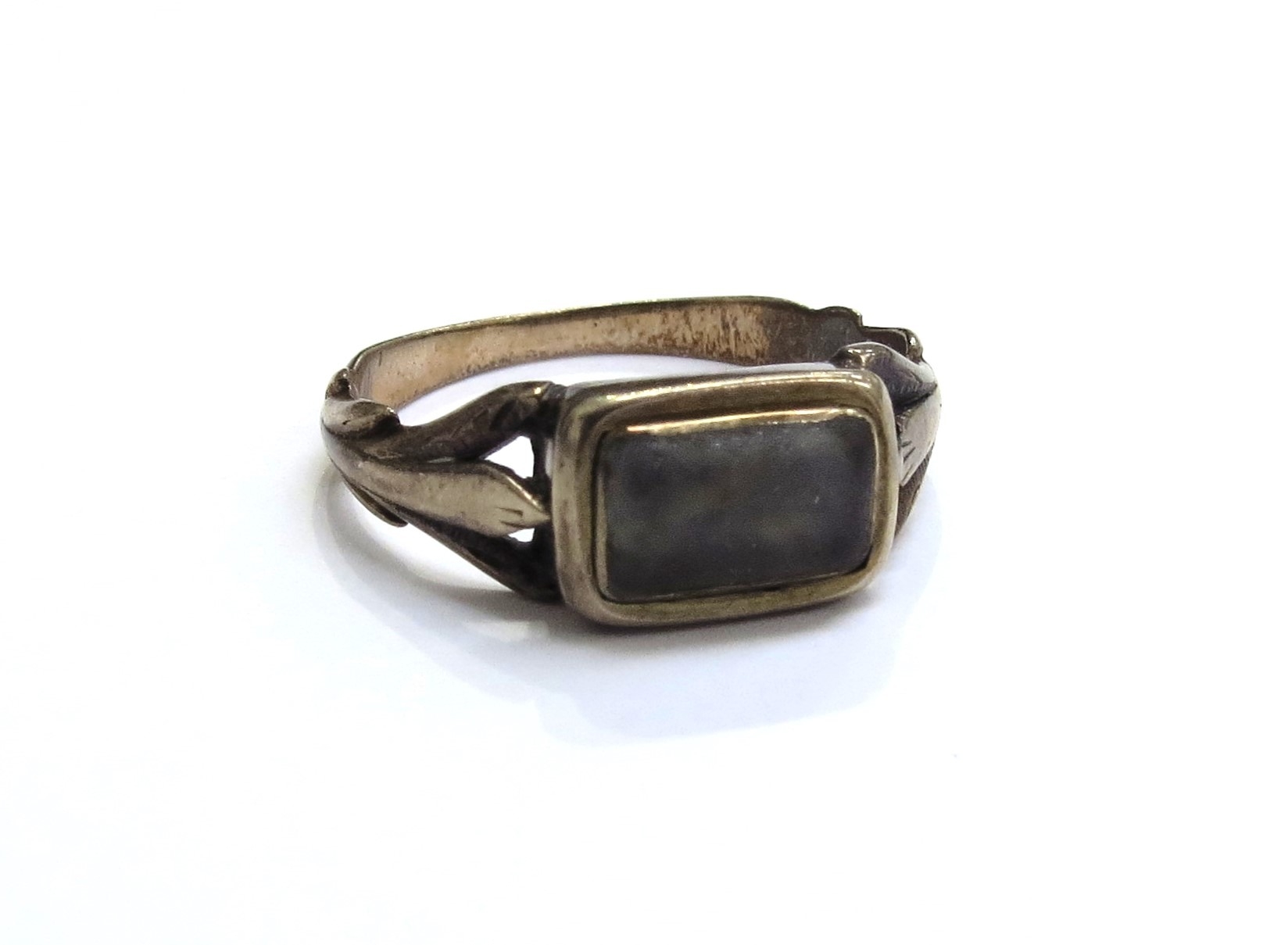 A memorial ring with glass panel to centre, worn, unmarked. Size K, 2g