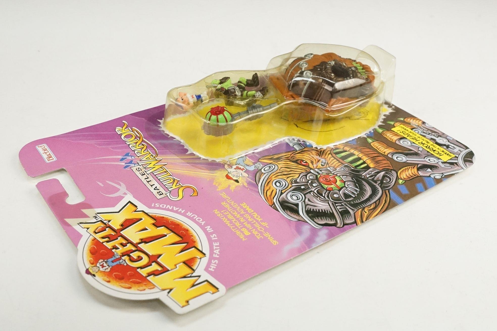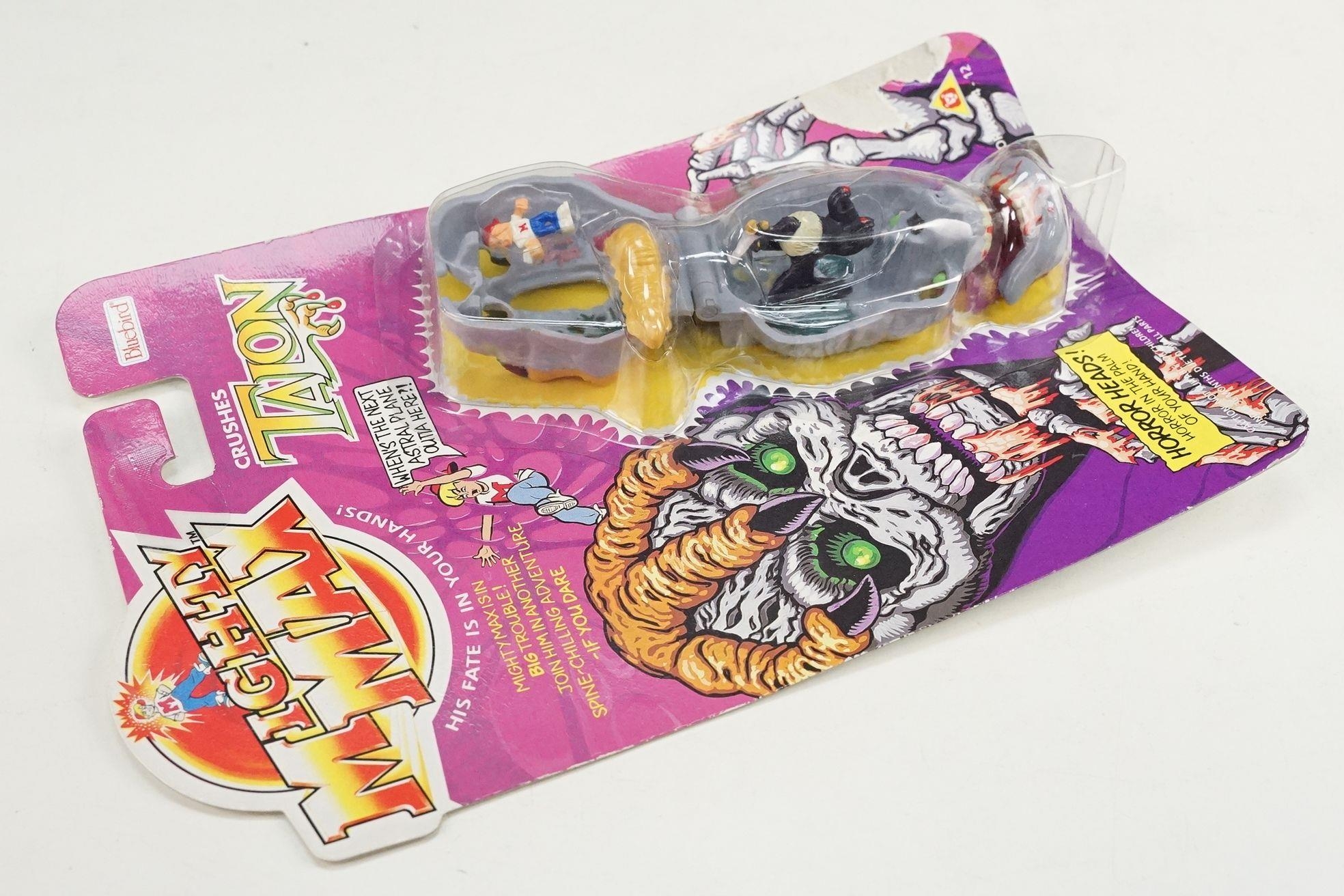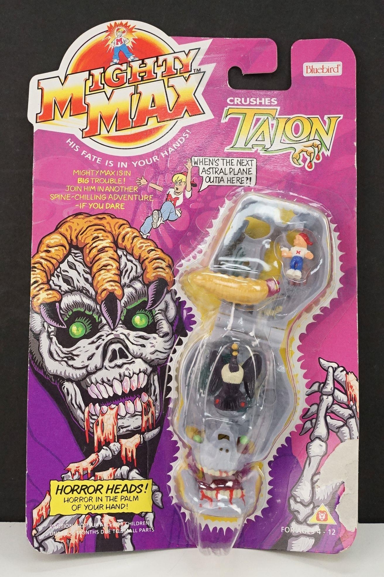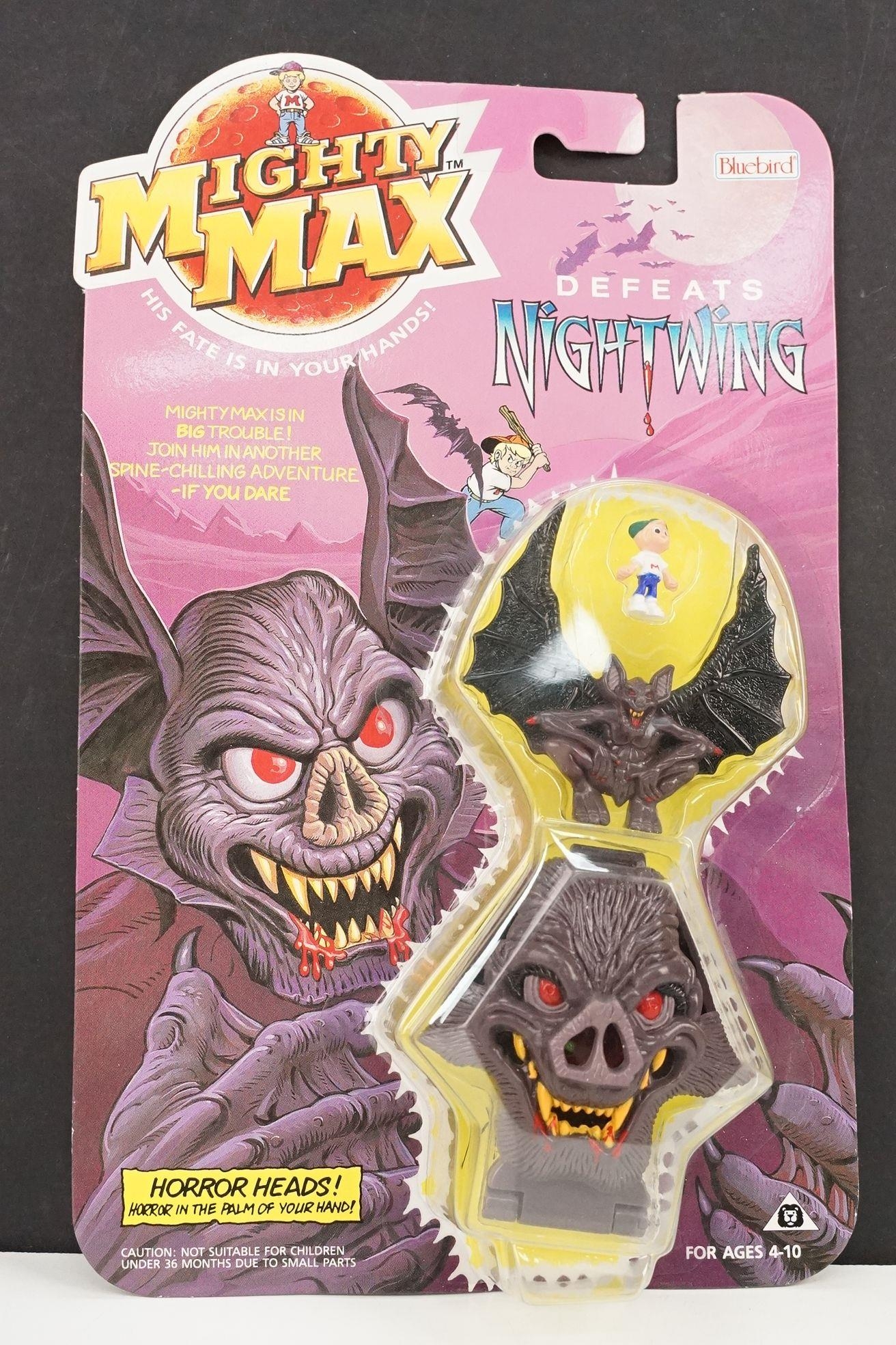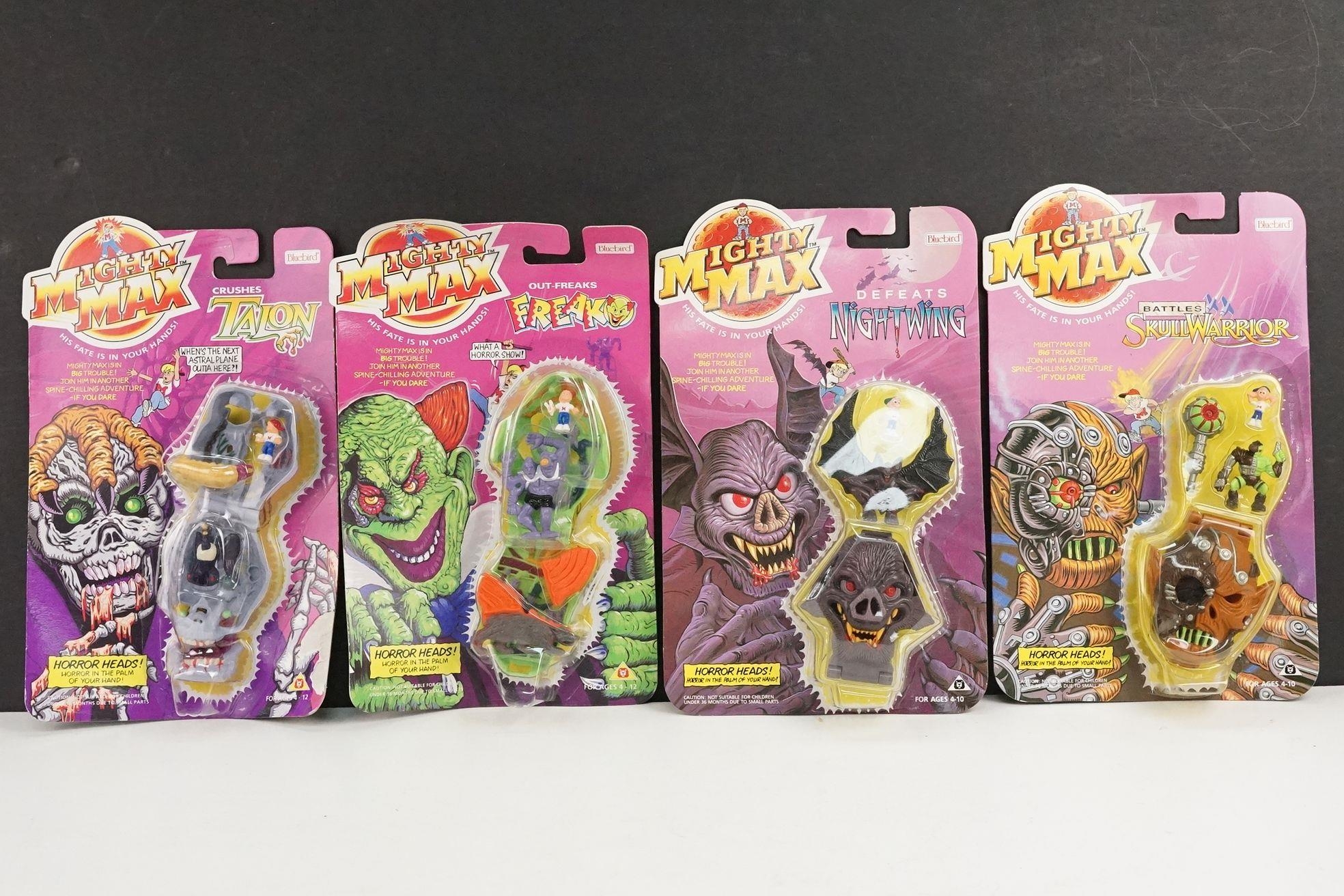 Four carded Bluebird Mighty Max play sets to include Defeats Nightwing, Out-freaks Freaks (card bend), Crushes Talon (some card bend and loss to graphics to lower card corner) and Battles Skull Warrior, all unopened, vg unless where stated