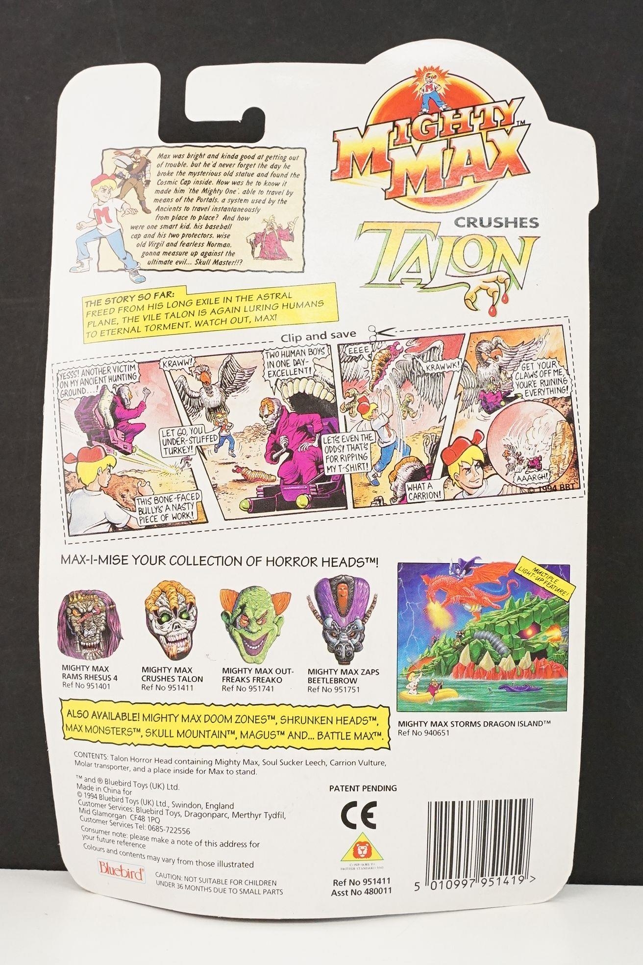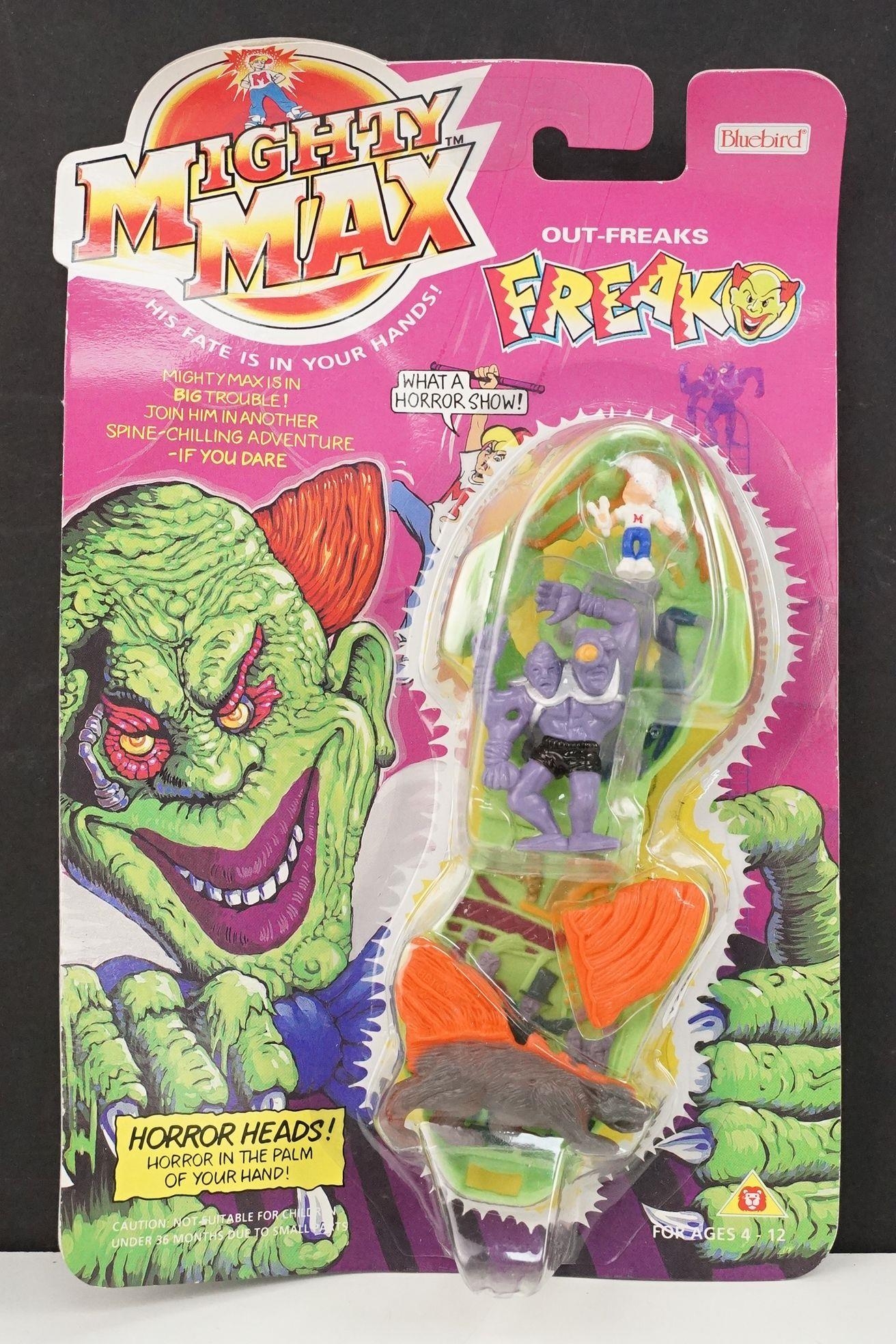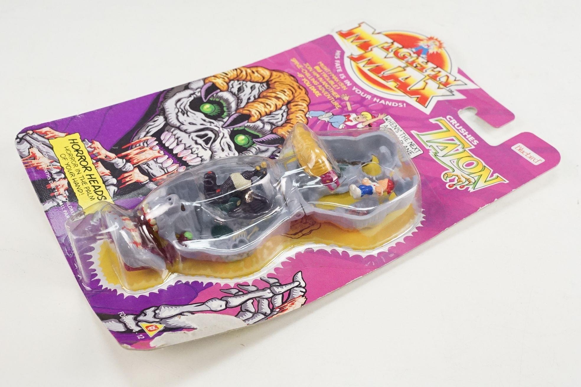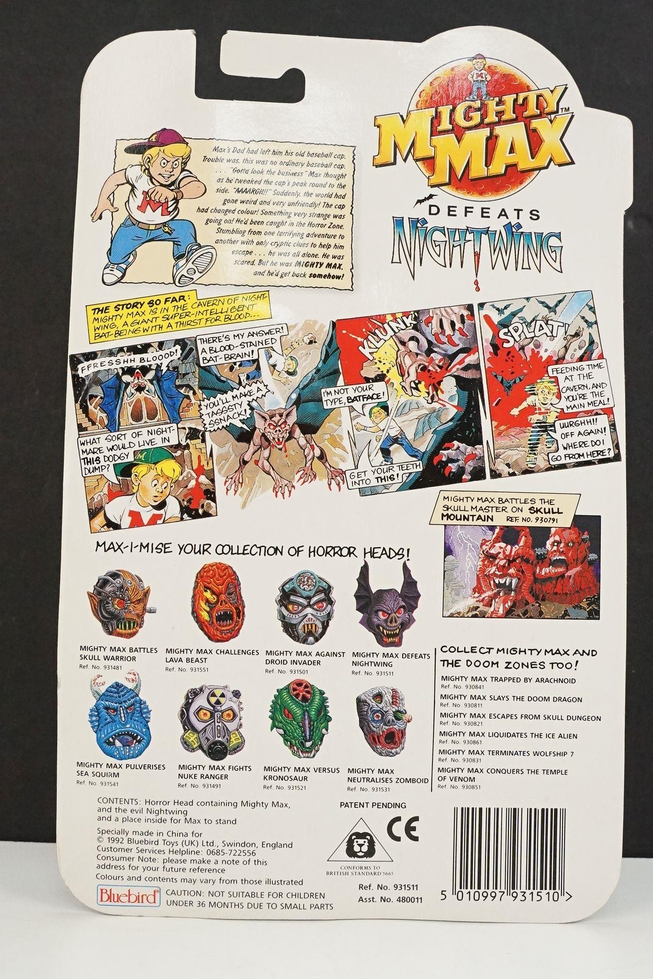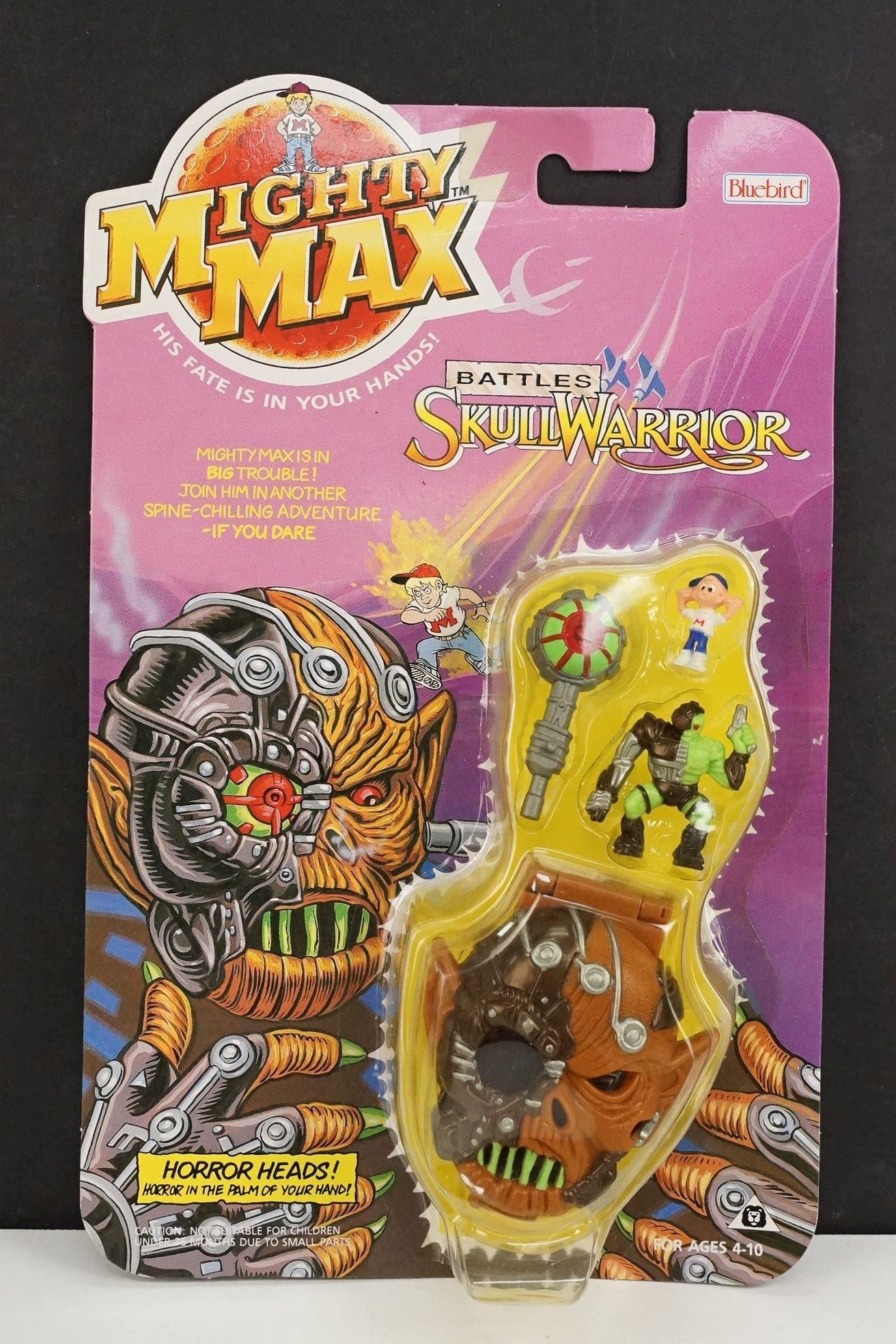 Four carded Bluebird Mighty Max play sets to include Defeats Nightwing, Out-freaks Freaks (card bend), Crushes Talon (some card bend and loss to graphics to lower card corner) and Battles Skull Warrior, all unopened, vg unless where stated