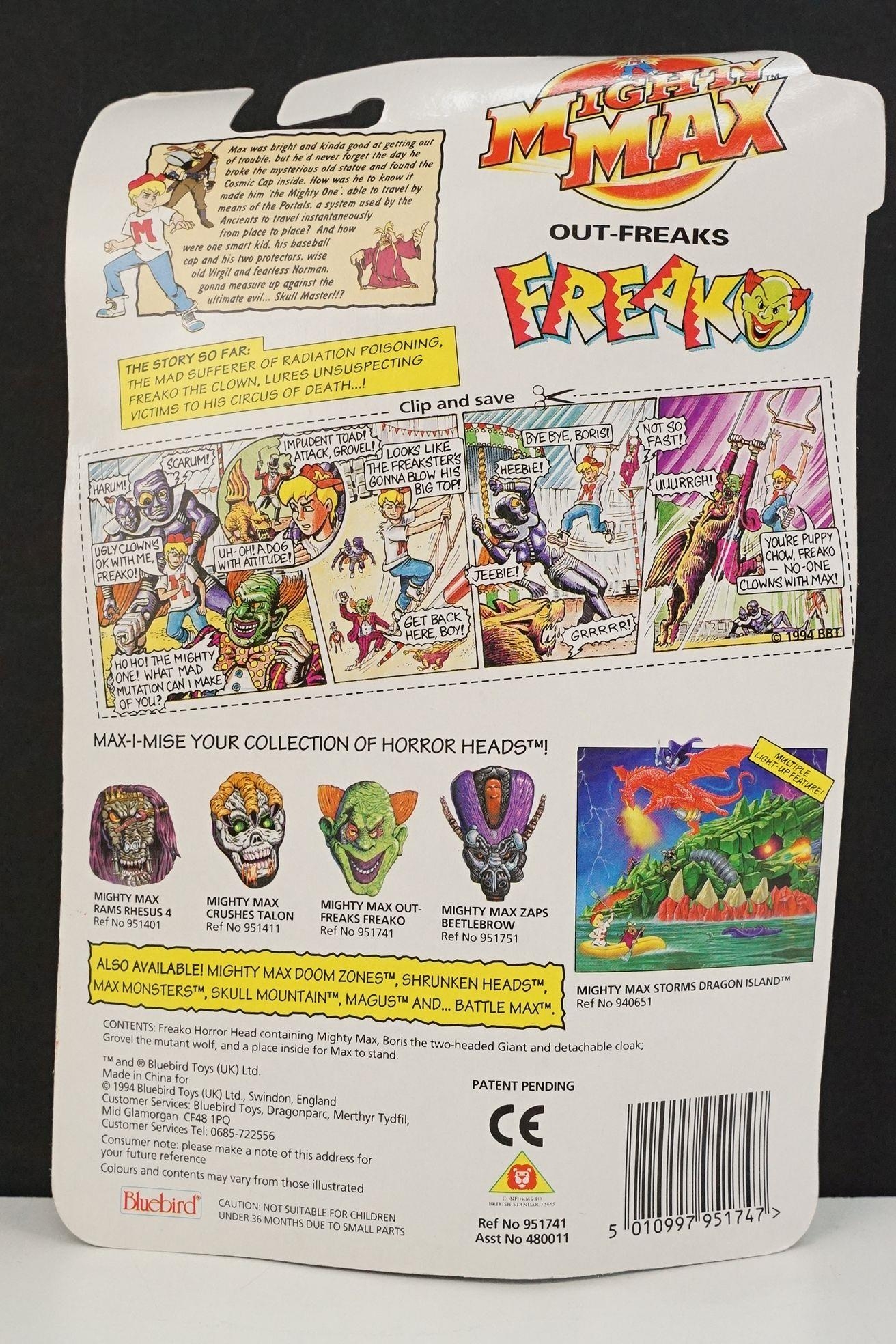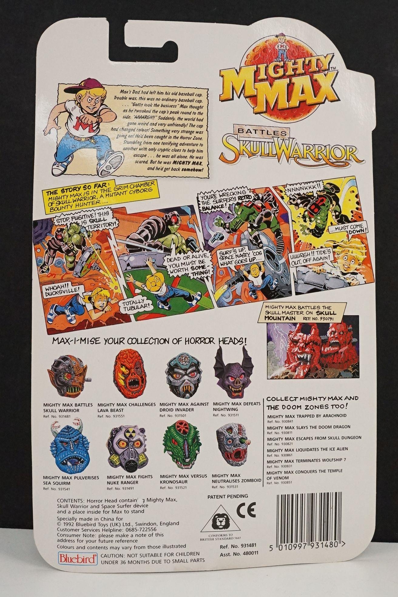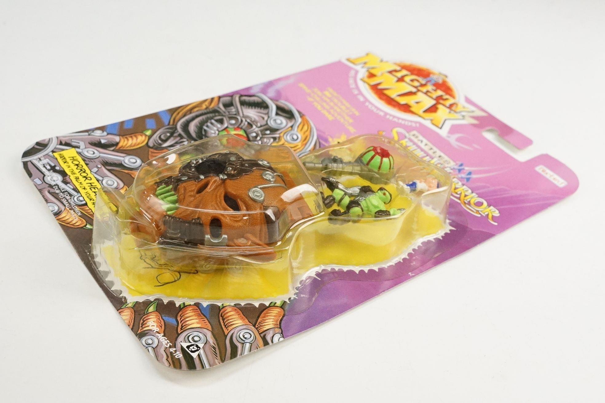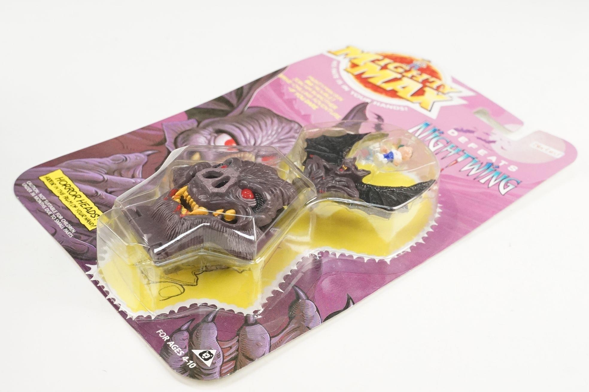 Four carded Bluebird Mighty Max play sets to include Defeats Nightwing, Out-freaks Freaks (card bend), Crushes Talon (some card bend and loss to graphics to lower card corner) and Battles Skull Warrior, all unopened, vg unless where stated