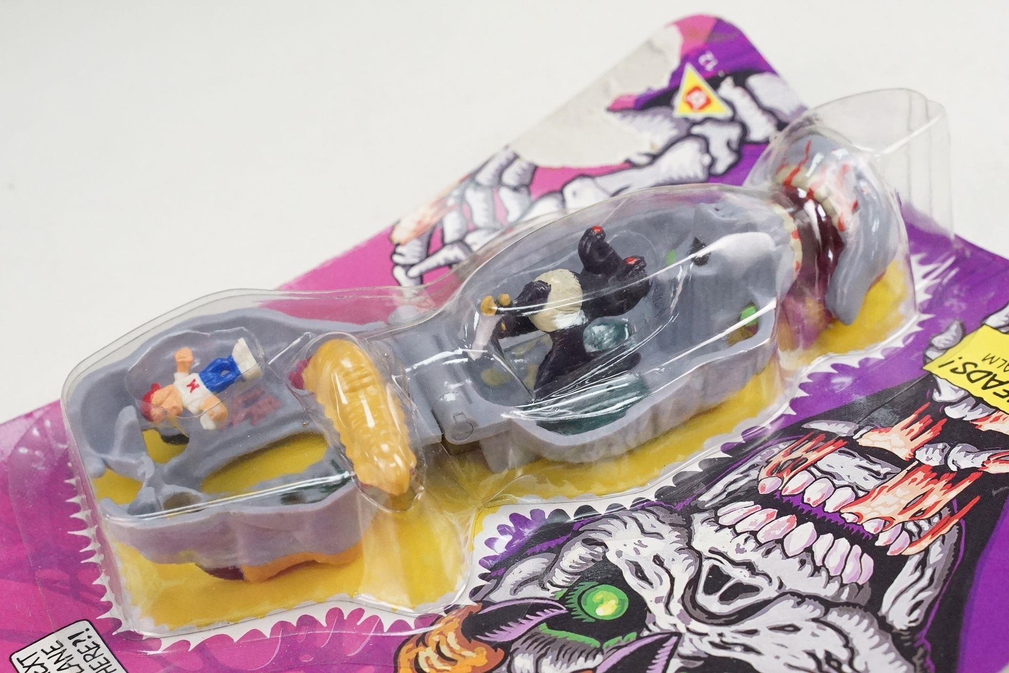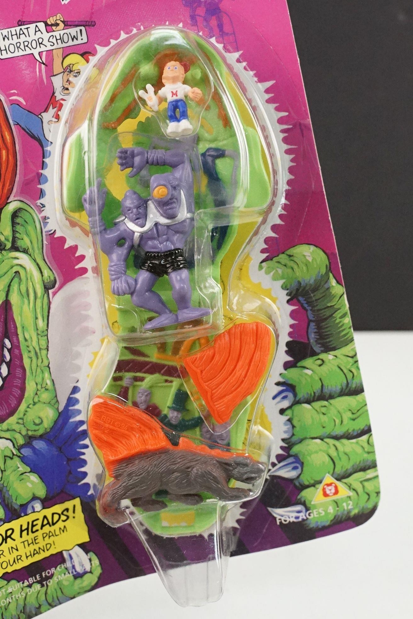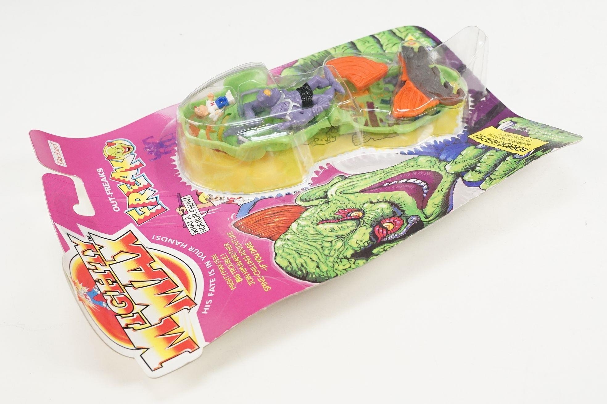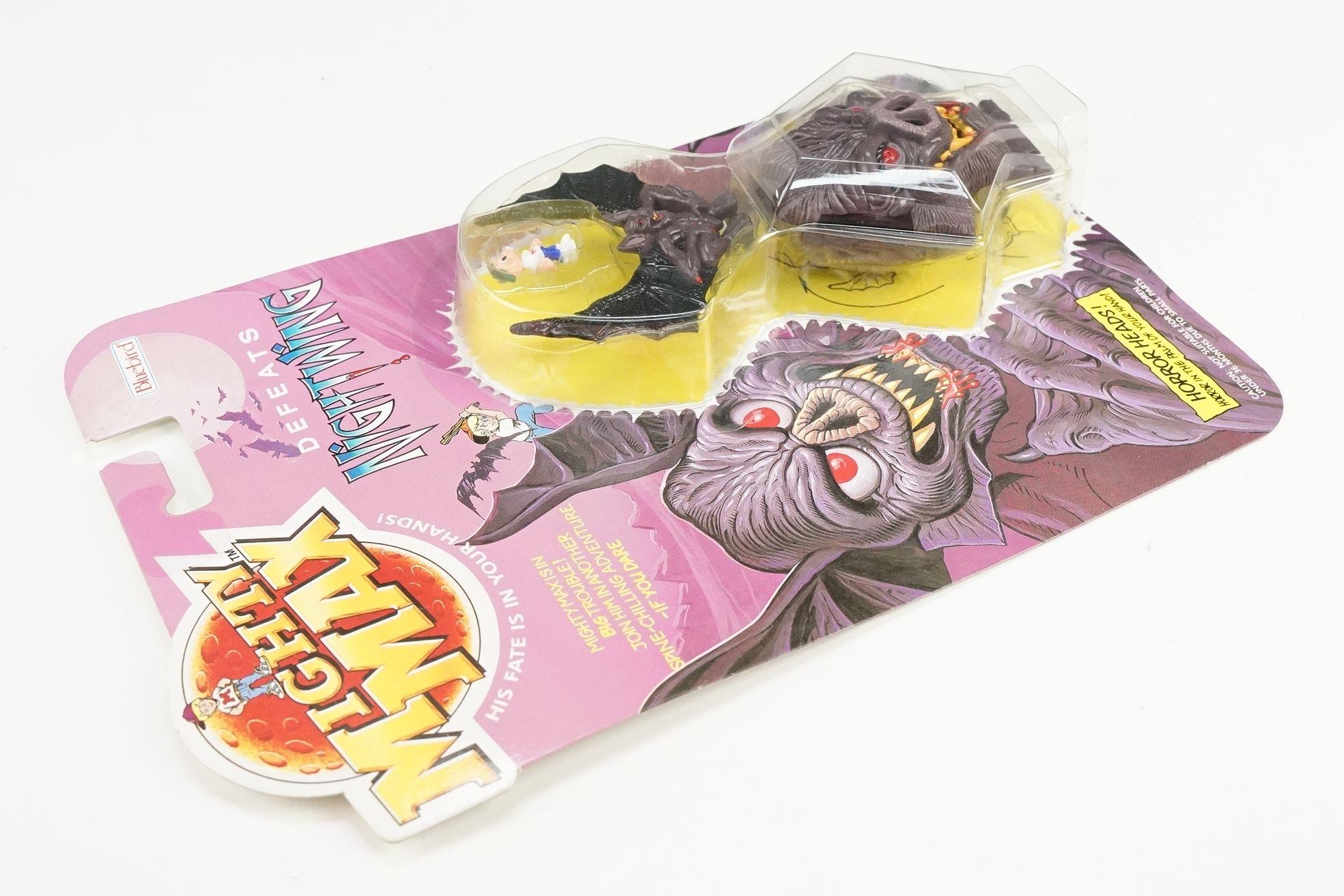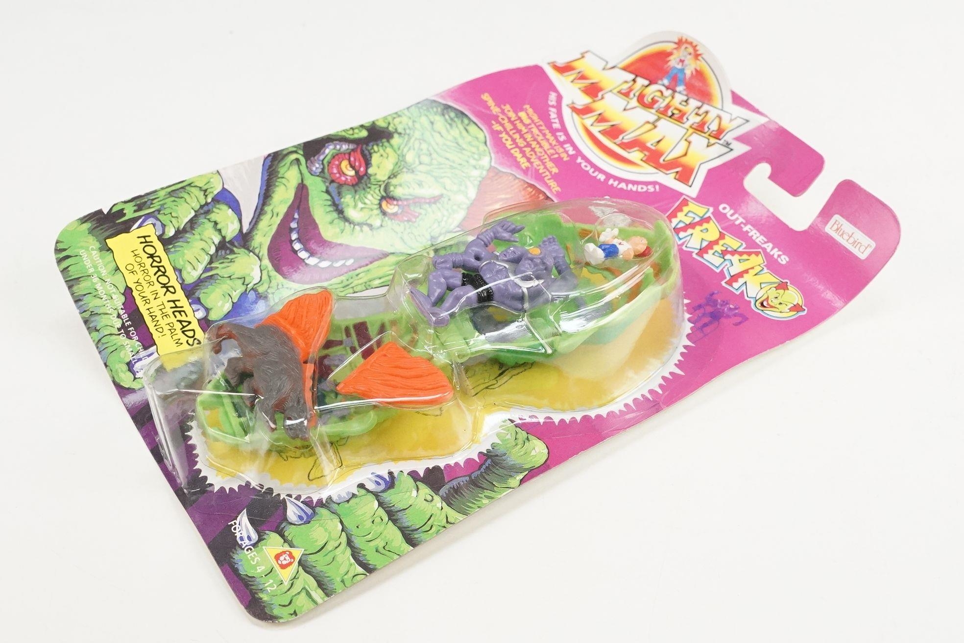 Four carded Bluebird Mighty Max play sets to include Defeats Nightwing, Out-freaks Freaks (card bend), Crushes Talon (some card bend and loss to graphics to lower card corner) and Battles Skull Warrior, all unopened, vg unless where stated