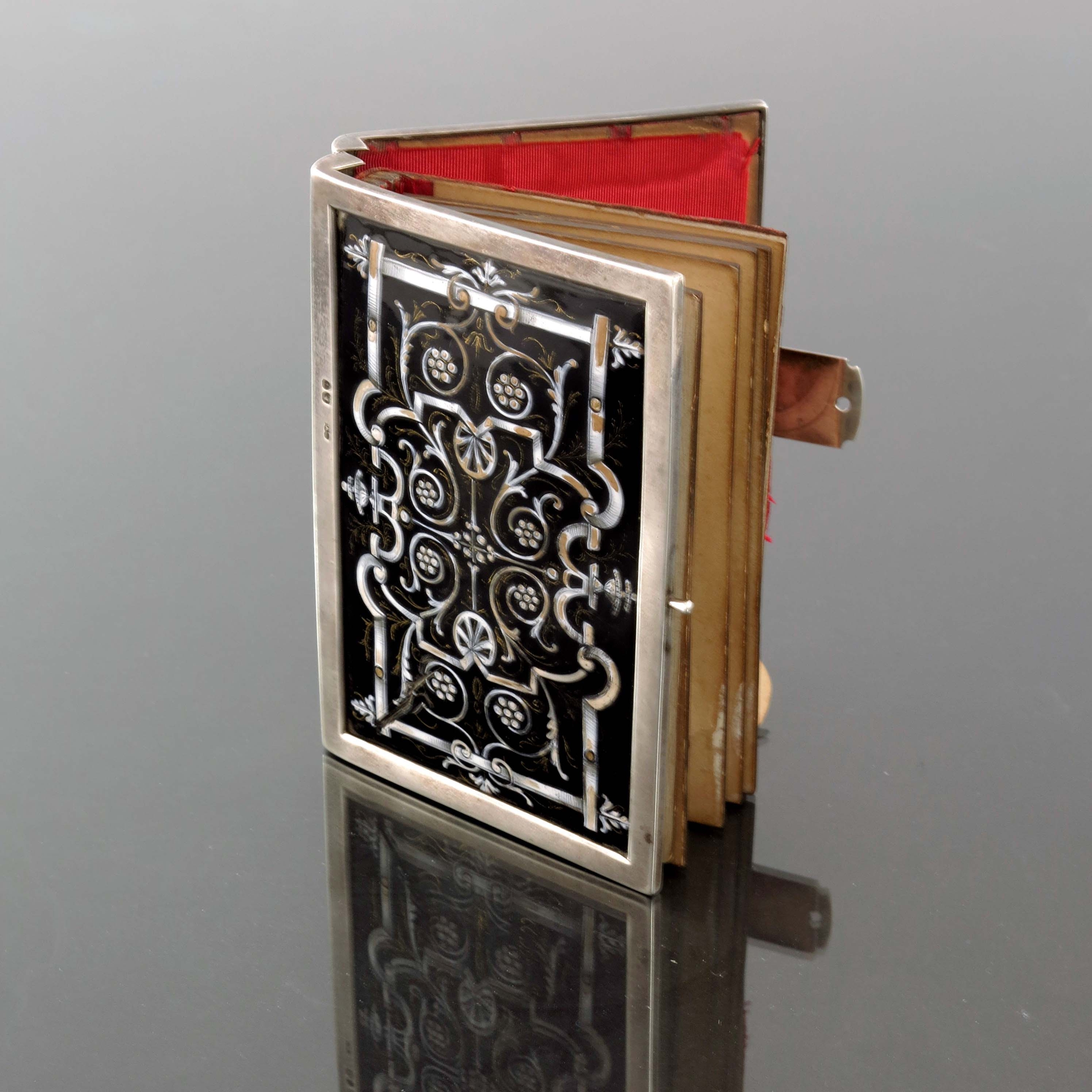 A Victorian silver and enamelled photo album, Henry William Dee, London 1871, the cover painted with Mannerist borders and symmetrical foliate scrolls, in white and black enamel, set in a plain frame, hinged with clasp, opening to reveal an interior of cardboard photo frame pages and portraits, 11cm x 8cm