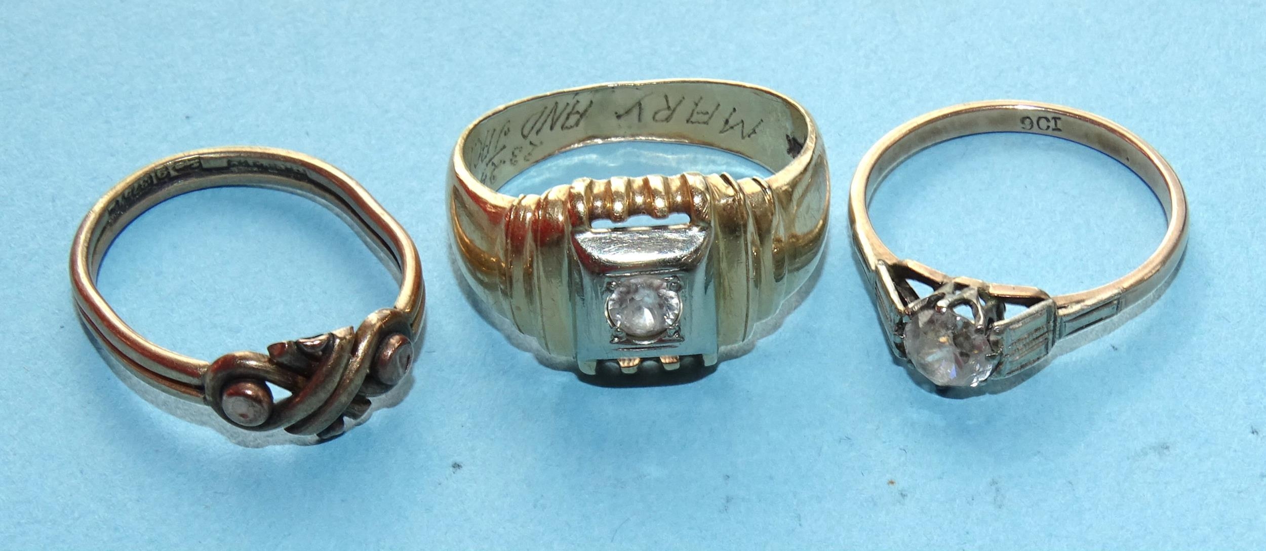 Three 9ct gold rings, two set synthetic white stones, 7.5g.
