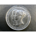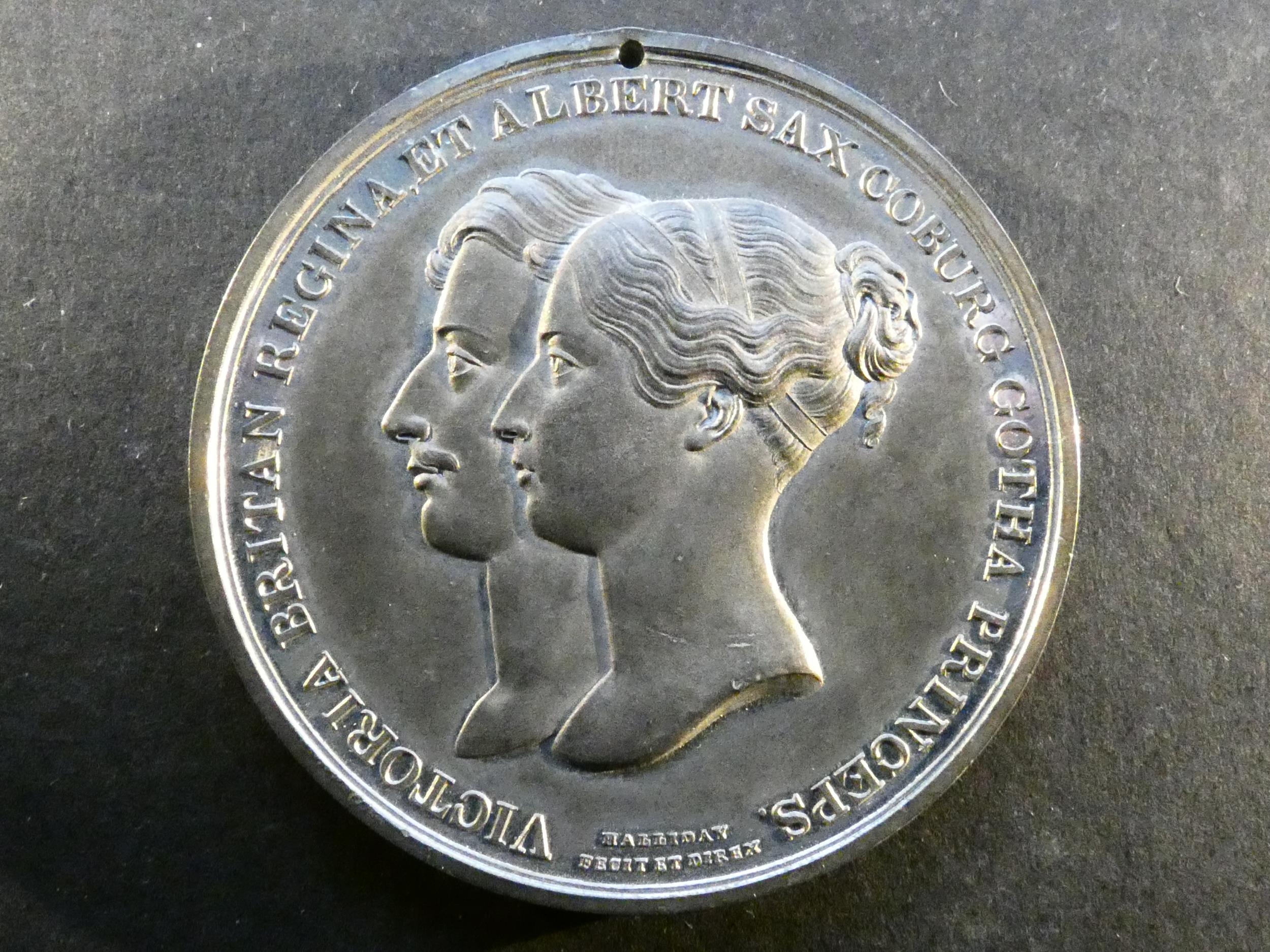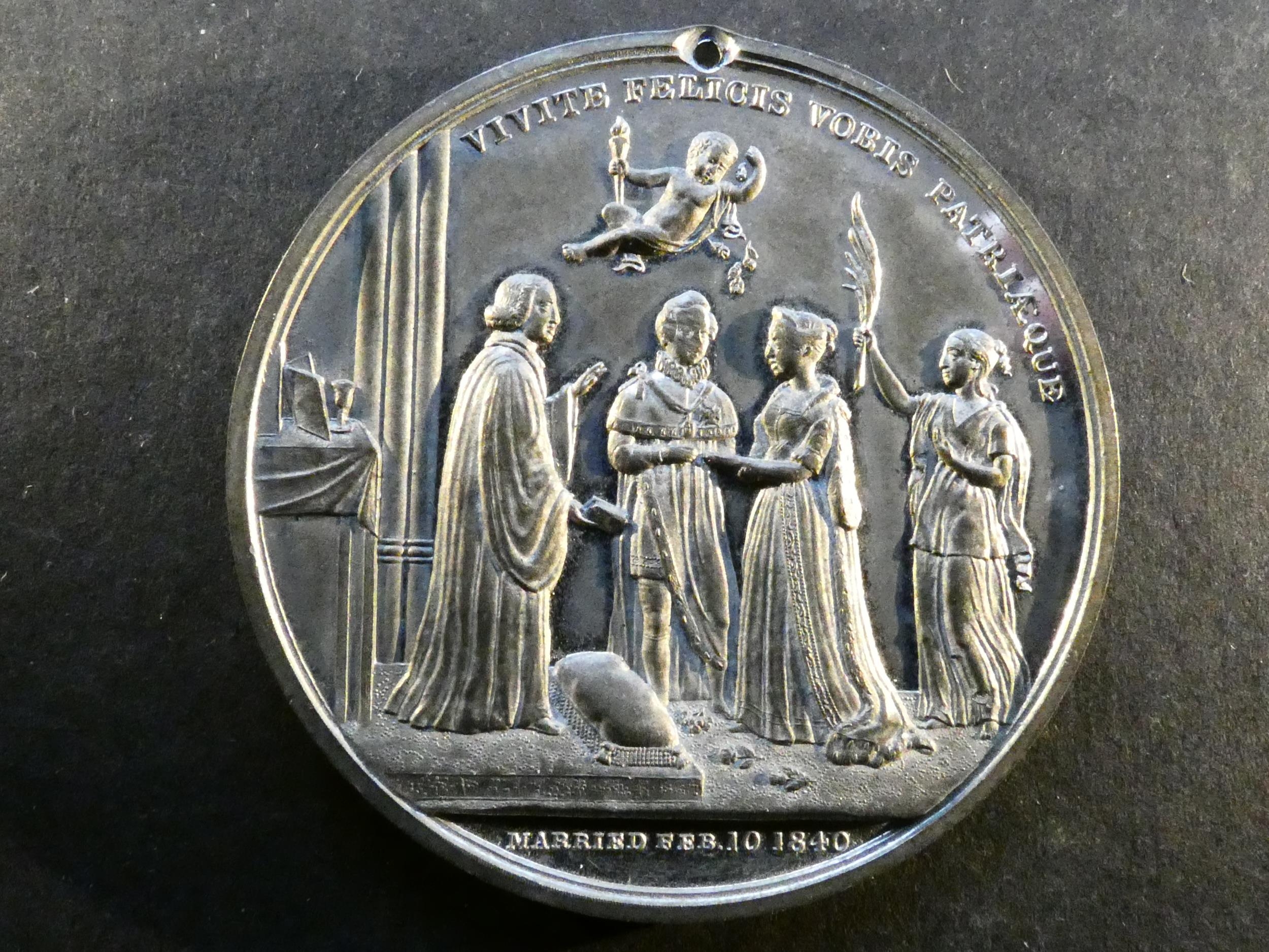 MEDALLIONS - ROYALTY. 1840, Marriage of Victoria & Albert, obverse; VICTORIA BRITAN REGINA ET ALBERT SAX COBURG GOTHA PRINCEP, conjoined busts left, by Halliday, reverse; VIVITE FELICIS VOBIS PATRIAEQUE, Prince Albert & Queen Victoria before the altar & Archbishop, a cherub above, Peace to right, in exergue; MARRIED FEB. 10. 1840, 54mm, whitemetal, BHM-1910 ("RRR" extremely rare), EF, pierced for suspension.