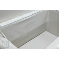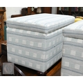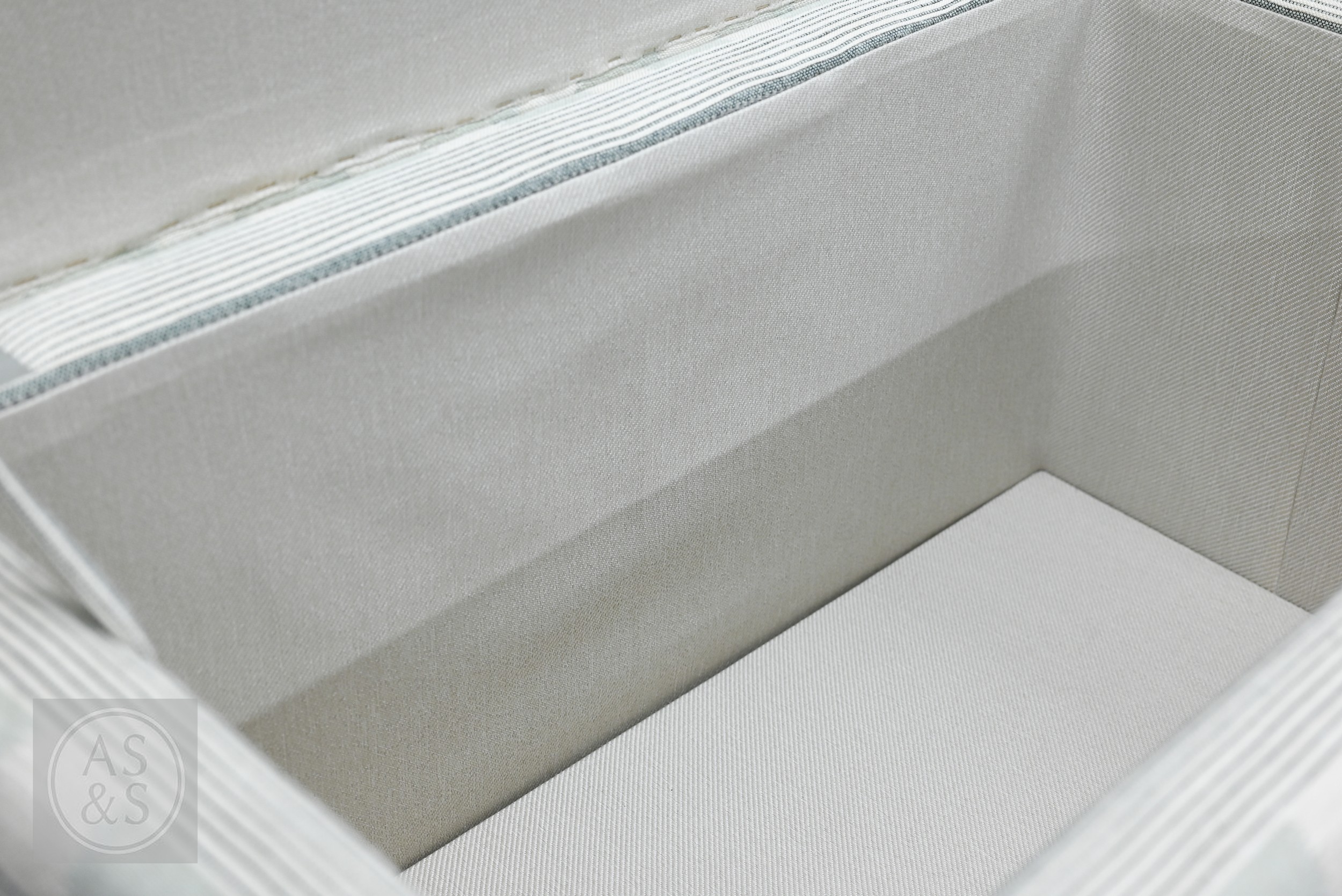 A modern box seated ottoman stool upholstered in soft blue, green and cream panel stripe woven fabric on hardwood bun feet, 80 x 50 x 52 cm h