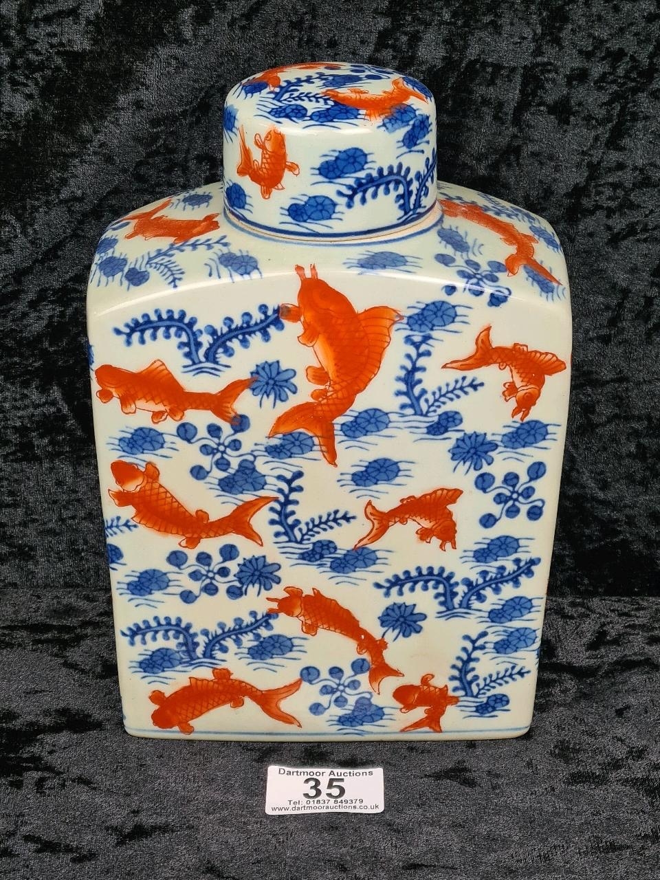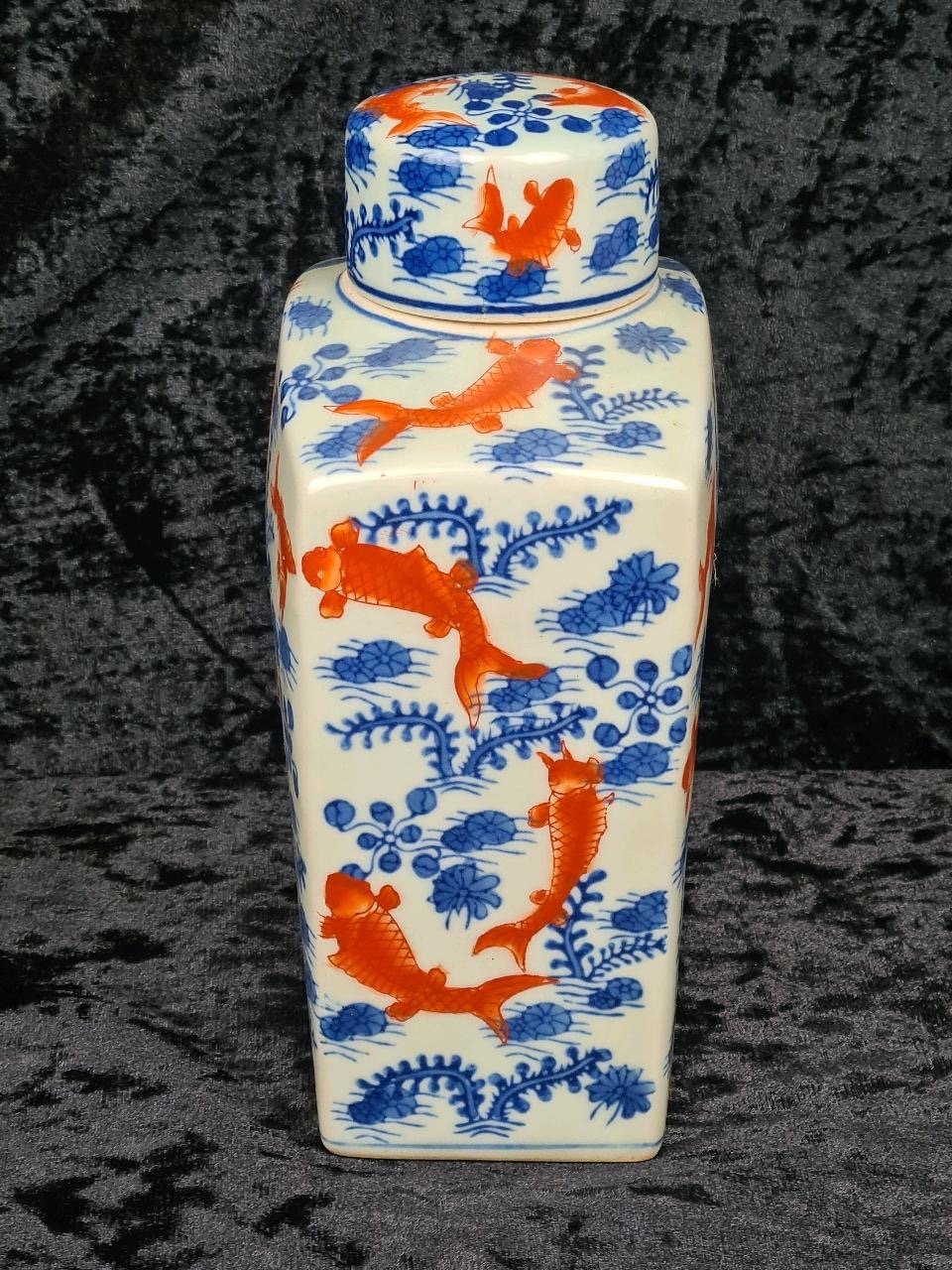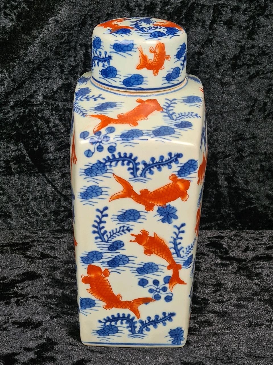 Vibrant traditional Chinese oriental ginger jar or tea caddy, featuring a wucai-style design of gold koi fish, blue seaweed, and orange accents on a stoneware body. Just stunning. Approx H22cm.