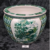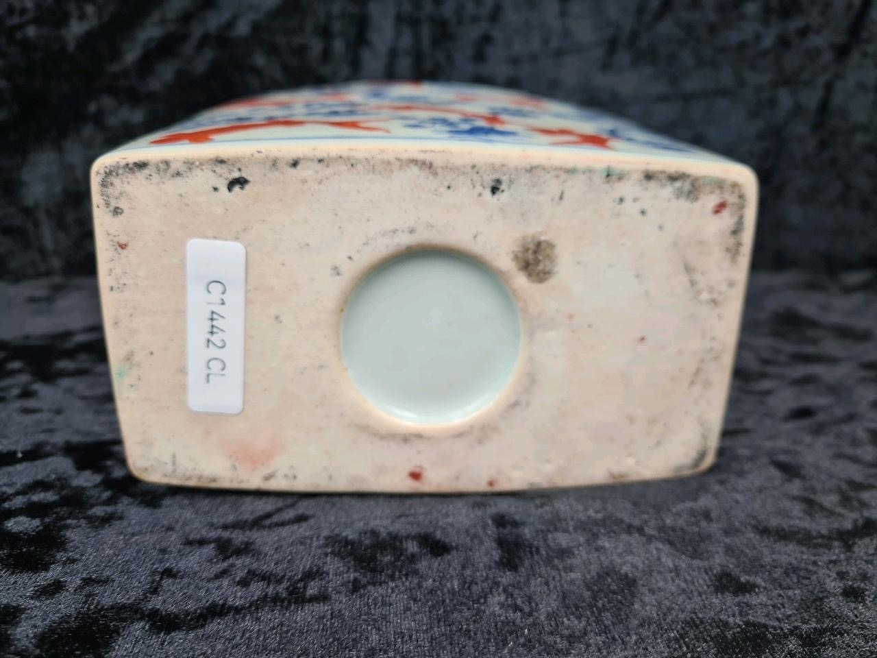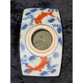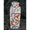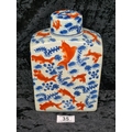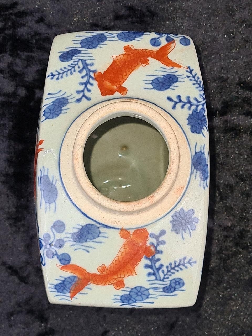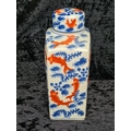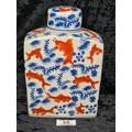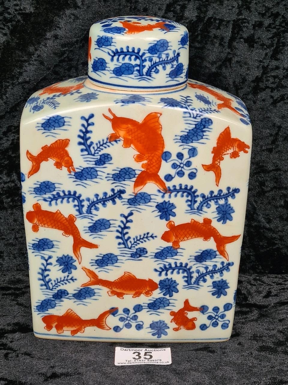 Vibrant traditional Chinese oriental ginger jar or tea caddy, featuring a wucai-style design of gold koi fish, blue seaweed, and orange accents on a stoneware body. Just stunning. Approx H22cm.