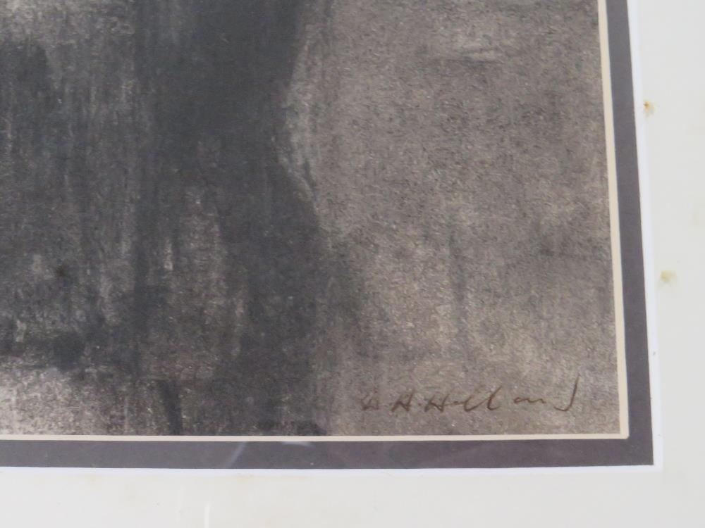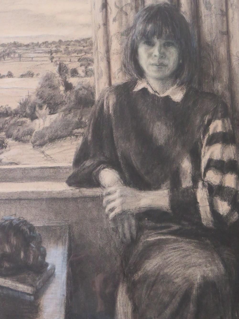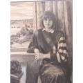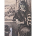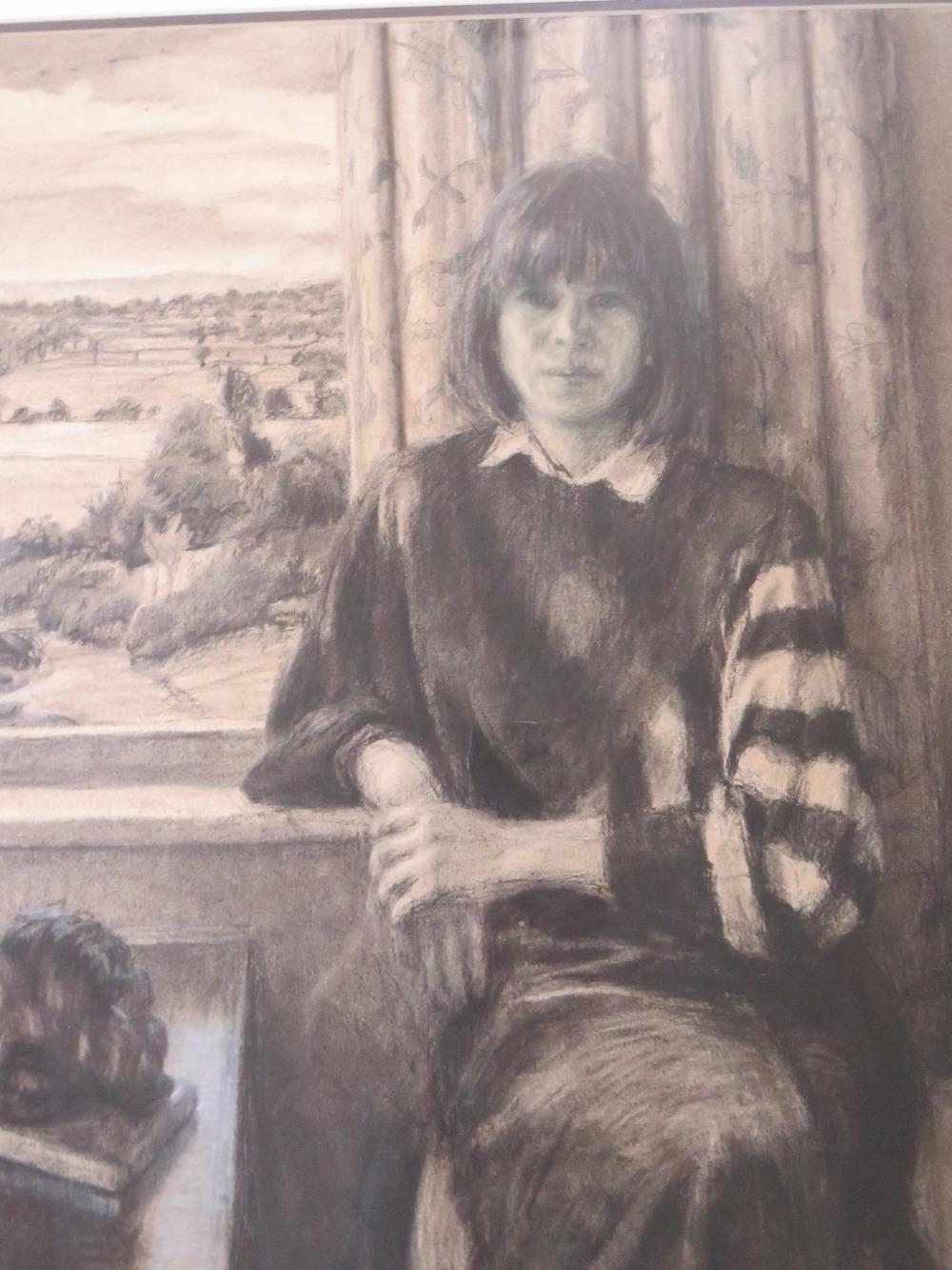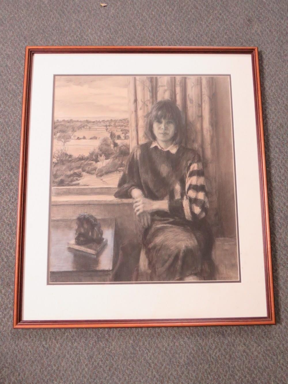 A 20TH CENTURY INTERIOR SCENE, with seated young woman before a window, landscape beyond, indistinctly signed lower right, pencil & charcoal on paper, framed and glazed, 58 x 57 cm
