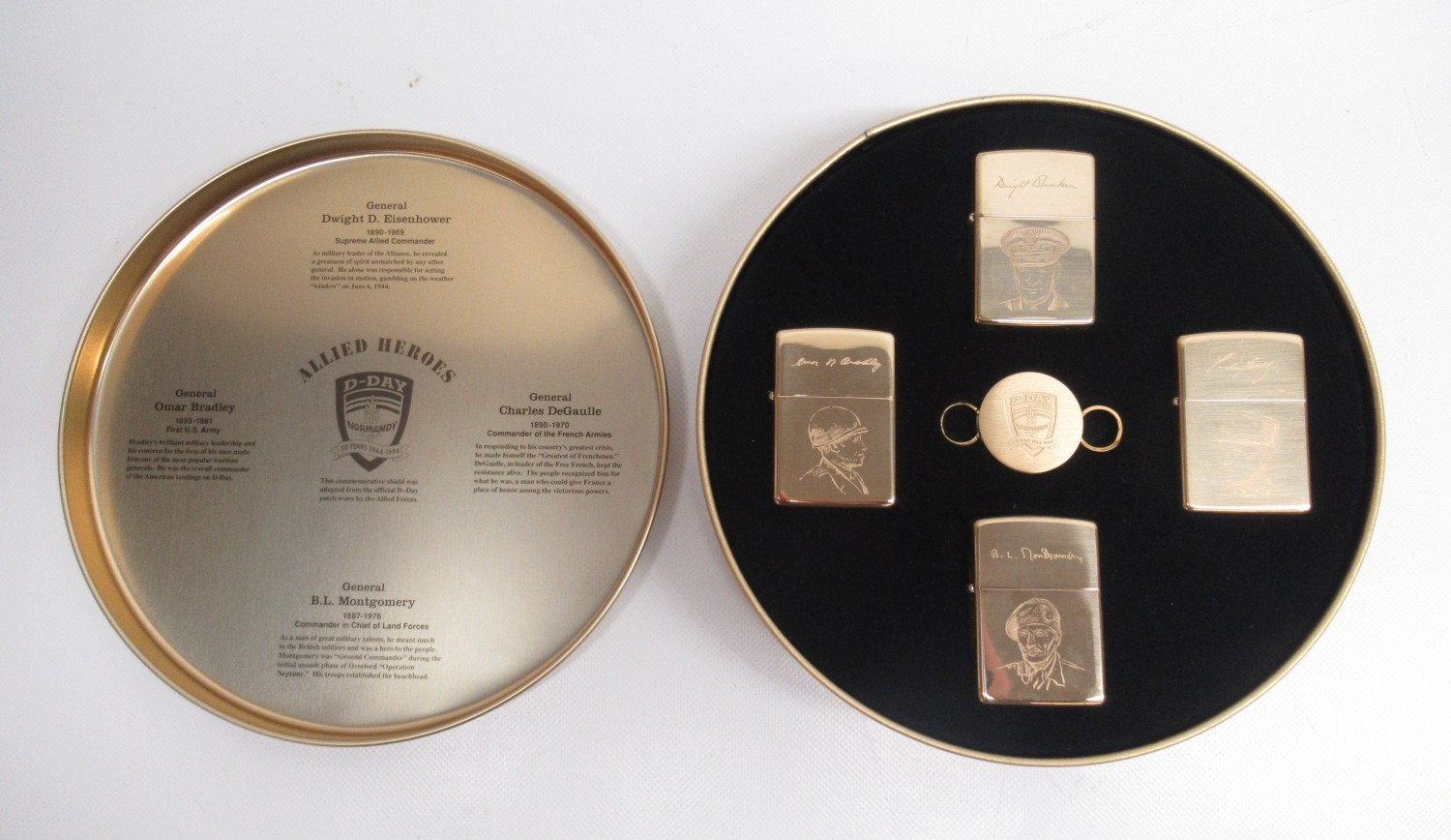 Zippo 'D-Day Normandy, 50 Years 1944-1994, Allied Heroes Collectors Edition', set of four brass lighters, and key ring in presentation tin with outer sleeve