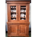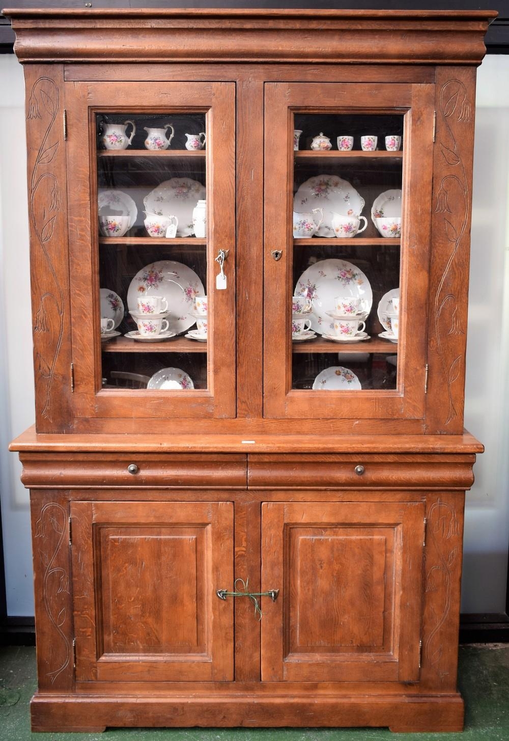 A substantial 20th century oak bookcase, outswept cornice above a pair of glazed doors enclosing three adjustable shelves, the protruding base with two short drawers above a pair of raised and fielded panel doors enclosing a shelf, shield shaped escutcheons, skirted base, 218cm high