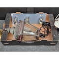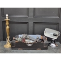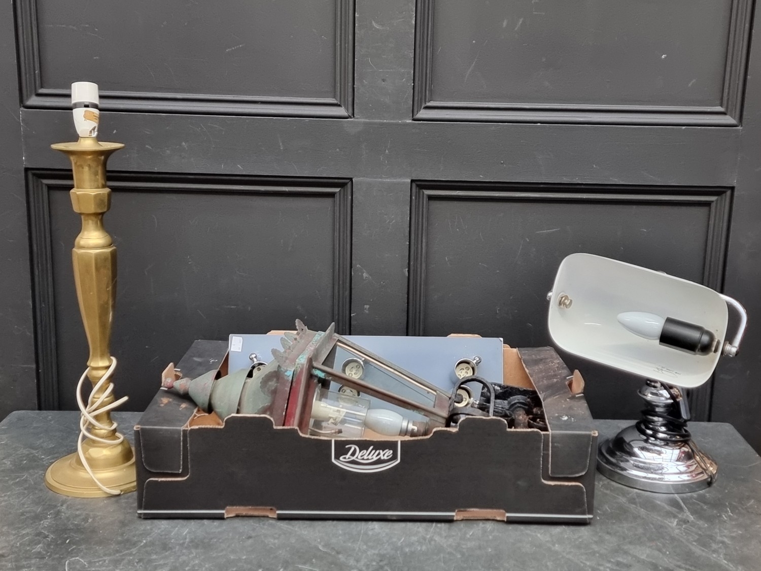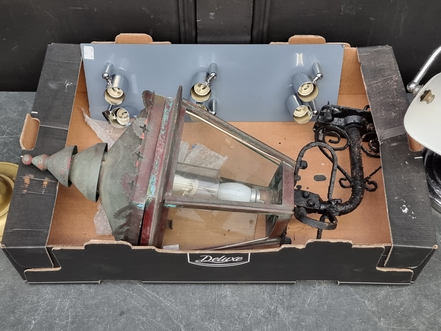 A patinated brass wall lantern, approx 57cm high; together with three other lamps. (4)