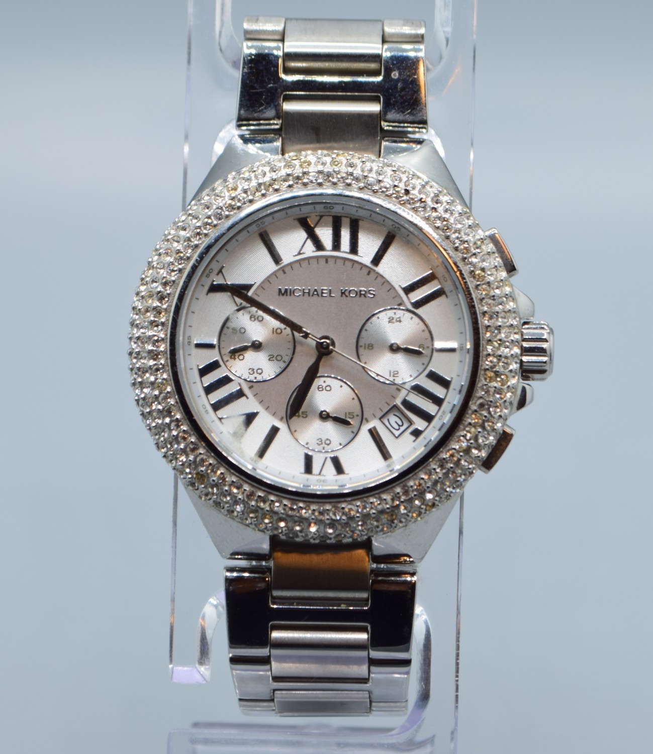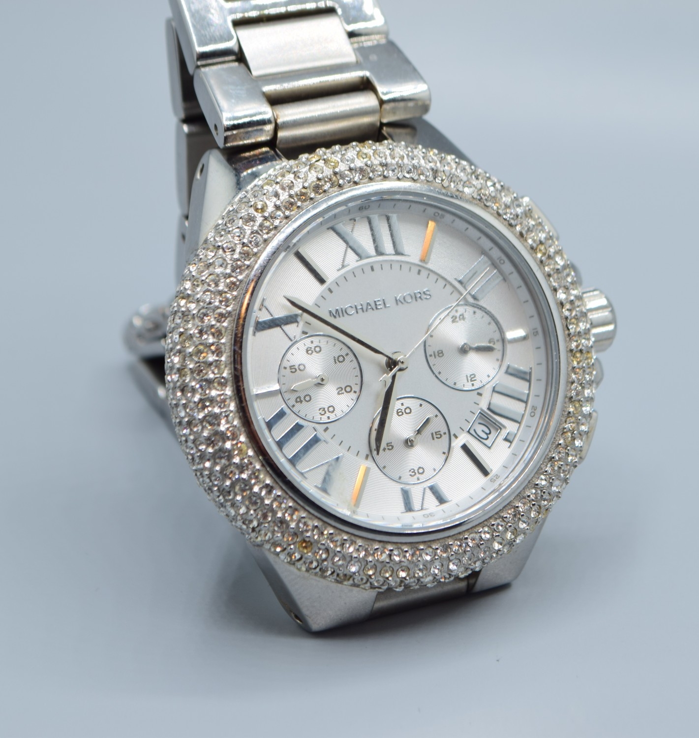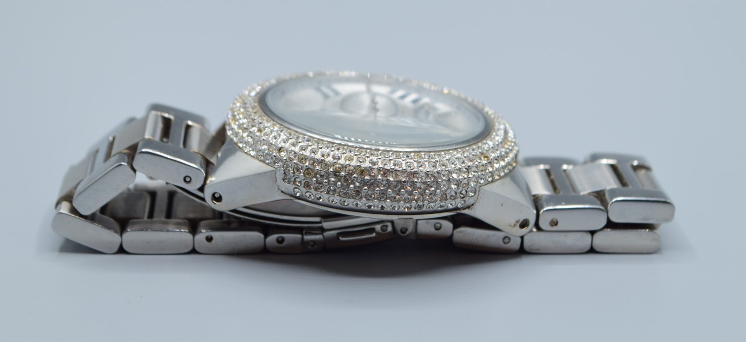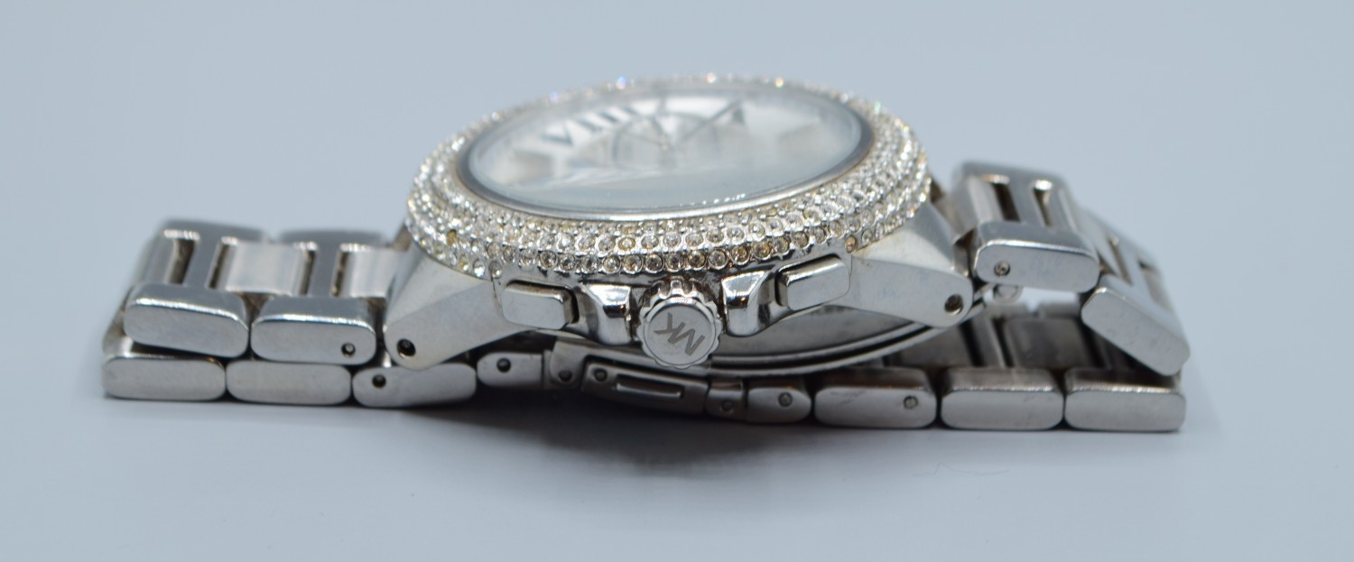 Gents Michael Kors fashion watch with subsidiary dials and sweep second hand on a stainless steel strap with clear gem set bezel working when catalogued
