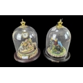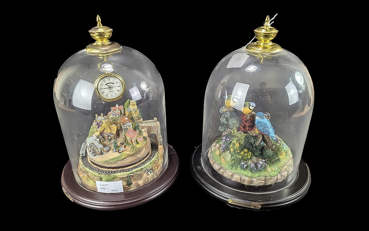 Bradford Editions 'The Romance of Steam' Flying Scotsman Village Clock, figural model of Flying Scotsman battery operated moving train, on a wooden bases with a glass dome and a hanging pocket watch in working order. Together with a Bradford Editions 'Treasures of the Morning' battery operated figural scene of birds, when switched on revolves and bird song plays. Wooden base, glass dome, hanging pocket watch in working order.