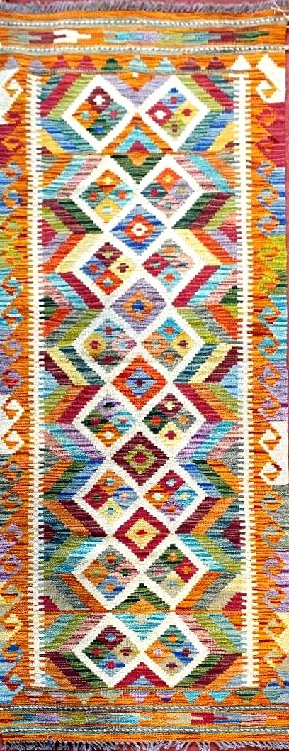 A Khobi Kelim runner with overall multicoloured geometric pattern, 201 x 63cm
