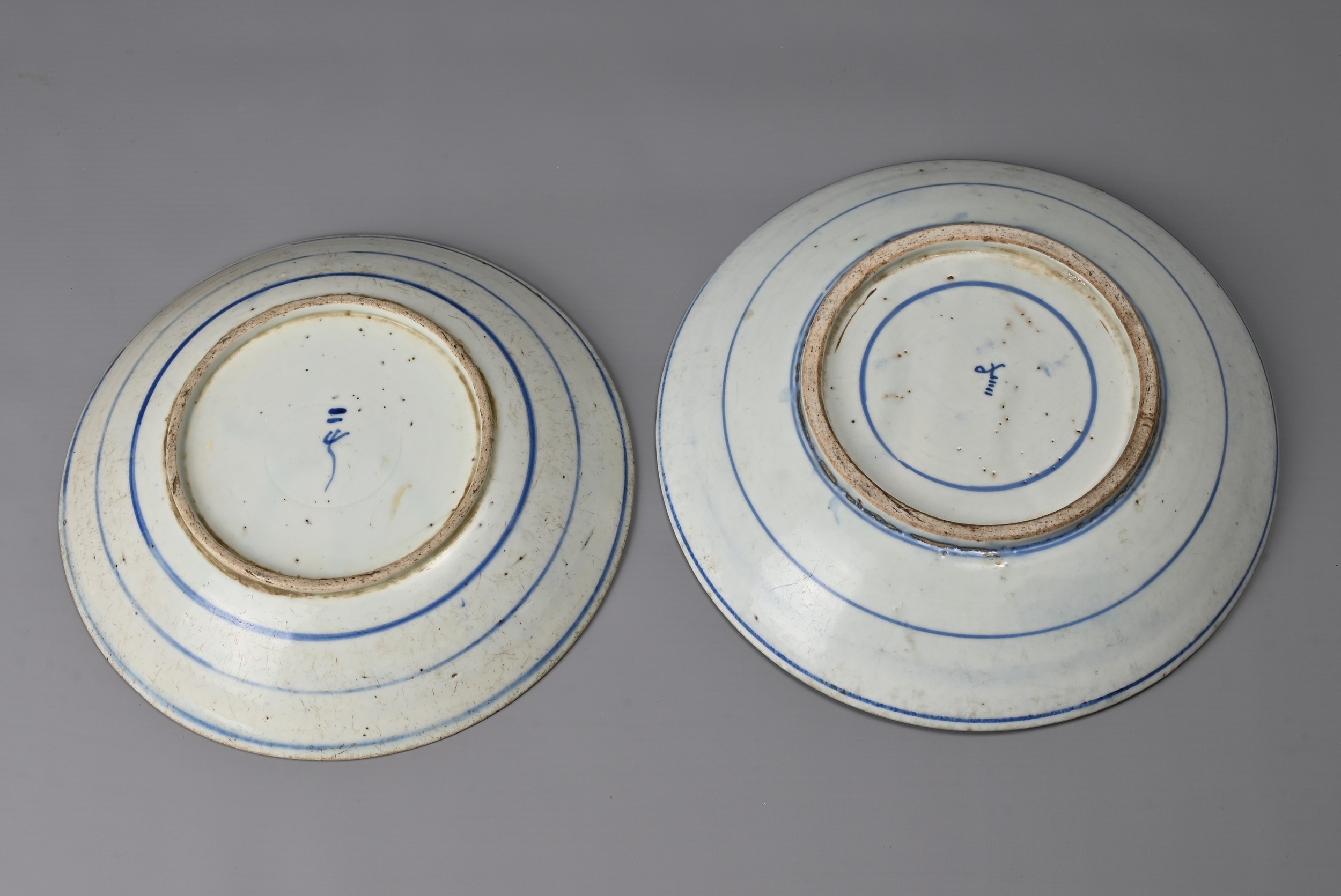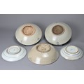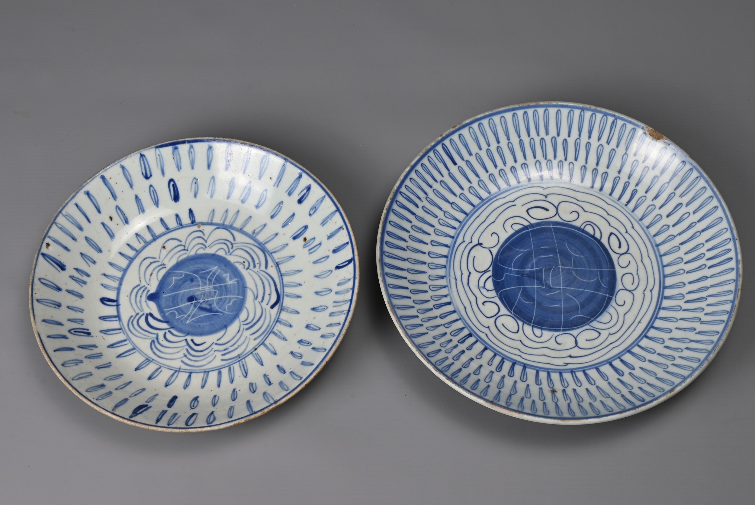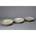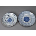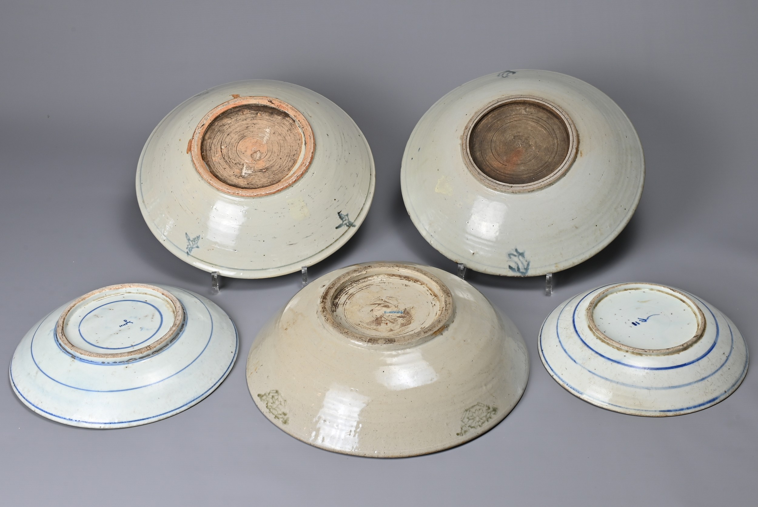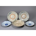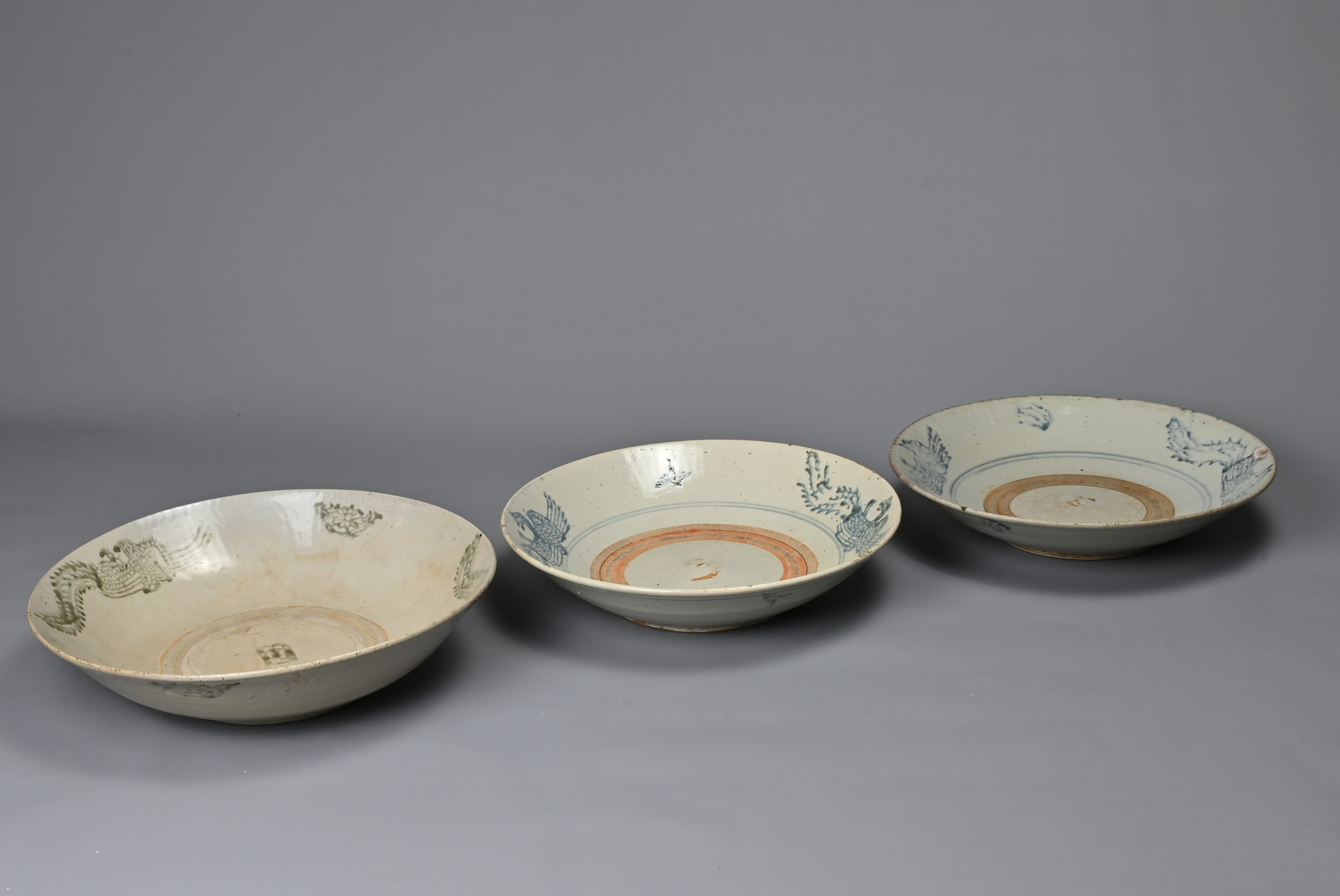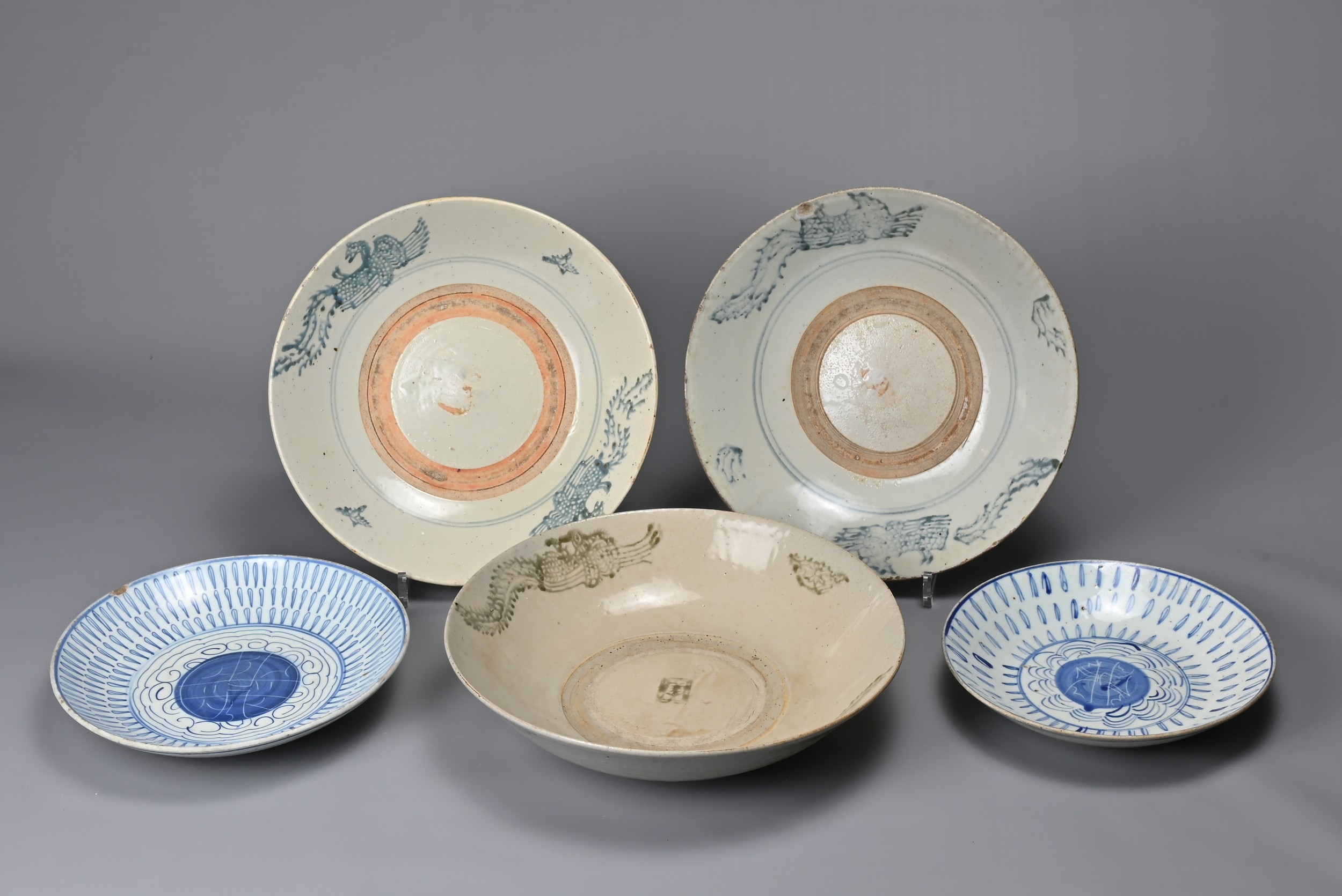 FIVE CHINESE BLUE AND WHITE PORCELAIN ITEMS, 19TH CENTURY. Three larger shallow bowls decorated with phoenix in flight; Together with two other dishes decorated with continuous stylised Shou characters. Approx. 22cm - 30cm diam. (5)
