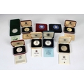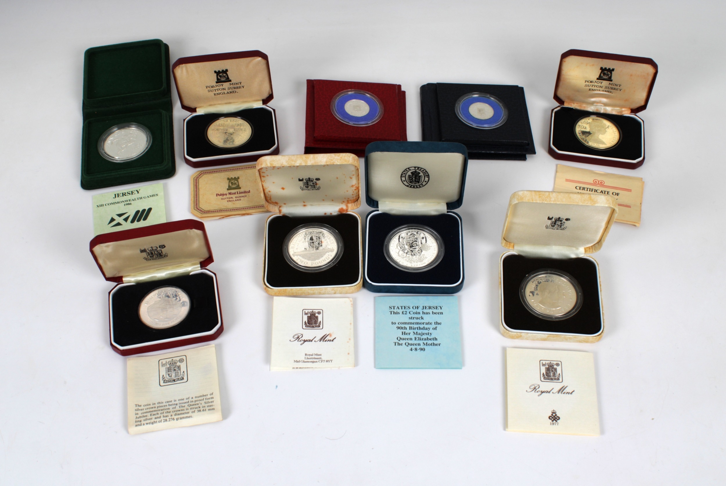 A collection of various boxed commemorative silver coins 90th Queen Mother Two Pound; two 1976 Washington Crowns, H.M. Queen Elizabeth II visit to the United States; Jersey 1981 Royal marriage, His Royal Highness and Lady Diana Spencer; Jersey 40th Anniversary of Liberation; Queen's silver Jubilee Jersey Crown; Jersey 1986 Commonwealth Game Two Pound; Jersey St Brelade One Pound; Jersey St Helier One Pound. (9)