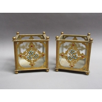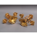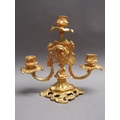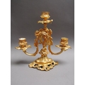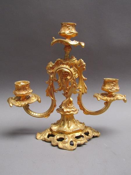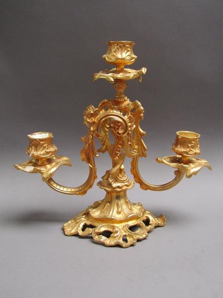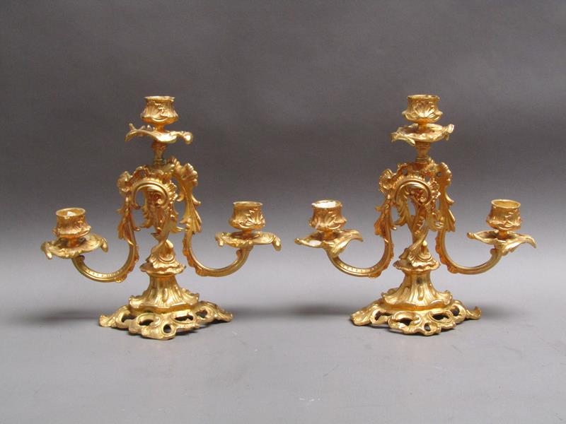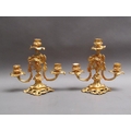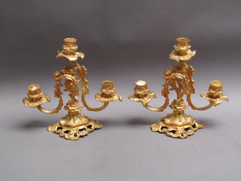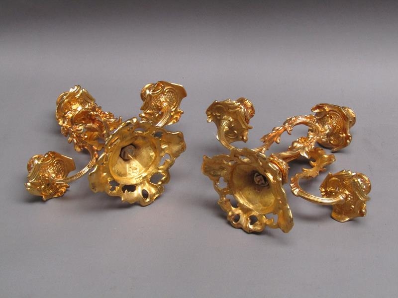 A pair of 19c gilt metal two branch rococo style candelabrum with impressed marks 'EM 23', 24cm w, 25cm h.