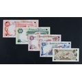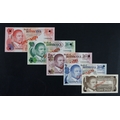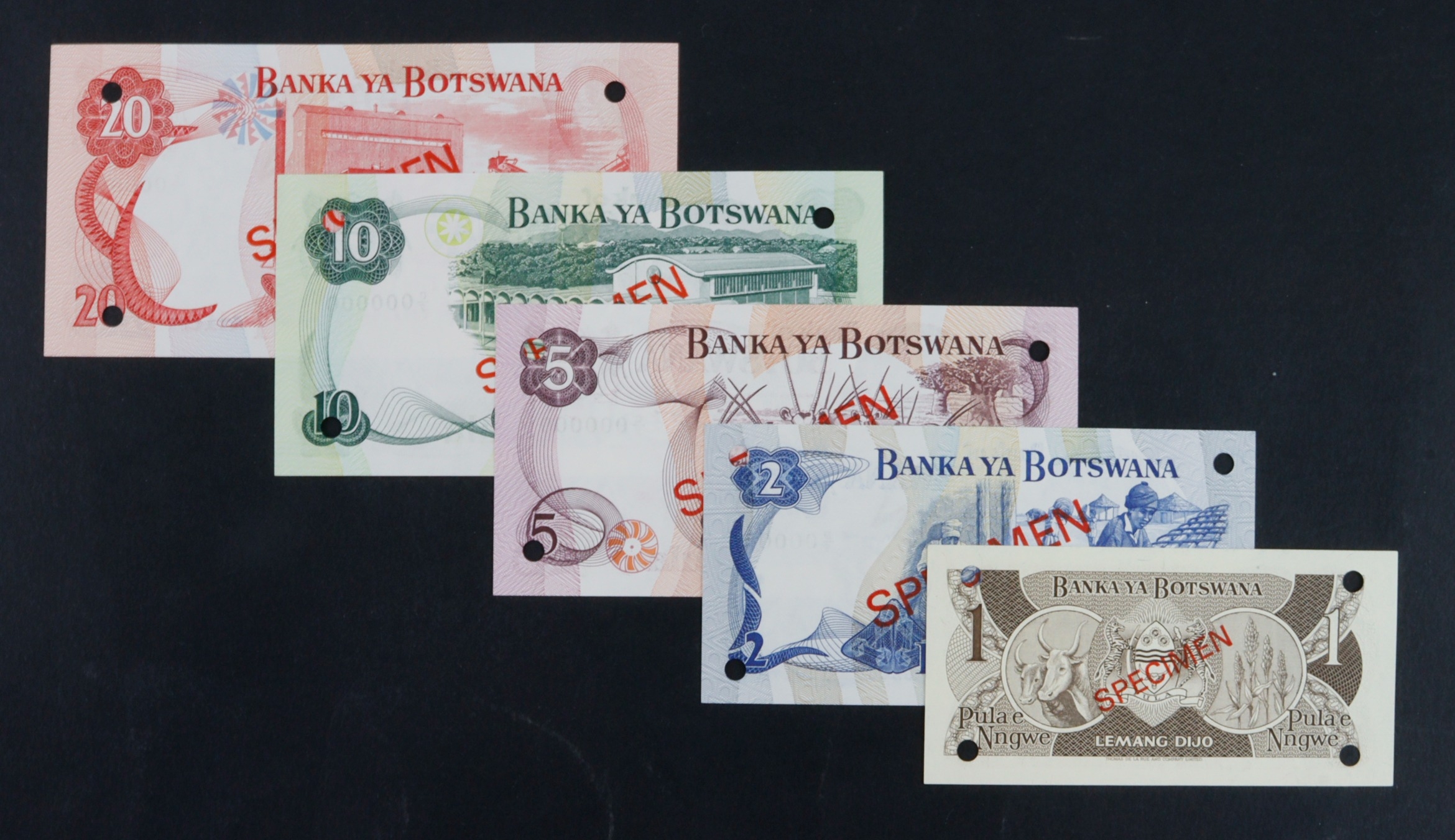 Botswana 1 Pula, 2 Pula, 5 Pula, 10 Pula, 20 Pula issued 1982/1983, a set of SPECIMEN notes with small hole punched through each corner, diagonal overprint 'SPECIMEN' in red on both sides, all zero's serial numbers (BNB B106as - B110as, Pick6s - 10s) Uncirculated or about
