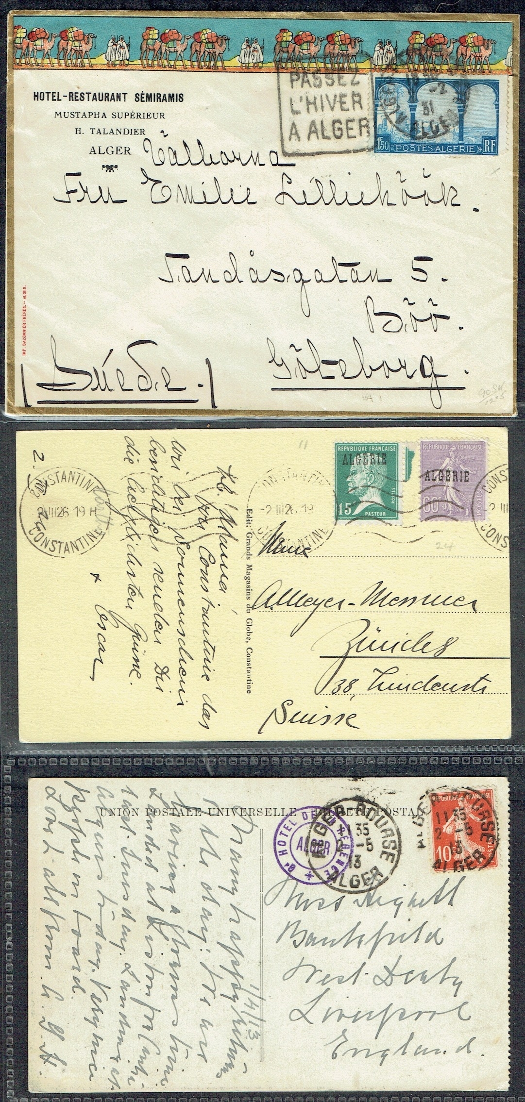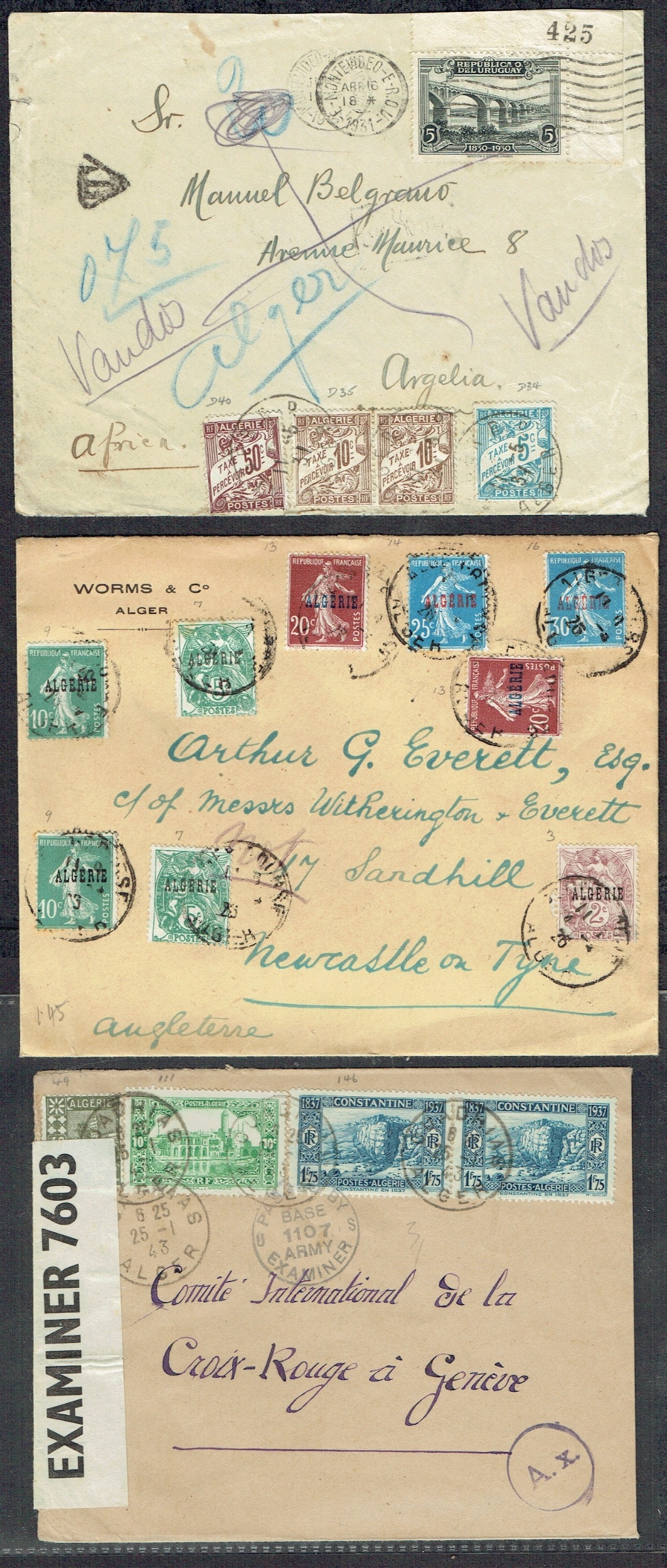 ALGERIA - Group of Covers (7) mainly 1920s-1949 noted WWII censor, 1931 colour illus Hotel env., 1926 multi franked nine Algerie defins, 1931 Uruguay to Algeria with postage due combination, 1949 Oran fine wines illus postcard, 1913 PPC with French 10c Sower tied GER BOUSE ALGER cds. (7).