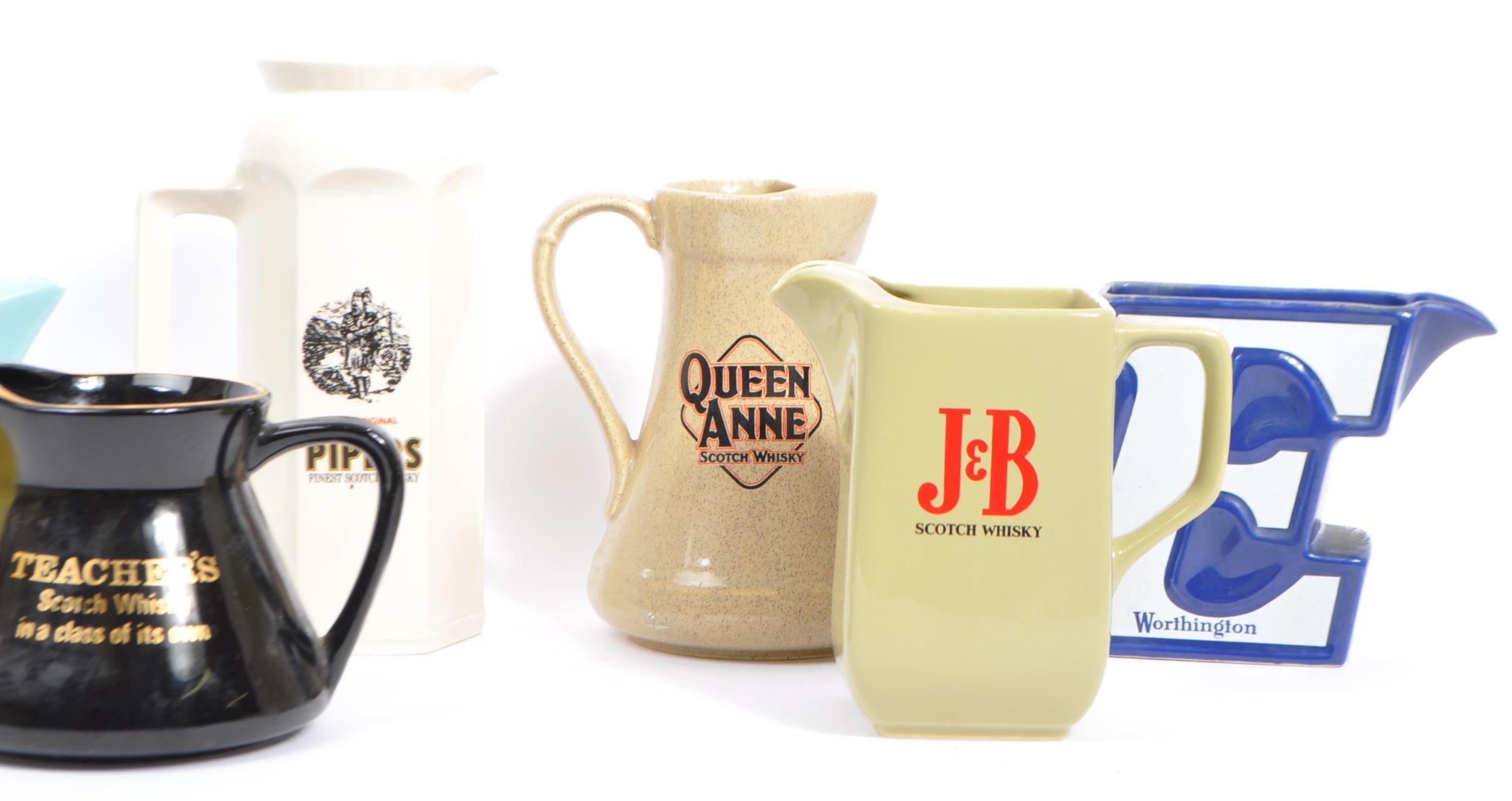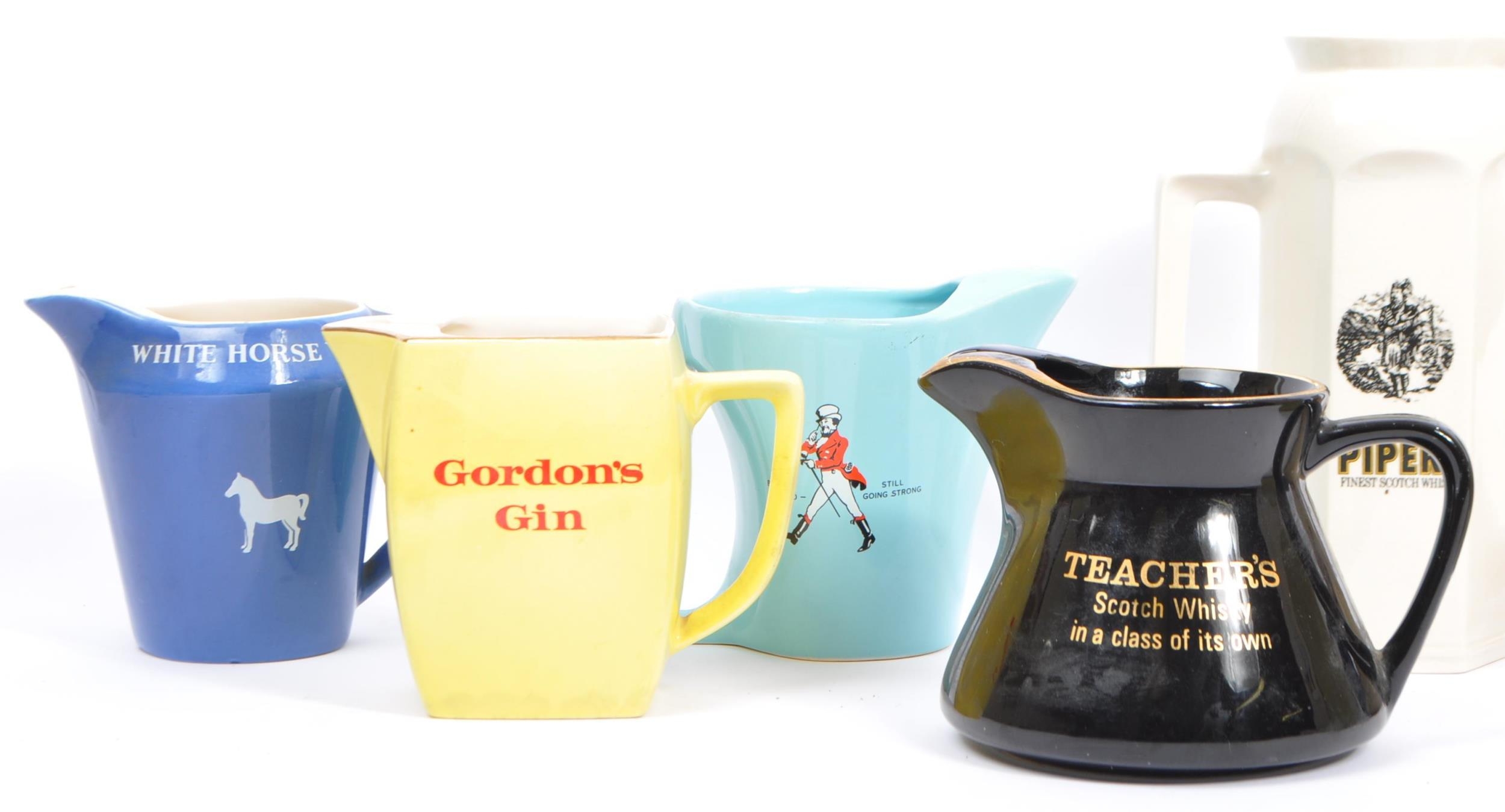 Breweriana - A large collection of vintage mid 20th century advertising whisky / water jugs to include Teachers, J&B, Johnnie Walker, White Horse, Queen Anne, Hundred Pipers, Worthington & Gordons Gin. All Jugs listed by Wade & Carlton Ware. Largest measures 22.5cm (height).