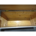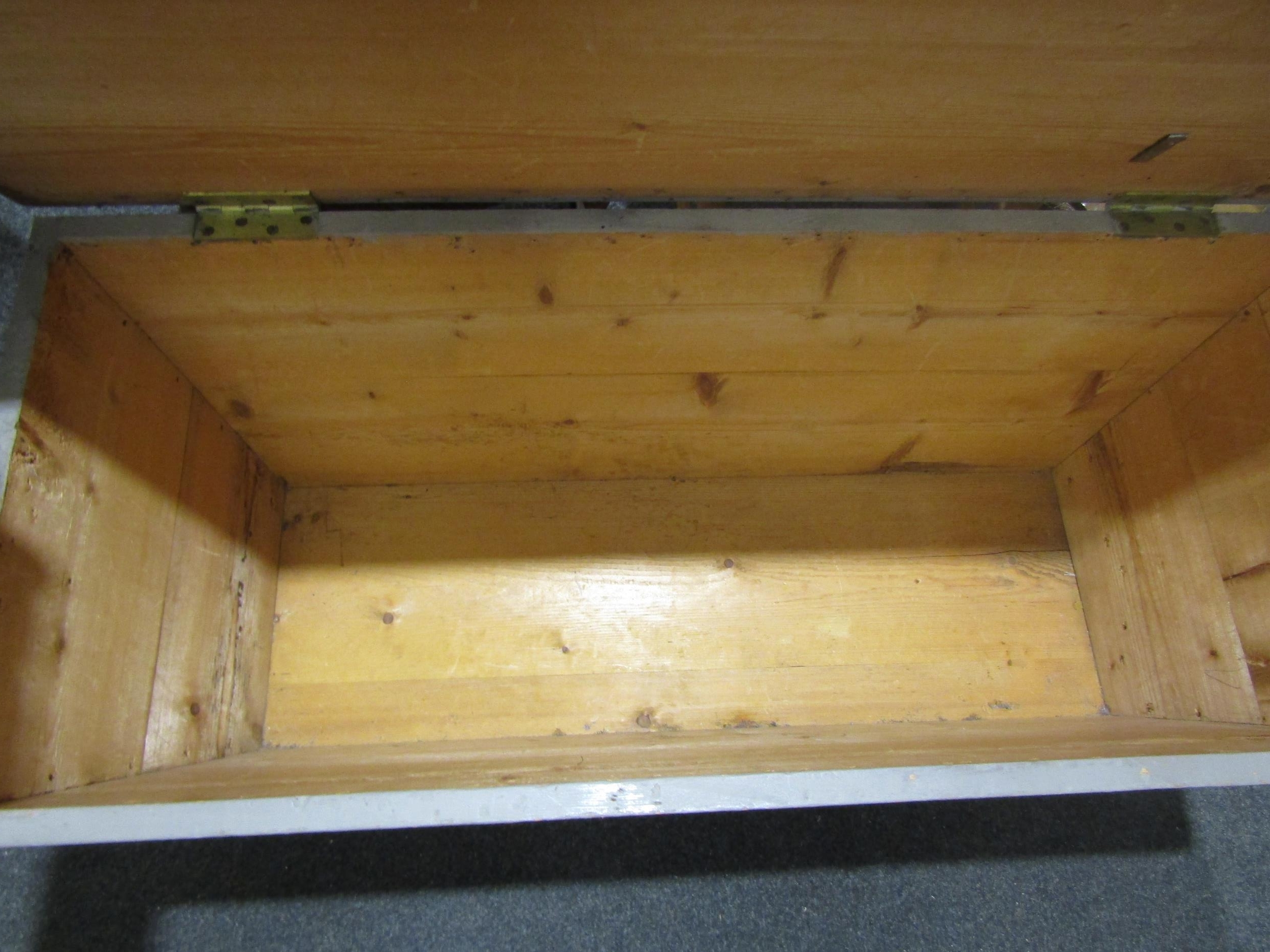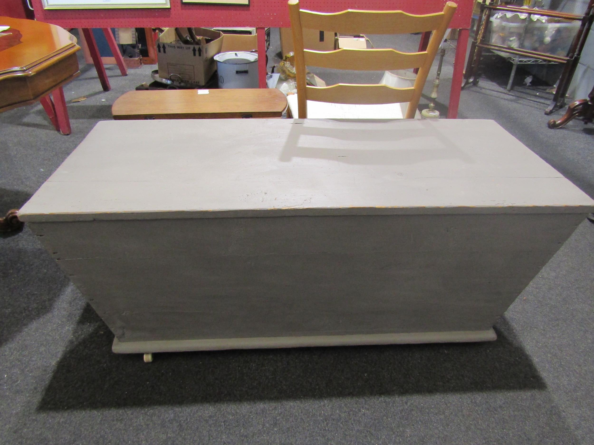 A Victorian painted pine chest of tapering form on white ceramic castors with iron carrying handles, 54cm tall x 121cm wide x 52cm deep